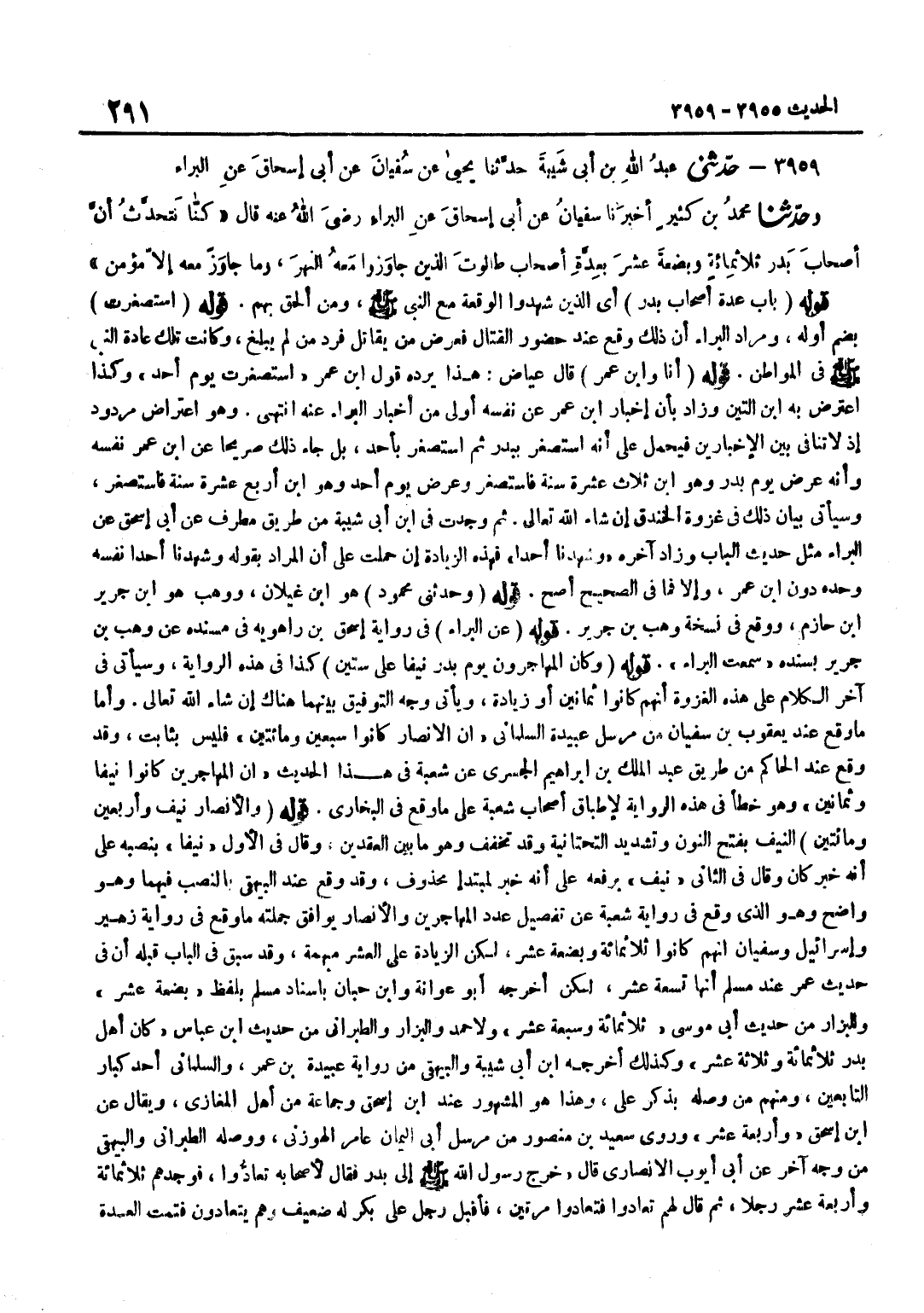 أَيِ الَّذِينَ شَهِدُوا الْوَقْعَةَ مَعَ النَّبِيِّ صَلَّى اللَّهُ عَلَيْهِ وَسَلَّمَ وَمَنْ أُلْحِقَ بِهِمْ قَوْلُهُ اسْتُصْغِرْتُ بِضَمِّ أَوَّلِهِ وَمُرَادُ الْبَرَاءِ أَنَّ ذَلِكَ وَقَعَ عِنْدَ حُضُورِ الْقِتَالِ فَعُرِضَ مَنْ يُقَاتِلُ فَرُدَّ مَنْ لَمْ يَبْلُغْ وَكَانَتْ تِلْكَ عَادَةَ النَّبِيِّ صَلَّى اللَّهُ عَلَيْهِ وَسَلَّمَ فِي الْمَوَاطِنِ قَوْلُهُ أَنَا وبن عمر قَالَ عِيَاض هَذَا يردهُ قَول بن عُمَرَ اسْتُصْغِرْتُ يَوْمَ أُحُدٍ وَكَذَا اعْتَرَضَ بِهِ بن التِّين وَزَاد بِأَن إِخْبَار بن عُمَرَ عَنْ نَفْسِهِ أَوْلَى مِنْ إِخْبَارِ الْبَرَاءِ عَنْهُ انْتَهَى وَهُوَ اعْتِرَاضٌ مَرْدُودٌ إِذْ لَا تَنَافِيَ بَيْنَ الْإِخْبَارَيْنِ فَيُحْمَلُ عَلَى أَنَّهُ اسْتُصْغِرَ بِبَدْرٍ ثُمَّ اسْتُصْغِرَ بِأُحُدٍ بَلْ جَاءَ ذَلِكَ صَرِيحًا عَن بن عُمَرَ نَفْسِهِ وَأَنَّهُ عُرِضَ يَوْمَ بَدْرٍ وَهُوَ بن ثَلَاثَ عَشْرَةَ سَنَةً فَاسْتُصْغِرَ وَعُرِضَ يَوْمَ أُحُدٍ وَهُوَ بن أَرْبَعَ عَشْرَةَ سَنَةً فَاسْتُصْغِرَ وَسَيَأْتِي بَيَانُ ذَلِكَ فِي غَزْوَةِ الْخَنْدَقِ إِنْ شَاءَ اللَّهُ تَعَالَى ثُمَّ وَجَدْتُ فِي بن أَبِي شَيْبَةَ مِنْ طَرِيقِ مُطَرِّفٍ عَنْ أَبِي إِسْحَاقَ عَنِ الْبَرَاءِ مِثْلَ حَدِيثِ الْبَابِ وَزَادَ آخِرَهُ وَشَهِدْنَا أُحُدًا فَهَذِهِ الزِّيَادَةُ إِنْ حُمِلَتْ عَلَى أَنَّ الْمُرَادَ بِقَوْلِهِ وَشَهِدْنَا أُحُدًا نَفْسَهُ وَحده دون بن عُمَرَ وَإِلَّا فَمَا فِي الصَّحِيحِ أَصَحُّ قَوْلُهُ وحَدثني مَحْمُود هُوَ بن غيلَان ووهب هُوَ بن جَرِيرِ بْنِ حَازِمٍ وَوَقَعَ فِي نُسْخَةِ وَهْبُ بْنُ جَرِيرٍ قَوْلُهُ عَنِ الْبَرَاءِ فِي رِوَايَةِ إِسْحَاقَ بْنِ رَاهَوَيْهِ فِي مُسْنَدِهِ عَنْ وَهْبِ بْنِ جَرِيرٍ بِسَنَدِهِ سَمِعْتُ الْبَرَاءَ قَوْلُهُ وَكَانَ الْمُهَاجِرُونَ يَوْمَ بَدْرٍ نَيِّفًا عَلَى سِتِّينَ كَذَا فِي هَذِهِ الرِّوَايَةِ وَسَيَأْتِي فِي آخِرِ الْكَلَامِ عَلَى هَذِهِ الْغَزْوَةِ أَنَّهُمْ كَانُوا ثَمَانِينَ أَوْ زِيَادَةً وَيَأْتِي وَجْهُ التَّوْفِيقِ بَيْنَهُمَا هُنَاكَ إِنْ شَاءَ اللَّهُ تَعَالَى وَأَمَّا مَا وَقَعَ عِنْدَ يَعْقُوبَ بْنِ سُفْيَانَ مِنْ مُرْسَلِ عَبِيدَةَ السَّلْمَانِيِّ أَنَّ الْأَنْصَارَ كَانُوا سَبْعِينَ وَمِائَتَيْنِ فَلَيْسَ بِثَابِتٍ وَقَدْ وَقَعَ عِنْدَ الْحَاكِمِ مِنْ طَرِيقِ عَبْدِ الْمَلِكِ بْنِ إِبْرَاهِيمَ الْجَسْرِيِّ عَنْ شُعْبَةَ فِي هَذَا الْحَدِيثِ أَنَّ الْمُهَاجِرِينَ كَانُوا نَيِّفًا وَثَمَانِينَ وَهُوَ خَطَأٌ فِي هَذِهِ الرِّوَايَةِ لِإِطْبَاقِ أَصْحَابِ شُعْبَةَ عَلَى مَا وَقَعَ فِي الْبُخَارِيِّ قَوْلُهُ وَالْأَنْصَارُ نَيِّفٌ وَأَرْبَعِينَ وَمِائَتَيْنِ النَّيِّفُ بِفَتْحِ النُّونِ وَتَشْدِيدِ التَّحْتَانِيَّةِ وَقَدْ تُخَفَّفُ وَهُوَ مَا بَيْنَ الْعِقْدَيْنِ وَقَالَ فِي الْأَوَّلِ نَيِّفًا بِنَصْبِهِ عَلَى أَنَّهُ خَبَرُ كَانَ وَقَالَ فِي الثَّانِي نَيِّفٌ بِرَفْعِهِ عَلَى أَنَّهُ خَبَرٌ لِمُبْتَدَأٍ مَحْذُوفٍ وَقَدْ وَقَعَ عِنْدَ الْبَيْهَقِيِّ بِالنَّصْبِ فِيهِمَا وَهُوَ وَاضِحٌ وَهُوَ الَّذِي وَقَعَ فِي رِوَايَةِ شُعْبَةَ عَنْ تَفْصِيلِ عَدَدِ الْمُهَاجِرِينَ وَالْأَنْصَارِ يُوَافِقُ جُمْلَتُهُ مَا وَقَعَ فِي رِوَايَةِ زُهَيْرٍ وَإِسْرَائِيلَ وَسُفْيَانَ أَنَّهُمْ كَانُوا ثَلَاثَمِائَةٍ وَبِضْعَةَ عَشَرَ لَكِنَّ الزِّيَادَةَ عَلَى الْعَشْرِ مُبْهَمَةٌ وَقَدْ سَبَقَ فِي الْبَابِ قَبْلَهُ أَنَّ فِي حَدِيثِ عُمَرَ عِنْدَ مُسْلِمٍ أَنَّهَا تِسْعَة عشر لَكِن أخرجه أَبُو عوَانَة وبن حِبَّانَ بِإِسْنَادِ مُسْلِمٍ بِلَفْظِ بِضْعَةَ عَشَرَ وَلِلْبَزَّارِ مِنْ حَدِيثِ أَبِي مُوسَى ث