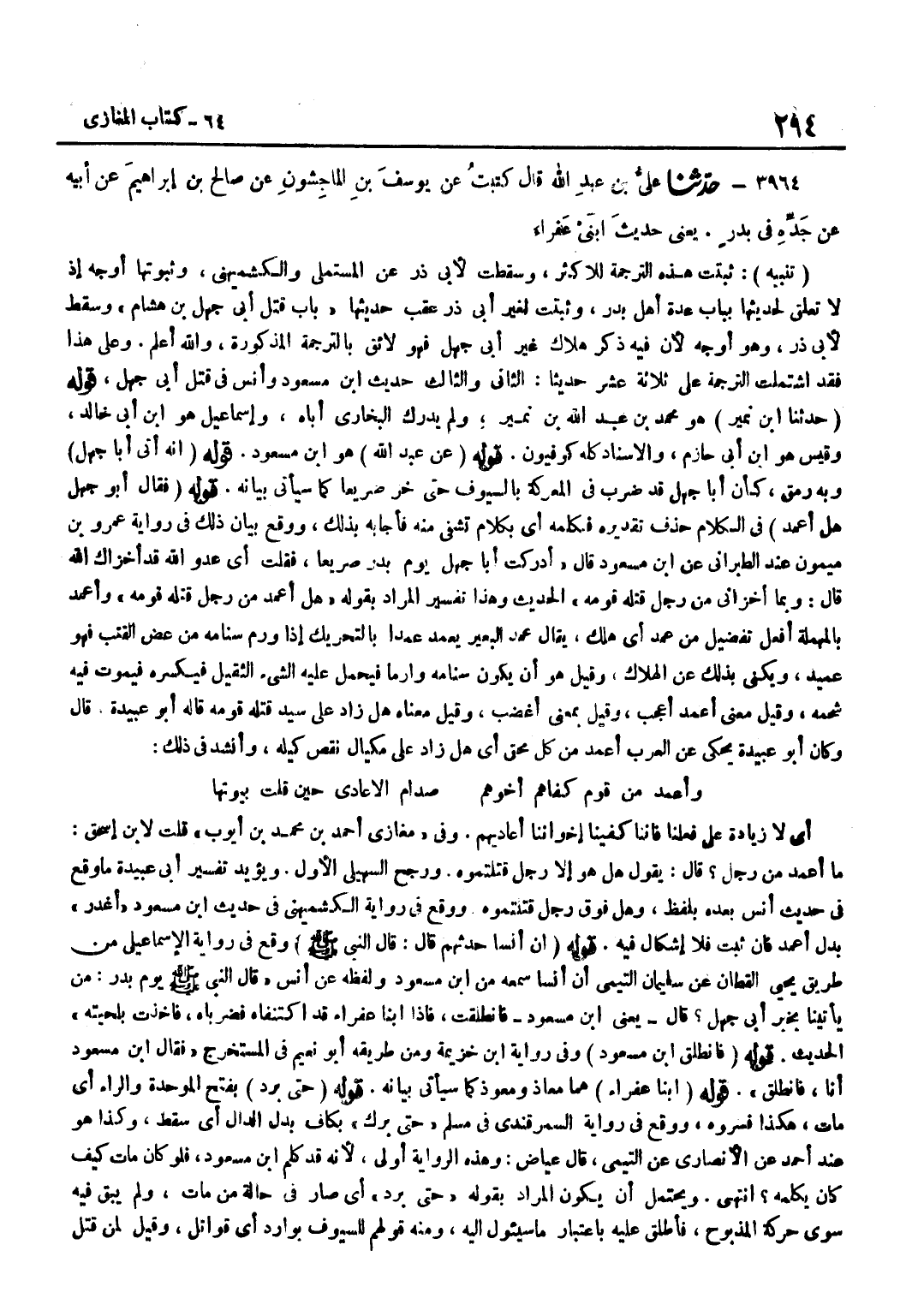 [3961] قَوْلُهُ حَدثنَا بن نمير هُوَ مُحَمَّد بن عبيد اللَّهِ بْنِ نُمَيْرٍ وَلَمْ يُدْرِكِ الْبُخَارِيُّ أَبَاهُ وَإِسْمَاعِيل هُوَ بن أبي خَالِد وَقيس هُوَ بن أَبِي حَازِمٍ وَالْإِسْنَادُ كُلُّهُ كُوفِيُّونَ قَوْلُهُ عَنْ عبد الله هُوَ بن مَسْعُودٍ قَوْلُهُ أَنَّهُ أَتَى أَبَا جَهْلٍ وَبِهِ رَمَقٌ كَأَنَّ أَبَا جَهْلٍ قَدْ ضُرِبَ فِي الْمَعْرَكَةِ بِالسُّيُوفِ حَتَّى خَرَّ صَرِيعًا كَمَا سَيَأْتِي بَيَانُهُ قَوْلُهُ فَقَالَ أَبُو جَهْلٍ هَلْ أَعْمَدُ فِي الْكَلَامِ حَذْفٌ تَقْدِيرُهُ فَكَلَّمَهُ أَيْ بِكَلَامٍ تَشَفَّى مِنْهُ فَأَجَابَهُ بِذَلِكَ وَوَقَعَ بَيَانُ ذَلِكَ فِي رِوَايَةِ عَمْرِو بْنِ مَيْمُونٍ عِنْدَ الطَّبَرَانِيِّ عَن بن مَسْعُودٍ قَالَ أَدْرَكْتُ أَبَا جَهْلٍ يَوْمَ بَدْرٍ صَرِيعًا فَقُلْتُ أَيْ عَدُوَّ اللَّهِ قَدْ أَخْزَاكَ اللَّهُ قَالَ وَبِمَا أَخْزَانِي مِنْ رَجُلٍ قَتَلَهُ قَوْمُهُ الْحَدِيثَ وَهَذَا تَفْسِيرُ الْمُرَادِ بِقَوْلِهِ هَلْ أَعْمَدُ مِنْ رَجُلٍ قَتَلَهُ قَوْمُهُ وَأَعْمَدُ بِالْمُهْمَلَةِ أَفْعَلُ تَفْضِيلٍ مِنْ عَمَدَ أَيْ هَلَكَ يُقَالُ عَمَدَ الْبَعِيرُ يَعْمِدُ عَمَدًا بِالتَّحْرِيكِ إِذَا وَرِمَ سَنَامُهُ مِنْ عَضِّ الْقَتَبِ فَهُوَ عَمِيدٌ وَيُكَنَّى بِذَلِكَ عَنِ الْهَلَاكِ وَقِيلَ هُوَ أَنْ يَكُونَ سَنَامُهُ وَارِمًا فَيُحْمَلُ عَلَيْهِ الشَّيْءُ الثَّقِيلُ فَيَكْسِرُهُ فَيَمُوتُ فِيهِ شَحْمُهُ وَقِيلَ مَعْنَى أَعْمَدُ أَعْجَبُ وَقِيلَ بِمَعْنَى أَغْضَبَ وَقِيلَ مَعْنَاهُ هَلْ زَادَ عَلَى سَيِّدٍ قَتَلَهُ قَوْمُهُ قَالَهُ أَبُو عُبَيْدَةَ قَالَ وَكَانَ أَبُو عُبَيْدَةَ يَحْكِي عَنِ الْعَرَبِ أَعَمَدَ مِنْ كُلِّ مُحِقٍّ أَيْ هَلْ زَادَ على مكيال نقص كَيْله وَأنْشد فِي ذَلِكَ وَأَعْمَدُ مِنْ قَوْمٍ كَفَاهُمْ أَخُوهُمْ صِدَامُ الأعادي حِين قلت بيوتها أَيْ لَا زِيَادَةَ عَلَى فِعْلِنَا فَإِنَّنَا كَفَيْنَا إِخْوَانَنَا أَعَادِيَهُمْ وَفِي مَغَازِي أَحْمَدَ بْنِ مُحَمَّدِ بْنِ أَيُّوبَ قُلْتُ لِابْنِ إِسْحَاقَ مَا أَعْمَدُ مِنْ رَجُلٍ قَالَ يَقُولُ هَلْ هُوَ إِلَّا رَجُلٌ قَتَلْتُمُوهُ وَرَجَّحَ السُّهَيْلِيُّ الْأَوَّلَ وَيُؤَيِّدُ تَفْسِيرَ أَبِي عُبَيْدَةَ مَا وَقَعَ فِي حَدِيثِ أَنَسٍ بَعْدَهُ بِلَفْظِ وَهَلْ فَوْقَ رَجُلٍ قَتَلْتُمُوهُ وَوَقَعَ فِي رِوَايَة الْكشميهني فِي حَدِيث بن مَسْعُودٍ أَغْدَرُ بَدَلَ أَعْمَدُ فَإِنْ ثَبَتَ فَلَا إِشْكَالَ فِيهِ