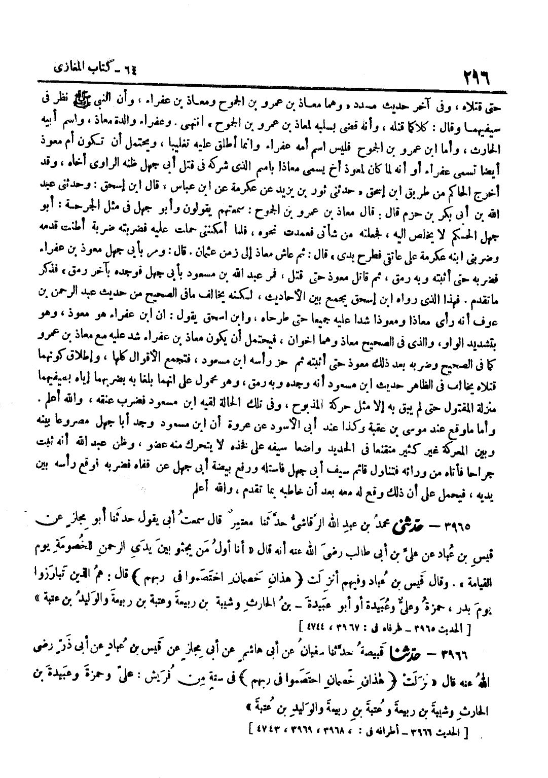 حَتَّى قَتَلَاهُ وَفِي آخَرِ حَدِيثِ مُسَدَّدٍ وَهُمَا معَاذ بن عَمْرو بن الجموح ومعاذ بن عَفْرَاءَ وَأَنَّ النَّبِيَّ صَلَّى اللَّهُ عَلَيْهِ وَسَلَّمَ نَظَرَ فِي سَيْفَيْهِمَا وَقَالَ كِلَاكُمَا قَتَلَهُ وَأَنَّهُ قَضَى بِسَلَبِهِ لِمُعَاذِ بْنِ عَمْرِو بْنِ الْجَمُوحِ انْتَهَى وَعَفْرَاءُ وَالِدَةُ مُعَاذٍ وَاسْمُ أَبِيهِ الْحَارِثُ وَأما بن عَمْرِو بْنِ الْجَمُوحِ فَلَيْسَ اسْمُ أُمِّهِ عَفْرَاءَ وَإِنَّمَا أُطْلِقَ عَلَيْهِ تَغْلِيبًا وَيَحْتَمِلُ أَنْ تَكُونَ أُمُّ مُعَوِّذٍ أَيْضًا تُسَمَّى عَفْرَاءَ أَوْ أَنَّهُ لَمَّا كَانَ لِمُعَوِّذٍ أَخٌ يُسَمَّى مُعَاذًا بِاسْمِ الَّذِي شَرَكَهُ فِي قَتْلِ أَبِي جَهْلٍ ظَنَّهُ الرَّاوِي أَخَاهُ وَقَدْ أَخْرَجَ الْحَاكِمُ مِنْ طَرِيقِ بن إِسْحَاقَ حَدَّثَنِي ثَوْرُ بْنُ يَزِيدَ عَنْ عِكْرِمَةَ عَن بن عَبَّاس قَالَ بن إِسْحَاقَ وَحَدَّثَنِي عَبْدُ اللَّهِ بْنُ أَبِي بَكْرِ بْنِ حَزْمٍ قَالَ قَالَ مُعَاذُ بْنُ عَمْرِو بْنِ الْجَمُوحِ سَمِعْتُهُمْ يَقُولُونَ وَأَبُو جَهْلٍ فِي مِثْلِ الْجُرْحَةِ أَبُو جَهْلٍ الْحَكَمُ لَا يُخْلَصُ إِلَيْهِ فَجَعَلْتُهُ مِنْ شَأْنِي فَعَمَدْتُ نَحْوَهُ فَلَمَّا أَمْكَنَنِي حَمَلْتُ عَلَيْهِ فَضَرَبْتُهُ ضَرْبَةً أَطْنَتْ قَدَمَهُ وَضَرَبَنِي ابْنُهُ عِكْرِمَةُ عَلَى عَاتِقِي فَطَرَحَ يَدِي قَالَ ثُمَّ عَاشَ مُعَاذٌ إِلَى زَمَنِ عُثْمَانَ قَالَ وَمر بِأبي جهل معوذ بن عَفْرَاءَ فَضَرَبَهُ حَتَّى أَثْبَتَهُ وَبِهِ رَمَقٌ ثُمَّ قَاتَلَ مُعَوِّذٌ حَتَّى قُتِلَ فَمَرَّ عَبْدُ اللَّهِ بْنُ مَسْعُودٍ بِأَبِي جَهْلٍ فَوَجَدَهُ بِآخِرِ رَمَقٍ فَذكر مَا تقدم فَهَذَا الَّذِي رَوَاهُ بن إِسْحَاقَ يَجْمَعُ بَيْنَ الْأَحَادِيثِ لَكِنَّهُ يُخَالِفُ مَا فِي الصَّحِيحِ مِنْ حَدِيثِ عَبْدِ الرَّحْمَنِ بْنِ عَوْفٍ أَنَّهُ رَأَى مُعَاذًا وَمُعَوِّذًا شَدَّا عَلَيْهِ جَمِيعًا حَتَّى طرحاه وبن إِسْحَاق يَقُول ان بن عَفْرَاءَ هُوَ مُعَوِّذٌ وَهُوَ بِتَشْدِيدِ الْوَاوِ وَالَّذِي فِي الصَّحِيحِ مُعَاذٌ وَهُمَا أَخَوَانِ فَيَحْتَمِلُ أَنْ يكون معَاذ بن عَفْرَاءَ شَدَّ عَلَيْهِ مَعَ مُعَاذِ بْنِ عَمْرٍو كَمَا فِي الصَّحِيحِ وَضَرَبَهُ بَعْدَ ذَلِكَ مُعَوِّذٌ حَتَّى أثْبته ثمَّ حز رَأسه بن مَسْعُودٍ فَتُجْمَعُ الْأَقْوَالُ كُلُّهَا وَإِطْلَاقُ كَوْنِهِمَا قَتَلَاهُ يُخَالف فِي الظَّاهِر حَدِيث بن مَسْعُودٍ أَنَّهُ وَجَدَهُ وَبِهِ رَمَقٌ وَهُوَ مَحْمُولٌ عَلَى أَنَّهُمَا بَلَغَا بِهِ بِضَرْبِهِمَا إِيَّاهُ بِسَيْفَيْهِمَا مَنْزِلَةَ الْمَقْتُولِ حَتَّى لَمْ يَبْقَ بِهِ إِلَّا مِثْلُ حَرَكَةِ الْمَذْبُوحِ وَفِي تِلْكَ الْحَالَةِ لَقِيَهُ بن مَسْعُودٍ فَضَرَبَ عُنُقَهُ وَاللَّهُ أَعْلَمُ وَأَمَّا مَا وَقَعَ عِنْدَ مُوسَى بْنِ عُقْبَةَ وَكَذَا عِنْدَ أبي الْأسود عَن عُرْوَة أَن بن مَسْعُودٍ وَجَدَ أَبَا جَهْلٍ مَصْرُوعًا بَيْنَهُ وَبَيْنَ الْمَعْرَكَةِ غَيْرُ كَثِيرٍ مُتَقَنِّعًا فِي الْحَدِيدِ وَاضِعًا سَيْفَهُ عَلَى فَخِذِهِ لَا يَتَحَرَّكُ مِنْهُ عُضْوٌ وَظَنَّ عَبْدُ اللَّهِ أَنَّهُ ثَبَتَ جِرَاحًا فَأَتَاهُ مِنْ وَرَائِهِ فَتَنَاوَلَ قَائِمَ سَيْفِ أَبِي جَهْلٍ فَاسْتَلَّهُ وَرَفَعَ بَيْضَةَ أَبِي جَهْلٍ عَنْ قَفَاهُ فَضَرَبَهُ فَوَقَعَ رَأْسُهُ بَيْنَ يَدَيْهِ فَيُحْمَلُ عَلَى أَن ذَلِك وَقع لَهُ مَعَه بَعْدَ أَنْ خَاطَبَهُ بِمَا تَقَدَّمَ وَاللَّهُ أَعْلَمُ
