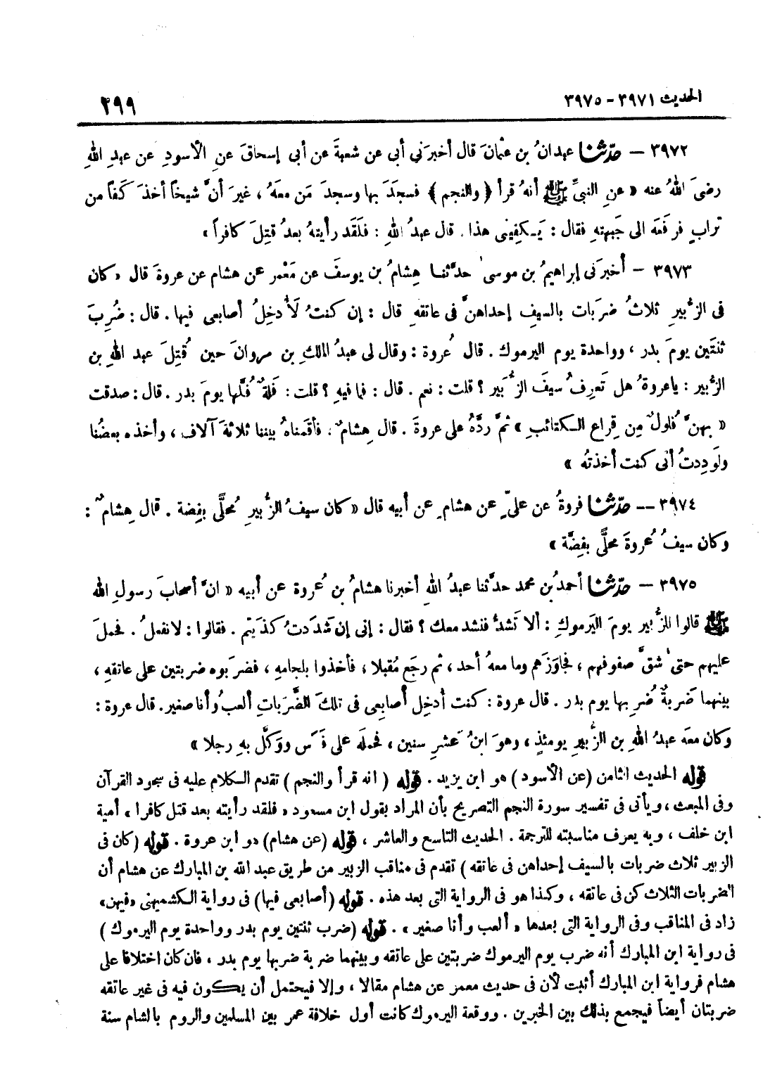 [3973] قَوْله عَن هِشَام هُوَ بن عُرْوَةَ قَوْلُهُ كَانَ فِي الزُّبَيْرِ ثَلَاثُ ضَرَبَاتٍ بِالسَّيْفِ إِحْدَاهُنَّ فِي عَاتِقِهِ تَقَدَّمَ فِي مَنَاقِبِ الزُّبَيْرِ مِنْ طَرِيقِ عَبْدِ اللَّهِ بْنِ الْمُبَارَكِ عَنْ هِشَامٍ أَنَّ الضَّرَبَاتِ الثَّلَاثَ كُنَّ فِي عَاتِقِهِ وَكَذَا هُوَ فِي الرِّوَايَةِ الَّتِي بَعْدَ هَذِهِ قَوْلُهُ أَصَابِعِي فِيهَا فِي رِوَايَةِ الْكُشْمِيهَنِيِّ فِيهِنَّ زَادَ فِي الْمَنَاقِبِ وَفِي الرِّوَايَةِ الَّتِي بَعْدَهَا أَلْعَبُ وَأَنَا صَغِيرٌ قَوْلُهُ ضُرِبَ ثِنْتَيْنِ يَوْمَ بَدْرٍ وَوَاحِدَةً يَوْمَ الْيَرْمُوكِ فِي رِوَايَةِ بن الْمُبَارَكِ أَنَّهُ ضُرِبَ يَوْمَ الْيَرْمُوكِ ضَرْبَتَيْنِ عَلَى عَاتِقِهِ وَبَيْنَهُمَا ضَرْبَةٌ ضُرِبَهَا يَوْمَ بَدْرٍ فَإِنْ كَانَ اخْتِلَافا على هِشَام فرواية بن الْمُبَارَكِ أَثْبَتُ لِأَنَّ فِي حَدِيثِ مَعْمَرٍ عَنْ هِشَامٍ مَقَالًا وَإِلَّا فَيَحْتَمِلُ أَنْ يَكُونَ فِيهِ فِي غَيْرِ عَاتِقِهِ ضَرْبَتَانِ أَيْضًا فَيُجْمَعُ بِذَلِكَ بَيْنَ الْخَبَرَيْنِ وَوَقْعَةُ الْيَرْمُوكِ كَانَتْ أَوَّلَ خِلَافَةِ عُمَرَ بَيْنَ الْمُسْلِمِينَ وَالرُّومِ بِالشَّامِ سَنَةَ
