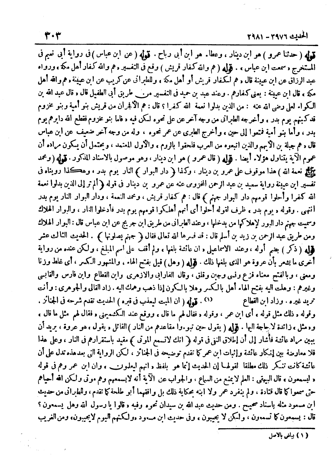 [3977] قَوْله حَدثنَا عَمْرو هُوَ بن دِينَار وَعَطَاء هُوَ بن أبي رَبَاح قَوْله عَن بن عَبَّاسٍ فِي رِوَايَةِ أَبِي نُعَيْمٍ فِي الْمُسْتَخْرَجِ سَمِعْتُ بن عَبَّاسٍ قَوْلُهُ هُمْ وَاللَّهِ كُفَّارُ قُرَيْشٍ وَقَعَ فِي التَّفْسِيرِ هُمْ وَاللَّهِ كُفَّارُ أَهْلِ مَكَّةَ وَرَوَاهُ عبد الرَّزَّاق عَن بن عُيَيْنَةَ قَالَ هُمْ لَكُفَّارُ قُرَيْشٍ أَوْ أَهْلِ مَكَّة وللطبراني عَن كريب عَن بن عُيَيْنَة هم وَالله أهل مَكَّة قَالَ بن عُيَيْنَةَ يَعْنِي كُفَّارَهُمْ وَعِنْدَ عَبْدِ بْنِ حُمَيْدٍ فِي التَّفْسِيرِ مِنْ طَرِيقِ أَبِي الطُّفَيْلِ قَالَ قَالَ عَبْدُ اللَّهِ بْنُ الْكَوَّاءِ لِعَلِيٍّ رَضِيَ اللَّهُ عَنْهُ مَنْ الَّذِينَ بَدَّلُوا نِعْمَةَ اللَّهِ كُفْرًا قَالَ هُمُ الْأَفْجَرَانِ مِنْ قُرَيْشٍ بَنُو أُمَيَّةَ وَبَنُو مَخْزُومٍ قَدْ كَبَتَهُمْ يَوْمَ بَدْرٍ وَأَخْرَجَهُ الطَّبَرَانِيُّ مِنْ وَجْهٍ آخَرَ عَنْ عَلِيٍّ نَحْوَهُ لَكِنْ فِيهِ فَأَمَّا بَنُو مَخْزُومٍ فَقَطَعَ اللَّهُ دَابِرَهُمْ يَوْمَ بَدْرٍ وَأَمَّا بَنُو أُمَيَّةَ فَمُتِّعُوا إِلَى حِينٍ وَأَخْرَجَ الطَّبَرِيُّ عَنْ عُمَرَ نَحْوَهُ وَلَهُ مِنْ وَجْهٍ آخَرَ ضَعِيفٍ عَنِ بن عَبَّاسٍ قَالَ هُمْ جَبَلَةُ بْنُ الْأَيْهَمِ وَالَّذِينَ اتَّبَعُوهُ مِنَ الْعَرَبِ فَلَحِقُوا بِالرُّومِ وَالْأَوَّلُ الْمُعْتَمَدُ وَيَحْتَمِلُ أَنْ يَكُونَ مُرَادُهُ أَنَّ عُمُومَ الْآيَةِ يَتَنَاوَلُ هَؤُلَاءِ أَيْضًا قَوْلُهُ قَالَ عَمْرٌو هُوَ بن دِينَارٍ وَهُوَ مَوْصُولٌ بِالْإِسْنَادِ الْمَذْكُورِ قَوْلُهُ وَمُحَمَّدٌ صَلَّى اللَّهُ عَلَيْهِ وَسَلَّمَ نِعْمَةُ اللَّهِ هَذَا مَوْقُوفٌ عَلَى عَمْرِو بْنِ دِينَارٍ وَكَذَا دَارَ الْبَوَار النَّارُ يَوْمَ بَدْرٍ وَهَكَذَا رُوِّينَاهُ فِي تَفْسِيرِ بن عُيَيْنَةَ رِوَايَةَ سَعِيدِ بْنِ عَبْدِ الرَّحْمَنِ الْمَخْزُومِيِّ عَنْهُ عَنْ عَمْرِو بْنِ دِينَارٍ فِي قَوْلِهِ أَلَمْ تَرَ إِلَى الَّذِينَ بَدَّلُوا نِعْمَةَ اللَّهِ كفرا وَأَحلُّوا قَومهمْ دَار الْبَوَار جَهَنَّم قَالَ هُمْ كُفَّارُ قُرَيْشٍ وَمُحَمَّدٌ النِّعْمَةُ وَدَارُ الْبَوَارِ النَّارُ يَوْمَ بَدْرٍ انْتَهَى وَقَوْلُهُ يَوْمَ بَدْرٍ ظَرْفٌ لِقَوْلِهِ أَحَلُّوا أَيْ أَنَّهُمْ أَهْلَكُوا قَوْمَهُمْ يَوْمَ بَدْرٍ فَأُدْخِلُوا النَّارَ وَالْبَوَارُ الْهَلَاكُ وَسميت جَهَنَّم دَار البور لِإِهْلَاكِهَا مَنْ يَدْخُلُهَا وَعِنْدَ الطَّبَرَانِيِّ مِنْ طَرِيقِ بن جريج عَن بن عَبَّاسٍ قَالَ الْبَوَارُ الْهَلَاكُ وَمِنْ طَرِيقِ عَبْدِ الرَّحْمَنِ بْنِ زَيْدِ بْنِ أَسْلَمَ قَالَ قَدْ فَسرهَا الله تَعَالَى فَقَالَ جَهَنَّم يصلونها الْحَدِيثُ الثَّالِثَ عَشَرَ قَوْلُهُ ذُكِرَ بِضَمِّ أَوَّلِهِ وَعِنْدَ الْإِسْمَاعِيلِيِّ أَنَّ عَائِشَةَ بَلَغَهَا وَلَمْ أَقِفْ عَلَى اسْمِ الْمُبَلِّغِ وَلَكِنْ عِنْدَهُ مِنْ رِوَايَةٍ أُخْرَى مَا يُشْعِرُ بِأَنَّ عُرْوَةَ هُوَ الَّذِي بَلَّغَهَا ذَلِكَ قَوْلُهُ وَهِلَ قِيلَ بِفَتْحِ الْهَاءِ وَالْمَشْهُورُ الْكَسْرُ أَيْ غَلَطَ وَزْنًا وَمَعْنًى وَبِالْفَتْحِ مَعْنَاهُ فَزِعَ وَنَسِيَ وَجَبُنَ وَقَلِقَ وَقَالَ الْفَارَابِيُّ والأزهري وبن القطاع وبن فَارِسٍ وَالْقَابِسِيُّ وَغَيْرُهُمْ وَهَلْتُ إِلَيْهِ بِفَتْحِ الْهَاءِ أَهِلُ بِالْكَسْرِ وَهْلًا بِالسُّكُونِ إِذَا ذَهَبَ وَهْمُكَ إِلَيْهِ زَادَ الْقَالِيُّ وَالْجَوْهَرِيُّ وَأَنْتَ تُرِيدُ غَيْرَهُ وَزَاد بن القطاع قَوْلُهُ إِنَّ الْمَيِّتَ لَيُعَذَّبُ فِي قَبْرِهِ الْحَدِيثُ تَقَدَّمَ شَرْحُهُ فِي الْجَنَائِزِ وَقَوْلُهُ ذَلِكَ مِثْلُ قَوْله أَي بن عُمَرَ وَقَوْلُهُ فَقَالَ لَهُمْ مَا قَالَ وَوَقَعَ عِنْدَ الْكُشْمِيهَنِيِّ 