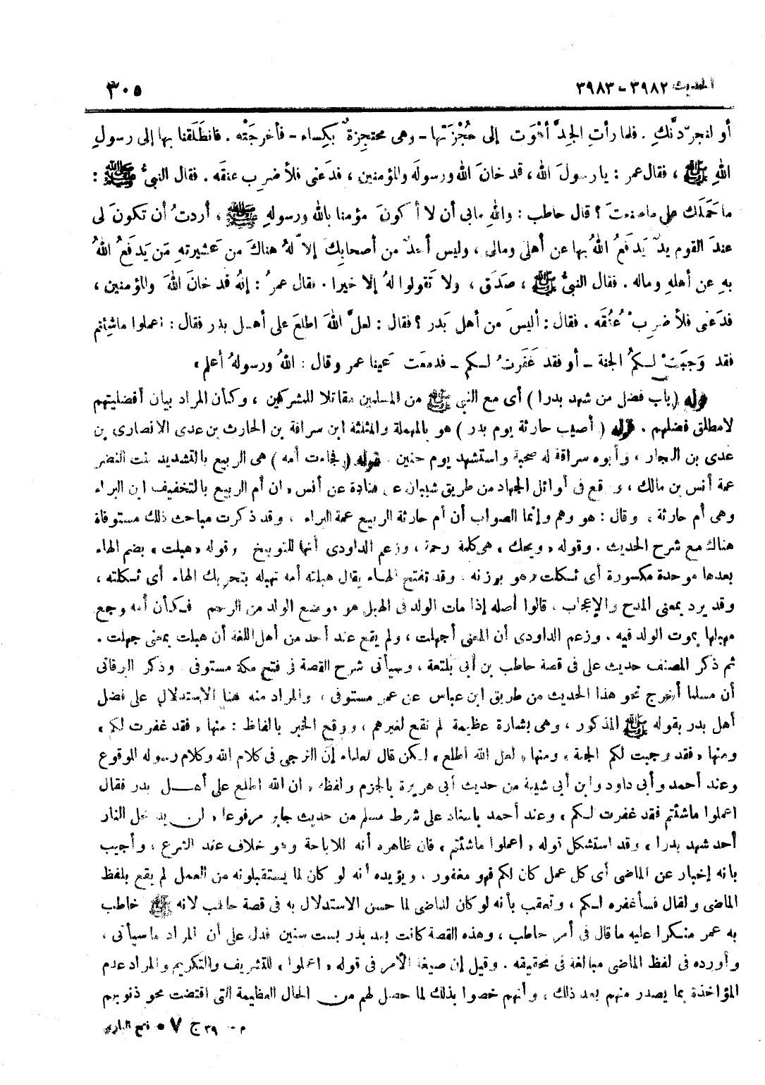 [3982] قَوْلُهُ أُصِيبَ حَارِثَةُ يَوْمَ بدر هُوَ بِالْمُهْمَلَةِ والمثلثة بن سُرَاقَةَ بْنِ الْحَارِثِ بْنِ عَدِيٍّ الْأَنْصَارِيِّ بْنِ عَدِيِّ بْنِ النَّجَّارِ وَأَبُوهُ سُرَاقَةُ لَهُ صُحْبَةٌ وَاسْتُشْهِدَ يَوْمَ حُنَيْنٍ قَوْلُهُ فَجَاءَتْ أُمُّهُ هِيَ الرُّبَيِّعُ بِالتَّشْدِيدِ بِنْتُ النَّضْرِ عَمَّةُ أَنَسِ بْنِ مَالِكٍ وَوَقَعَ فِي أَوَائِلِ الْجِهَادِ مِنْ طَرِيقِ شَيْبَانَ عَنْ قَتَادَةَ عَنْ أَنَسٍ أَنَّ أُمَّ الرّبيع بِالتَّخْفِيفِ بن الْبَرَاءِ وَهِيَ أُمُّ حَارِثَةَ وَقَالَ هُوَ وَهَمٌ وَإِنَّمَا الصَّوَابُ أَنَّ أُمَّ حَارِثَةَ الرُّبَيِّعُ عَمَّةُ الْبَرَاءِ وَقَدْ ذُكِرَتْ مَبَاحِثُ ذَلِكَ مُسْتَوْفَاةً هُنَاكَ مَعَ شَرْحِ الْحَدِيثِ وَقَوْلُهُ وَيْحَكَ هِيَ كَلِمَةُ رَحْمَةٍ وَزَعَمَ الدَّاوُدِيُّ أَنَّهَا لِلتَّوْبِيخِ وَقَوْلُهُ هُبِلَتْ بِضَمِّ الْهَاءِ بَعْدَهَا مُوَحَّدَةٌ مَكْسُورَةٌ أَيْ ثُكِلَتْ وَهُوَ بِوَزْنِهِ وَقَدْ تُفْتَحُ الْهَاءُ يُقَالُ هَبِلَتْهُ أُمُّهُ تُهَبِّلُهُ بِتَحْرِيكِ الْهَاءِ أَيْ ثَكِلَتْهُ وَقَدْ يَرِدُ بِمَعْنَى الْمَدْحِ وَالْإِعْجَابِ قَالُوا أَصْلُهُ إِذَا مَاتَ الْوَلَدُ فِي الْهُبَلِ هُوَ مَوْضِعُ الْوَلَدِ مِنَ الرَّحِمِ فَكَأَنَّ أُمَّهُ وُجِعَ مِهْبَلُهَا بِمَوْتِ الْوَلَدِ فِيهِ وَزَعَمَ الدَّاوُدِيُّ أَنَّ الْمَعْنَى أَجَهِلْتَ وَلَمْ يَقَعْ عِنْدَ أَحَدٍ مِنْ أَهْلِ اللُّغَةِ أَنَّ هُبِلَتْ بِمَعْنَى جَهِلَتْ ثُمَّ ذَكَرَ الْمُصَنِّفُ حَدِيثَ عَلِيٍّ فِي قِصَّةِ حَاطِبِ بْنِ أَبِي بَلْتَعَةَ وَسَيَأْتِي شَرْحُ الْقِصَّةِ فِي فَتْحِ مَكَّةَ مُسْتَوْفًى وَذَكَرَ الْبَرْقَانِيُّ أَنَّ مُسْلِمًا أَخْرَجَ نَحْوَ هَذَا الحَدِيث من طَرِيق بن عَبَّاسٍ عَنْ عُمَرَ مُسْتَوْفًى وَالْمُرَادُ مِنْهُ هُنَا الِاسْتِدْلَالُ عَلَى فَضْلِ أَهْلِ بَدْرٍ بِقَوْلِهِ صَلَّى اللَّهُ عَلَيْهِ وَسَلَّمَ الْمَذْكُورِ وَهِيَ بِشَارَةٌ عَظِيمَةٌ لَمْ تَقَعْ لِغَيْرِهِمْ وَوَقَعَ الْخَبَرُ بِأَلْفَاظٍ مِنْهَا فَقَدْ غَفَرْتُ لَكُمْ وَمِنْهَا فَقَدْ وَجَبَتْ لَكُمُ الْجَنَّةُ وَمِنْهَا لَعَلَّ اللَّهَ اطَّلَعَ لَكِنْ قَالَ الْعُلَمَاءُ إِنَّ التَّرَجِّي فِي كَلَامِ اللَّهِ وَكَلَامِ رَسُوله الموقوع وَعند أَحْمد وَأبي دَاوُد وبن أَبِي شَيْبَةَ مِنْ حَدِيثِ أَبِي هُرَيْرَةَ بِالْجَزْمِ وَلَفْظُهُ إِنَّ اللَّهَ اطَّلَعَ عَلَى أَهْلِ بَدْرٍ فَقَالَ اعْمَلُوا مَا شِئْتُمْ فَقَدْ غَفَرْتُ لَكُمْ وَعِنْدَ أَحْمَدَ بِإِسْنَادٍ عَلَى شَرْطِ مُسْلِمٍ مِنْ حَدِيثِ جَابِرٍ مَرْفُوعًا لَنْ يَدْخُلَ النَّارَ أَحَدٌ شَهِدَ بَدْرًا وَقَدِ اسْتُشْكِلَ