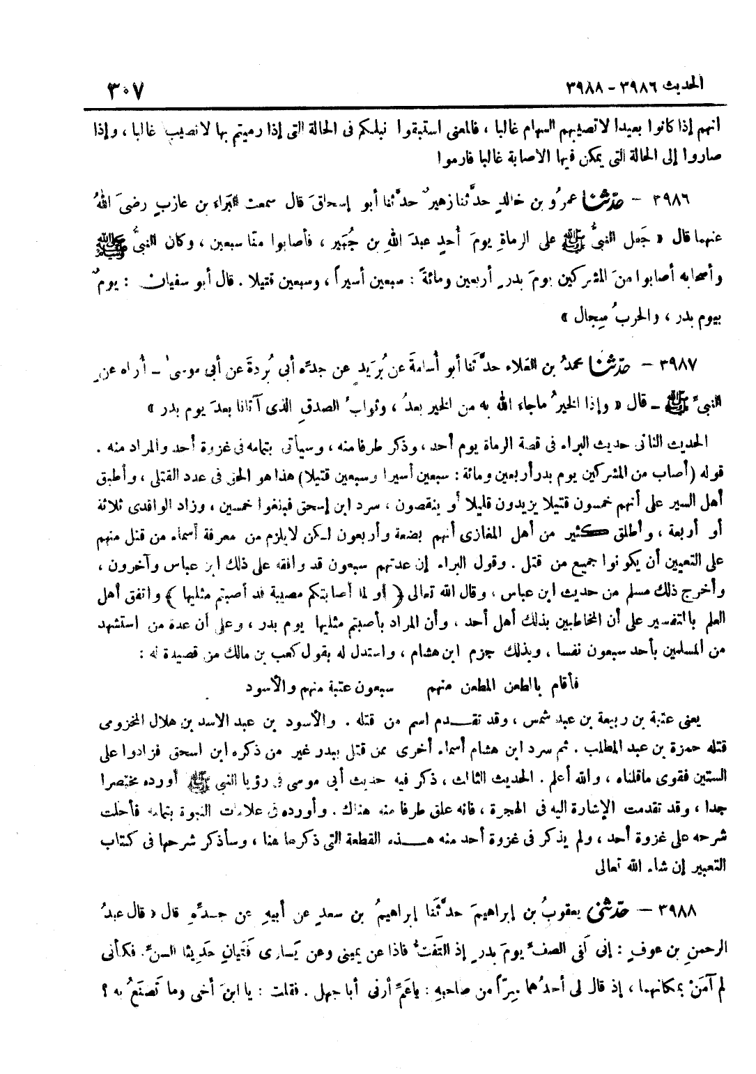 [3986] قَوْلُهُ أَصَابَ مِنَ الْمُشْرِكِينَ يَوْمَ بَدْرٍ أَرْبَعِينَ وَمِائَةً سَبْعِينَ أَسِيرًا وَسَبْعِينَ قَتِيلًا هَذَا هُوَ الْحَقُّ فِي عَدَدِ الْقَتْلَى وَأَطْبَقَ أَهْلُ السِّيَرِ عَلَى أَنَّهُمْ خَمْسُونَ قَتِيلًا يَزِيدُونَ قَلِيلًا أَوْ ينقصُونَ سرد بن إِسْحَاقَ فَبَلَغُوا خَمْسِينَ وَزَادَ الْوَاقِدِيُّ ثَلَاثَةً أَوْ أَرْبَعَةً وَأَطْلَقَ كَثِيرٌ مِنْ أَهْلِ الْمَغَازِي أَنَّهُمْ بِضْعَةٌ وَأَرْبَعُونَ لَكِنْ لَا يَلْزَمُ مِنْ مَعْرِفَةِ أَسْمَاءِ مَنْ قُتِلَ مِنْهُمْ عَلَى التَّعْيِينِ أَنْ يَكُونُوا جَمِيعَ مَنْ قُتِلَ وَقَوْلُ الْبَرَاءِ إِنَّ عدتهمْ سَبْعُونَ قد وَافقه على ذَلِك بن عَبَّاسٍ وَآخَرُونَ وَأَخْرَجَ ذَلِكَ مُسْلِمٌ مِنْ حَدِيثِ بن عَبَّاس وَقَالَ الله تَعَالَى أَو لما أَصَابَتْكُم مُصِيبَة قد أصبْتُم مثليها وَاتَّفَقَ أَهْلُ الْعِلْمِ بِالتَّفْسِيرِ عَلَى أَنَّ الْمُخَاطَبِينَ بِذَلِكَ أَهْلُ أُحُدٍ وَأَنَّ الْمُرَادَ بِأَصَبْتُمْ مِثْلَيْهَا يَوْمُ بَدْرٍ وَعَلَى أَنَّ عِدَّةَ مَنِ اسْتُشْهِدَ مِنَ الْمُسْلِمِينَ بِأُحُدٍ سَبْعُونَ نَفْسًا وَبِذَلِكَ جَزَمَ بن هِشَامٍ وَاسْتَدَلَّ لَهُ بِقَوْلِ كَعْبِ بْنِ مَالِكٍ مِنْ قَصِيدَةٍ لَهُ فَأَقَامَ بِالطَّعْنِ الْمُطَعَّنُ مِنْهُمُ سَبْعُونَ عُتْبَةُ مِنْهُمُ وَالْأَسْوَدُ يَعْنِي عُتْبَةَ بْنَ رَبِيعَةَ بْنِ عَبْدِ شَمْسٍ وَقَدْ تَقَدَّمَ اسْمُ مَنْ قَتَلَهُ وَالْأَسْوَدُ بْنُ عَبْدِ الْأَسَدِ بْنِ هِلَالٍ الْمَخْزُومِيُّ قَتَلَهُ حَمْزَةُ بْنُ عَبْدِ الْمُطَّلِبِ ثمَّ سرد بن هِشَامٍ أَسْمَاءً أُخْرَى مِمَّنْ قُتِلَ بِبَدْرٍ غَيْرَ من ذكره بن إِسْحَاقَ فَزَادُوا عَلَى السِّتِّينَ فَقَوَّى مَا قُلْنَاهُ وَاللَّهُ أَعْلَمُ الْحَدِيثُ الثَّالِثُ ذَكَرَ فِيهِ حَدِيثُ أَبِي مُوسَى فِي رُؤْيَا النَّبِيِّ صَلَّى اللَّهُ عَلَيْهِ وَسَلَّمَ أَوْرَدَهُ مُخْتَصَرًا جِدًّا وَقَدْ تَقَدَّمَتِ الْإِشَارَةُ إِلَيْهِ فِي الْهِجْرَةِ فَإِنَّهُ عَلَّقَ طَرَفًا مِنْهُ هُنَاكَ وَأَوْرَدَهُ فِي عَلَامَاتِ النُّبُوَّةِ بِتَمَامِهِ فَأَحَلْتُ شَرْحَهُ عَلَى غَزْوَةِ أُحُدٍ وَلَمْ يَذْكُرْ فِي غَزْوَةِ أُحُدٍ مِنْهُ هَذِهِ الْقِطْعَةَ الَّتِي ذَكَرَهَا هُنَا وَسَأَذْكُرُ شَرْحَهَا فِي كِتَابِ التَّعْبِيرِ إِنْ شَاءَ اللَّهُ تَعَالَى