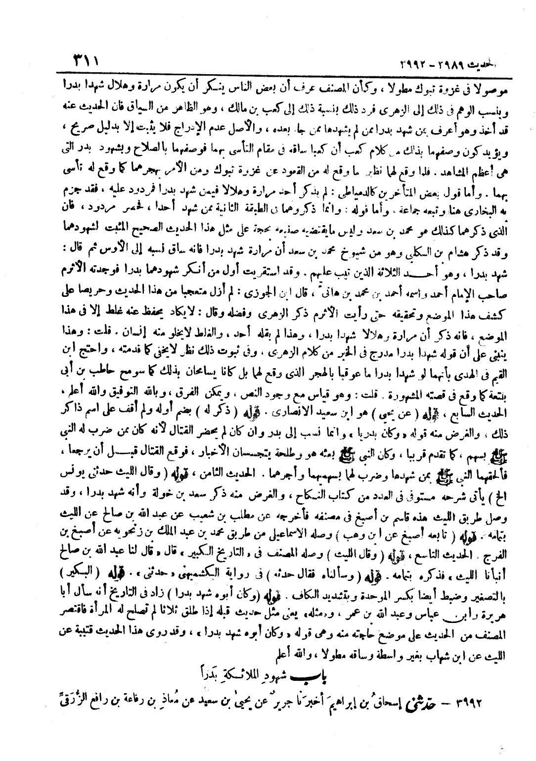 [3991] قَوْلُهُ وَقَالَ اللَّيْثُ حَدَّثَنِي يُونُسُ إِلَخْ يَأْتِي شَرْحُهُ مُسْتَوْفًى فِي الْعِدَدِ مِنْ كِتَابِ النِّكَاحِ وَالْغَرَضُ مِنْهُ ذِكْرُ سَعْدِ بْنِ خَوْلَةَ وَأَنَّهُ شَهِدَ بَدْرًا وَقَدْ وَصَلَ طَرِيقَ اللَّيْثِ هَذِهِ قَاسِمُ بْنُ أَصْبَغَ فِي مُصَنَّفِهِ فَأَخْرَجَهُ عَن مطلب بن شُعَيْب عَنْ عَبْدِ اللَّهِ بْنِ صَالِحٍ عَنِ اللَّيْثِ بِتَمَامِهِ قَوْله تَابعه أصبغ عَن بن وَهْبٍ وَصَلَهُ الْإِسْمَاعِيلِيُّ مِنْ طَرِيقِ مُحَمَّدِ بْنِ عَبْدِ الْمَلِكِ بْنِ زَنْجَوَيْهِ عَنْ أَصْبَغَ بْنِ الْفَرَجِ الْحَدِيثُ التَّاسِعُ قَوْلُهُ وَقَالَ اللَّيْثُ وَصَلَهُ الْمُصَنِّفُ فِي التَّارِيخِ الْكَبِيرِ قَالَ قَالَ لَنَا عَبْدُ اللَّهِ بْنُ صَالِحٍ أَنْبَأَنَا اللَّيْثُ فَذَكَرَهُ بِتَمَامِهِ قَوْلُهُ وَسَأَلْنَاهُ فَقَالَ حَدَّثَهُ فِي رِوَايَةِ الْكُشْمِيهَنِيِّ حَدَّثَنِي قَوْلُهُ الْبُكَيْرُ بِالتَّصْغِيرِ وَضُبِطَ أَيْضًا بِكَسْرِ الْمُوَحَّدَةِ وَبِتَشْدِيدِ الْكَافِ قَوْلُهُ وَكَانَ أَبُوهُ شَهِدَ بَدْرًا زَادَ فِي التَّارِيخِ أَنَّهُ سَأَلَ أَبَا هُرَيْرَة وبن عَبَّاس وَعبد الله بن عمر وَمثله يَعْنِي مِثْلَ حَدِيثٍ قَبْلَهُ إِذَا طَلَّقَ ثَلَاثًا لَمْ تَصْلُحْ لَهُ الْمَرْأَةُ فَاقْتَصَرَ الْمُصَنِّفُ مِنَ الْحَدِيثِ عَلَى مَوْضِعِ حَاجَتِهِ مِنْهُ وَهِيَ قَوْلُهُ وَكَانَ أَبُوهُ شَهِدَ بَدْرًا وَقَدْ رَوَى هَذَا الحَدِيث قُتَيْبَة عَن اللَّيْث عَن بن شِهَابٍ بِغَيْرِ وَاسِطَةٍ وَسَاقَهُ مُطَوَّلًا وَاللَّهُ أَعْلَمُ