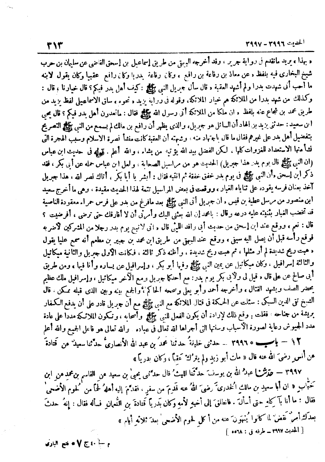 [3995] أَنَّ النَّبِيَّ صَلَّى اللَّهُ عَلَيْهِ وَسَلَّمَ قَالَ يَوْمَ بَدْرٍ هَذَا جِبْرِيلُ الْحَدِيثَ هُوَ من مَرَاسِيل الصَّحَابَة وَلَعَلَّ بن عَبَّاسٍ حَمَلَهُ عَنْ أَبِي بَكْرٍ فَقَدْ ذَكَرَ بن إِسْحَاقَ أَنَّ النَّبِيَّ صَلَّى اللَّهُ عَلَيْهِ وَسَلَّمَ فِي يَوْمِ بَدْرٍ خَفَقَ خَفْقَةً ثُمَّ انْتَبَهَ فَقَالَ أَبْشِرْ يَا أَبَا بَكْرٍ أَتَاكَ نَصْرُ اللَّهِ هَذَا جِبْرِيلُ آخِذٌ بِعِنَانِ فَرَسِهِ يَقُودُهُ عَلَى ثَنَايَاهُ الْغُبَارُ وَوَقَعَتْ فِي بَعْضِ الْمَرَاسِيلِ تَتِمَّةٌ لِهَذَا الْحَدِيثِ مُقَيَّدَةٌ وَهِيَ مَا أَخْرَجَ سَعِيدُ بْنُ مَنْصُورٍ مِنْ مُرْسَلِ عَطِيَّةَ بْنِ قَيْسٍ أَنَّ جِبْرِيلَ أَتَى النَّبِيَّ صَلَّى اللَّهُ عَلَيْهِ وَسلم بعد مَا فَرَغَ مِنْ بَدْرٍ عَلَى فَرَسٍ حَمْرَاءَ مَعْقُودَةِ النَّاصِيَةِ قَدْ تَخَضَّبَ الْغُبَارُ بِثَنِيَّتِهِ عَلَيْهِ دِرْعُهُ وَقَالَ يَا مُحَمَّدُ إِنَّ اللَّهَ بَعَثَنِي إِلَيْكَ وَأَمَرَنِي أَنْ لَا أُفَارِقَكَ حَتَّى تَرْضَى أَفَرَضِيتَ قَالَ نعم وَوَقع عِنْد بن إِسْحَاقَ مِنْ حَدِيثِ أَبِي وَاقِدٍ اللَّيْثِيِّ قَالَ إِنِّي لَأَتَّبِعُ يَوْمَ بَدْرٍ رَجُلًا مِنَ الْمُشْرِكِينَ لِأَضْرِبَهُ فَوَقَعَ رَأْسُهُ قَبْلَ أَنْ يَصِلَ إِلَيْهِ سَيفي وَوَقع عِنْد الْبَيْهَقِيّ من طَرِيق بن مُحَمَّدِ بْنِ جُبَيْرِ بْنِ مُطْعِمٍ أَنَّهُ سَمِعَ عَلِيًّا يَقُولُ هَبَّتْ رِيحٌ شَدِيدَةٌ لَمْ أَرَ مِثْلَهَا ثُمَّ هَبَّتْ رِيحٌ شَدِيدَةٌ وَأَظُنُّهُ ذَكَرَ ثَالِثَةً فَكَانَتِ الْأُولَى جِبْرِيلَ وَالثَّانِيَةُ مِيكَائِيلَ وَالثَّالِثَةُ إِسْرَافِيلَ وَكَانَ مِيكَائِيلُ عَنْ يَمِينِ النَّبِيِّ صَلَّى اللَّهُ عَلَيْهِ وَسَلَّمَ وَفِيهَا أَبُو بَكْرٍ وَإِسْرَافِيلُ عَنْ يَسَارِهِ وَأَنَا فِيهَا وَمِنْ طَرِيقِ أَبِي صَالِحٍ عَنْ عَلِيٍّ قَالَ قِيلَ لِي وَلِأَبِي بَكْرٍ يَوْمَ بَدْرٍ مَعَ أَحَدِكُمَا جِبْرِيلُ وَمَعَ الْآخَرِ مِيكَائِيلُ وَإِسْرَافِيلُ مَلَكٌ عَظِيمٌ يَحْضُرُ الصَّفَّ وَيَشْهَدُ الْقِتَالَ وَأَخْرَجَهُ أَحْمَدُ وَأَبُو يَعْلَى وَصَحَّحَهُ الْحَاكِمُ وَالْجَمْعُ بَيْنَهُ وَبَيْنَ الَّذِي قَبْلَهُ مُمْكِنٌ قَالَ الشَّيْخُ تَقِيُّ الدِّينِ السُّبْكِيُّ سُئِلْتُ عَنْ الْحِكْمَةِ فِي قِتَالِ الْمَلَائِكَةِ مَعَ النَّبِيِّ صَلَّى اللَّهُ عَلَيْهِ وَسَلَّمَ مَعَ أَنَّ جِبْرِيلَ قَادِرٌ عَلَى أَنْ يَدْفَعَ الْكُفَّارَ بِرِيشَةِ مِنْ جَنَاحِهِ فَقُلْتُ وَقَعَ ذَلِكَ لِإِرَادَةِ أَنْ يَكُونَ الْفِعْلُ لِلنَّبِيِّ صَلَّى اللَّهُ عَلَيْهِ وَسَلَّمَ وَأَصْحَابِهِ وَتَكُونَ الْمَلَائِكَةُ مَدَدًا عَلَى عَادَةِ مَدَدِ الْجُيُوشِ رِعَايَةً لِصُورَةِ الْأَسْبَابِ وَسُنَّتِهَا الَّتِي أَجْرَاهَا اللَّهُ تَعَالَى فِي عِبَادَهِ وَاللَّهُ تَعَالَى هُوَ فَاعِلُ الْجَمِيعِ وَالله أعلم