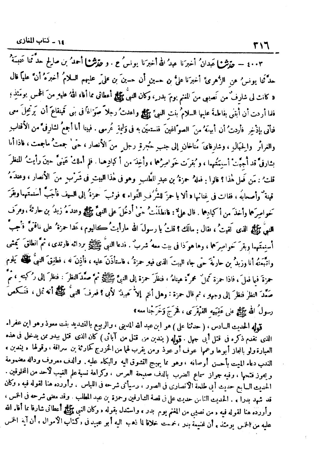 حَدثنَا عَليّ هُوَ بن عَبْدِ اللَّهِ الْمَدِينِيُّ وَالرُّبَيِّعُ بِالتَّشْدِيدِ بِنْتُ مُعَوِّذٍ وَهُوَ بن عَفْرَاءَ الَّذِي تَقَدَّمَ ذِكْرُهُ فِي قَتْلِ أَبِي جهل قَوْله يندبن من قتل من آبَائِي كَانَ الَّذِي قُتِلَ بِبَدْرٍ مِمَّنْ يَدْخُلُ فِي هَذِهِ الْعِبَارَةِ وَلَوْ بِالْمَجَازِ أَبُوهَا وَعَمُّهَا عَوْفٌ أَوْ عَوْذٌ وَمَنْ يَقْرُبُ لَهُمَا مِنَ الْخَزْرَجِ كَحَارِثَةَ بْنِ سُرَاقَةَ وَقَوْلُهَا يَنْدُبْنَ النَّدْبُ دُعَاءُ الْمَيِّتِ بِأَحْسَنِ أَوْصَافِهِ وَهُوَ مِمَّا يُهَيِّجُ التَّشَوُّقَ إِلَيْهِ وَالْبُكَاءَ عَلَيْهِ وَالدُّفُّ مَعْرُوفٌ وَدَالُهُ مَضْمُومَةٌ وَيَجُوزُ فَتْحُهَا وَفِيهِ جَوَازُ سَمَاعِ الضَّرْبِ بِالدُّفِّ صَبِيحَةَ الْعُرْسِ وَكَرَاهَةُ نِسْبَةِ عِلْمِ الْغَيْبِ لِأَحَدٍ مِنَ الْمَخْلُوقِينَ الْحَدِيثُ السَّابِعُ حَدِيثُ أَبِي طَلْحَةَ الْأَنْصَارِيِّ فِي الصُّوَرِ وَسَيَأْتِي شَرْحُهُ فِي اللِّبَاسِ وَأَوْرَدَهُ هُنَا لِقَوْلِهِ فِيهِ وَكَانَ قَدْ شَهِدَ بَدْرًا الْحَدِيثُ الثَّامِنُ حَدِيثُ عَلِيٍّ فِي قِصَّةِ الشَّارِفِينَ وَحَمْزَةَ بْنِ عَبْدِ الْمُطَّلِبِ وَقَدْ مَضَى شَرْحُهُ فِي الْخُمُسِ وَأَوْرَدَهُ هُنَا لِقَوْلِهِ فِيهِ مِنْ نَصِيبِي مِنَ الْمَغْنَمِ يَوْمَ بَدْرٍ وَاسْتَدَلَّ بِقَوْلِهِ وَكَانَ النَّبِيُّ صَلَّى اللَّهُ عَلَيْهِ وَسَلَّمَ أَعْطَانِي شَارِفًا مِمَّا أَفَاءَ اللَّهُ عَلَيْهِ مِنَ الْخُمُسِ يَوْمَئِذٍ أَنَّ غَنِيمَةَ بَدْرٍ خُمِّسَتْ خِلَافًا لِمَا ذَهَبَ إِلَيْهِ أَبُو عُبَيْدٍ فِي كِتَابِ الْأَمْوَالِ أَنَّ آيَةَ الْخُمُسِ