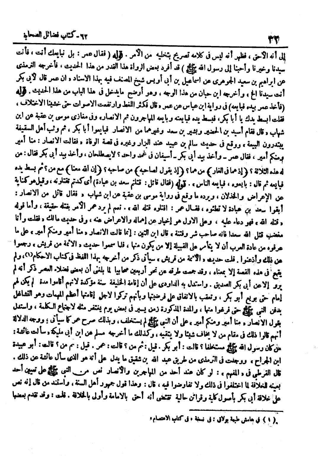 إِلَى أَنَّهُ الْأَحَقُّ فَظَهَرَ أَنَّهُ لَيْسَ فِي كَلَامِهِ تَصْرِيحٌ بِتَخَلِّيهِ مِنَ الْأَمْرِ قَوْلُهُ فَقَالَ عُمَرُ بَلْ نُبَايِعُكَ أَنْتَ فَأَنْتَ سَيِّدُنَا وَخَيْرُنَا وَأَحَبُّنَا إِلَى رَسُولِ اللَّهِ صَلَّى اللَّهُ عَلَيْهِ وَسَلَّمَ قَدْ أَفْرَدَ بَعْضُ الرُّوَاةِ هَذَا الْقَدْرَ مِنْ هَذَا الْحَدِيثِ فَأَخْرَجَهُ التِّرْمِذِيُّ عَنْ إِبْرَاهِيمَ بْنِ سَعِيدٍ الْجَوْهَرِيِّ عَنْ إِسْمَاعِيلَ بْنِ أَبِي أُوَيْسٍ شَيْخِ الْمُصَنِّفِ فِيهِ بِهَذَا الْإِسْنَادِ أَنَّ عُمَرَ قَالَ لِأَبِي بَكْرٍ أَنْتَ سَيِّدُنَا إِلَخْ وَأخرجه بن حِبَّانَ مِنْ هَذَا الْوَجْهِ وَهُوَ أَوْضَحُ مَا يَدْخُلُ فِي هَذَا الْبَابِ مِنْ هَذَا الْحَدِيثِ قَوْلُهُ فَأَخَذَ عُمَرُ بِيَدِهِ فَبَايَعَهُ فِي رِوَايَةِ بن عَبَّاسٍ عَنْ عُمَرَ قَالَ فَكَثُرَ اللَّغَطُ وَارْتَفَعَتِ الْأَصْوَاتُ حَتَّى خَشِينَا الِاخْتِلَافَ فَقُلْتُ ابْسُطْ يَدَكَ يَا أَبَا بَكْرٍ فَبَسَطَ يَدَهُ فَبَايَعْتُهُ وَبَايَعَهُ الْمُهَاجِرُونَ ثُمَّ الْأَنْصَارُ وَفِي مَغَازِي مُوسَى بْنِ عقبَة عَن بن شِهَابٍ قَالَ فَقَامَ أُسَيْدُ بْنُ الْحُضَيْرِ وَبَشِيرُ بْنُ سَعْدٍ وَغَيْرُهُمَا مِنَ الْأَنْصَارِ فَبَايَعُوا أَبَا بَكْرٍ ثُمَّ وَثَبَ أَهْلُ السَّقِيفَةِ يَبْتَدِرُونَ الْبَيْعَةَ وَوَقَعَ فِي حَدِيثِ سَالِمِ بْنِ عُبَيْدٍ عِنْدَ الْبَزَّار وَغَيره فِي قِصَّةِ الْوَفَاةِ فَقَالَتِ الْأَنْصَارُ مِنَّا أَمِيرٌ وَمِنْكُمْ أَمِيرٌ فَقَالَ عُمَرُ وَأَخَذَ بِيَدِ أَبِي بكر أسيفان فِي غمد وَاحِد لايصطلحان وَأَخَذَ بِيَدِ أَبِي بَكْرٍ فَقَالَ مَنْ لَهُ هَذِهِ الثَّلَاثَةُ إِذْ هُمَا فِي الْغَارِ مَنْ هُمَا إِذْ يَقُولُ لِصَاحِبِهِ مَنْ صَاحِبُهُ إِنَّ اللَّهَ مَعَنَا مَعَ مَنْ ثُمَّ بَسَطَ يَدَهُ فَبَايَعَهُ ثُمَّ قَالَ بَايِعُوهُ فَبَايَعَهُ النَّاسُ قَوْلُهُ فَقَالَ قَائِلٌ قَتَلْتُمْ سَعْدَ بْنَ عُبَادَةَ أَيْ كِدْتُمْ تَقْتُلُونَهُ وَقِيلَ هُوَ كِنَايَةٌ عَنِ الْإِعْرَاضِ وَالْخِذْلَانِ وَيَرُدُّهُ مَا وَقَعَ فِي رِوَايَةِ مُوسَى بْنِ عُقْبَةَ عَنْ بن شِهَابٍ فَقَالَ قَائِلٌ مِنَ الْأَنْصَارِ أَبْقُوا سَعْدَ بْنَ عُبَادَةَ لَا تَطَئُوهُ فَقَالَ عُمَرُ اقْتُلُوهُ قَتَلَهُ اللَّهُ نَعَمْ لَمْ يُرِدْ عُمَرُ الْأَمْرَ بِقَتْلِهِ حَقِيقَةً وَأَمَّا قَوْلُهُ قَتَلَهُ اللَّهُ فَهُوَ دُعَاءٌ عَلَيْهِ وَعَلَى الْأَوَّلِ هُوَ إِخْبَارٌ عَنْ إِهْمَالِهِ وَالْإِعْرَاضِ عَنْهُ وَفِي حَدِيثِ مَالِكٍ فَقُلْتُ وَأَنَا مُغْضَبٌ قَتَلَ اللَّهُ سَعْدًا فَإِنَّهُ صَاحِبُ شَرّ وفتنة قَالَ بن التِّينِ إِنَّمَا قَالَتِ الْأَنْصَارُ مِنَّا أَمِيرٌ وَمِنْكُمْ أَمِيرٌ عَلَى مَا عَرَفُوهُ مِنْ عَادَةِ الْعَرَبِ أَنْ لَا يَتَأَمَّرَ عَلَى الْقَبِيلَةِ إِلَّا مَنْ يَكُونُ مِنْهَا فَلَمَّا سَمِعُوا حَدِيثَ الْأَئِمَّةُ مِنْ قُرَيْشٍ رَجَعُوا عَنْ ذَلِكَ وَأَذْعَنُوا قُلْتُ حَدِيثُ الْأَئِمَّةُ مِنَ قُرَيْشٍ سَيَأْتِي ذِكْرُ مَنْ أَخْرَجَهُ بِهَذَا اللَّفْظ فِي كتاب الاحكام وَلَمْ يَقَعْ فِي هَذِهِ الْقِصَّةِ إِلَّا بِمَعْنَاهُ وَقَدْ جَمَعْتُ طُرُقَهُ عَنْ نَحْوِ أَرْبَعِينَ صَحَابِيًّا لَمَّا بَلَغَنِي أَنَّ بَعْضَ فُضَلَاءِ الْعَصْرِ ذَكَرَ أَنَّهُ لَمْ يُرْوَ إِلَّا عَنْ أَبِي بَكْرٍ الصِّدِّيقِ وَاسْتَدَلَّ بِهِ الدَّاوُدِيُّ عَلَى أَنَّ إِقَامَةَ الْخَلِيفَةِ سُنَّةٌ مُؤَكَّدَةٌ لِأَنَّهُمْ أَقَامُوا مُدَّة لَمْ يَكُنْ لَهُمْ إِمَامٌ حَتَّى بُويِعَ أَبُو بَكْرٍ وَتُعُقِّبَ بِالِاتِّفَاقِ عَلَى فَرْضِيَّتِهَا وَبِأَنَّهُمْ تَرَكُوا لِأَجْلِ إِقَامَتِهَا أَعْظَمَ الْمُهِمَّاتِ وَهُوَ التَّشَاغُلُ بِدَفْنِ ال
