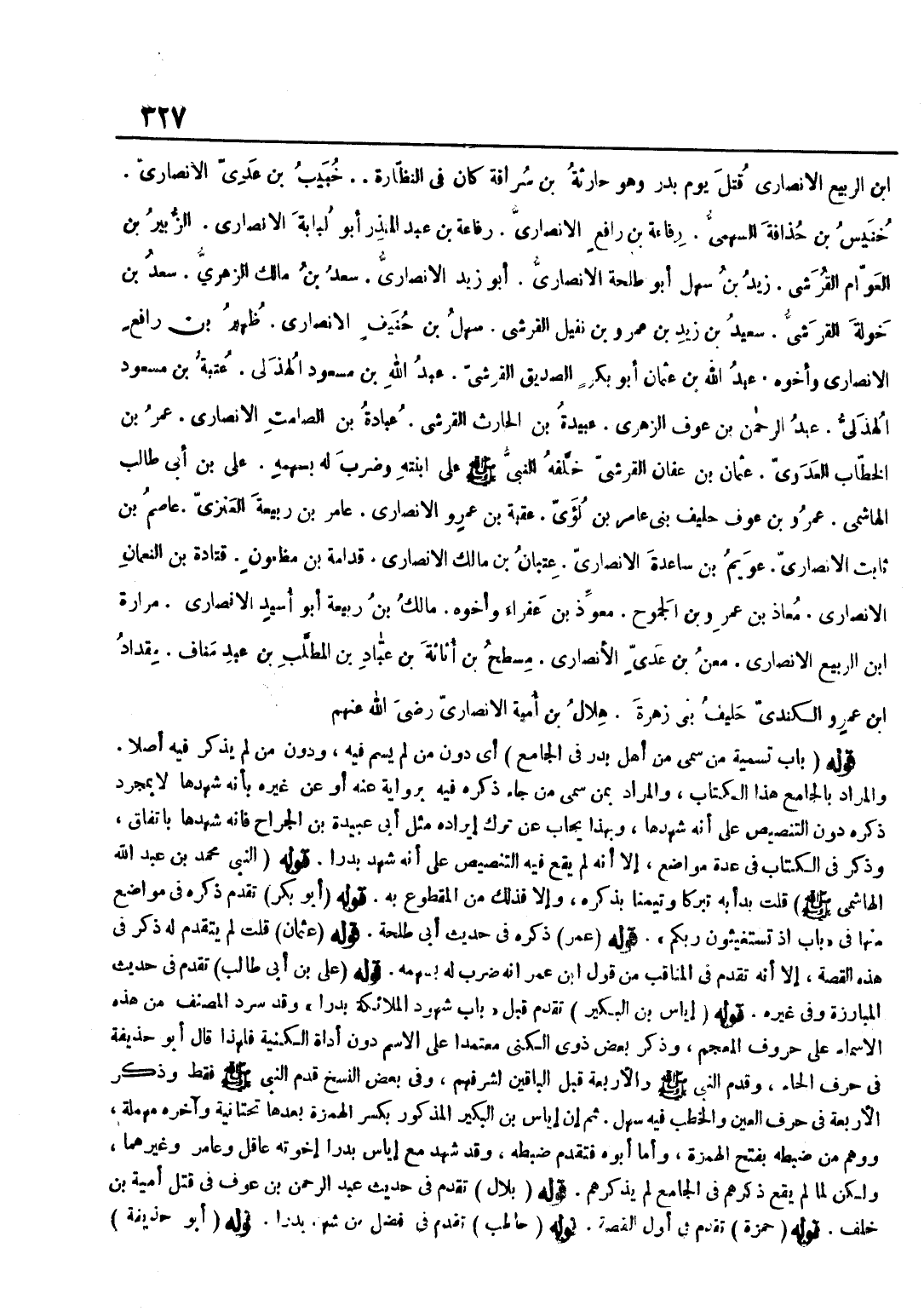 أَيْ دُونَ مَنْ لَمْ يُسَمَّ فِيهِ وَدُونَ مَنْ لَمْ يُذْكَرْ فِيهِ أَصْلًا وَالْمُرَادُ بِالْجَامِعِ هَذَا الْكِتَابُ وَالْمُرَادُ بِمَنْ سمي من جَاءَ ذكره فِيهِ بِرِوَايَةٍ عَنْهُ أَوْ عَنْ غَيْرِهِ بِأَنَّهُ شَهِدَهَا لَا بِمُجَرَّدِ ذِكْرِهِ دُونَ التَّنْصِيصِ عَلَى أَنَّهُ شَهِدَهَا وَبِهَذَا يُجَابُ عَنْ تَرْكِ إِيرَادِهِ مِثْلَ أَبِي عُبَيْدَةَ بْنِ الْجَرَّاحِ فَإِنَّهُ شَهِدَهَا بِاتِّفَاقٍ وَذُكِرَ فِي الْكِتَابِ فِي عِدَّةِ مَوَاضِعَ إِلَّا أَنَّهُ لَمْ يَقَعْ فِيهِ التَّنْصِيصُ عَلَى أَنَّهُ شَهِدَ بَدْرًا قَوْلُهُ النَّبِيُّ مُحَمَّدُ بْنُ عَبْدِ اللَّهِ الْهَاشِمِيُّ صَلَّى اللَّهُ عَلَيْهِ وَسَلَّمَ قُلْتُ بَدَأَ بِهِ تَبَرُّكًا وَتَيَمُّنًا بِذِكْرِهِ وَإِلَّا فَذَلِكَ مِنَ الْمَقْطُوعِ بِهِ قَوْلُهُ أَبُو بَكْرٍ تَقَدَّمَ ذِكْرُهُ فِي مَوَاضِعَ مِنْهَا فِي بَابِ إِذْ تَسْتَغِيثُونَ رَبَّكُمْ قَوْلُهُ عُمَرُ ذَكَرَهُ فِي حَدِيثِ أَبِي طَلْحَةَ قَوْلُهُ عُثْمَانَ قُلْتُ لَمْ يَتَقَدَّمْ لَهُ ذِكْرٌ فِي هَذِهِ الْقِصَّةِ إِلَّا أَنه تقدم فِي المناقب من قَول بن عُمَرَ أَنَّهُ ضَرَبَ لَهُ بِسَهْمِهِ قَوْلُهُ عَلِيُّ بْنِ أَبِي طَالِبٍ تَقَدَّمَ فِي حَدِيثِ الْمُبَارَزَةِ وَفِي غَيْرِهِ قَوْلُهُ إِيَاسُ بْنُ الْبُكَيْرِ تَقَدَّمَ قَبْلُ بَابُ شُهُودِ الْمَلَائِكَةِ بَدْرًا وَقَدْ سَرَدَ الْمُصَنِّفُ مِنْ هَذِهِ الْأَسْمَاءِ عَلَى حُرُوفِ الْمُعْجَمِ وَذَكَرَ بَعْضَ ذَوِي الْكُنَى مُعْتَمِدًا عَلَى الِاسْمِ دُونَ أَدَاةِ الْكُنْيَةِ فَلِهَذَا قَالَ أَبُو حُذَيْفَةَ فِي حَرْفِ الْحَاءِ وَقَدَّمَ النَّبِيَّ صَلَّى اللَّهُ عَلَيْهِ وَسَلَّمَ وَالْأَرْبَعَةَ قَبْلَ الْبَاقِينَ لِشَرَفِهِمْ وَفِي بَعْضِ النُّسَخِ قَدَّمَ النَّبِيَّ صَلَّى اللَّهُ عَلَيْهِ وَسَلَّمَ فَقَطْ وَذَكَرَ الْأَرْبَعَةَ فِي حَرْفِ الْعَيْنِ وَالْخَطْبُ فِيهِ سَهْلٌ ثُمَّ إِنَّ إِيَاسَ بْنَ الْبُكَيْرِ الْمَذْكُورَ بِكَسْرِ الْهَمْزَةِ بَعْدَهَا تَحْتَانِيَّةٌ وَآخِرُهُ مُهْمَلَةٌ وَوَهَمَ مَنْ ضَبَطَهُ بِفَتْحِ الْهَمْزَةِ وَأَمَّا أَبُوهُ فَتَقَدَّمَ ضَبْطُهُ وَقَدْ شَهِدَ مَعَ إِيَاسٍ بَدْرًا إِخْوَتُهُ عَاقِلٌ وَعَامِرٌ وَغَيْرُهُمَا وَلَكِنْ لَمَّا لَمْ يَقَعْ ذِكْرُهُمْ فِي الْجَامِعِ لَمْ يَذْكُرْهُمْ قَوْلُهُ بِلَالٌ تَقَدَّمَ فِي حَدِيثِ عَبْدِ الرَّحْمَنِ بْنِ عَوْفٍ فِي قَتْلِ أُمَيَّةَ بْنِ خَلَفٍ قَوْلُهُ حَمْزَةُ تَقَدَّمَ فِي أَوَّلِ الْقِصَّةِ قَوْلُهُ حَاطِبٌ تَقَدَّمَ فِي فَضْلِ مَنْ شَهِدَ بَدْرًا قَوْلُهُ أَبُو حُذَيْفَةَ