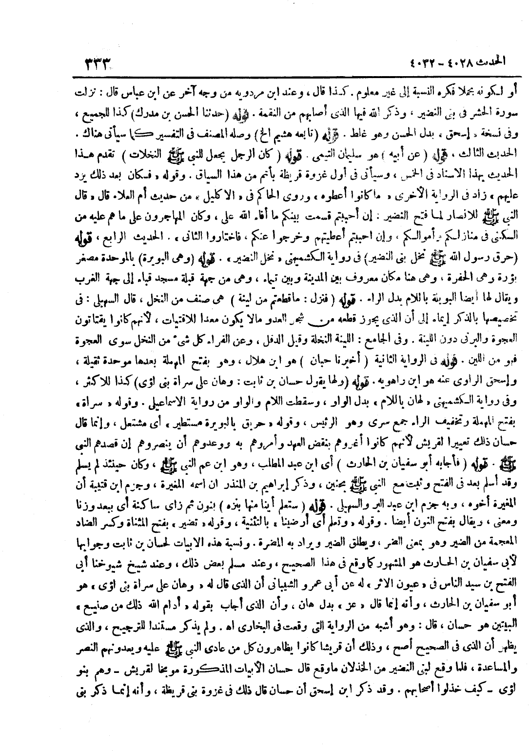 [4031] قَوْلُهُ حَرَّقَ رَسُولُ اللَّهِ صَلَّى اللَّهُ عَلَيْهِ وَسَلَّمَ نَخْلَ بَنِي النَّضِيرِ فِي رِوَايَةِ الْكُشْمِيهَنِيِّ نَخْلَ النَّضِيرِ قَوْلُهُ وَهِيَ الْبُوَيْرَةُ بِالْمُوَحَّدَةِ مُصَغَّرُ بُؤْرَةٍ وَهِيَ الْحُفْرَةُ وَهِيَ هُنَا مَكَانٌ مَعْرُوفٌ بَيْنَ الْمَدِينَةِ وَبَيْنَ تَيْمَاءَ وَهِيَ مِنْ جِهَةِ قِبْلَةِ مَسْجِدِ قَبَاءَ إِلَى جِهَةِ الْغَرْبِ وَيُقَالُ لَهَا أَيْضًا الْبُوَيْلَةُ بِاللَّامِ بَدَلَ الرَّاءِ قَوْله فَنزل مَا قطعْتُمْ من لينَة هِيَ صِنْفٌ مِنَ النَّخْلِ قَالَ السُّهَيْلِيُّ فِي تَخْصِيصِهَا بِالذِّكْرِ إِيمَاءٌ إِلَى أَنَّ الَّذِي يَجُوزُ قَطْعُهُ مِنْ شَجَرِ الْعَدُوِّ مَا لَا يَكُونُ مُعَدًّا لِلِاقْتِيَاتِ لِأَنَّهُمْ كَانُوا يَقْتَاتُونَ الْعَجْوَةَ وَالْبَرْنِيَّ دُونَ اللِّينَةِ وَفِي الْجَامِعِ اللِّينَةُ النَّخْلَةُ وَقِيلَ الدِّفْلُ وَعَنِ الْفَرَّاءِ كُلُّ شَيْءٍ مِنَ النَّخْلِ سِوَى الْعَجْوَةِ فَهُوَ مِنَ اللِّينِ قَوْلُهُ فِي الرِّوَايَة الثَّانِيَة أخبرنَا حبَان هُوَ بن هِلَالٍ وَهُوَ بِفَتْحِ الْمُهْمَلَةِ بَعْدَهَا مُوَحَّدَةٌ ثَقِيلَةٌ وَإِسْحَاق الرَّاوِي عَنهُ هُوَ بن رَاهْوَيْهِ قَوْلُهُ وَلَهَا يَقُولُ حَسَّانُ بْنُ ثَابِتٍ وَهَانَ عَلَى سَرَاةِ بَنِي لُؤَيٍّ كَذَا لِلْأَكْثَرِ وَفِي رِوَايَةِ الْكُشْمِيهَنِيِّ لَهَانَ بِاللَّامِ بَدَلَ الْوَاوِ وَسَقَطَتِ اللَّامُ وَالْوَاوُ مِنْ رِوَايَةِ الْإِسْمَاعِيلِيِّ وَقَوْلُهُ سَرَاةِ بِفَتْحِ الْمُهْمَلَةِ وَتَخْفِيفِ الرَّاءِ جَمْعُ سَرِيٍّ وَهُوَ الرَّئِيسُ وَقَوْلُهُ حَرِيقٌ بِالْبُوَيْرَةِ مُسْتَطِيرٌ أَيْ مُشْتَعِلٌ وَإِنَّمَا قَالَ حَسَّانُ ذَلِكَ تَعْيِيرًا لِقُرَيْشٍ لِأَنَّهُمْ كَانُوا أَغْرُوهُمْ بِنَقْضِ الْعَهْدِ وَأَمَرُوهُمْ بِهِ وَوَعَدُوهُمْ أَنْ يَنْصُرُوهُمْ إِنْ قَصَدَهُمُ النَّبِيُّ صَلَّى اللَّهُ عَلَيْهِ وَسَلَّمَ قَوْلُهُ فَأَجَابَهُ أَبُو سُفْيَانَ بن الْحَارِث أَي بن عبد الْمطلب وَهُوَ بن عَمِّ النَّبِيِّ صَلَّى اللَّهُ عَلَيْهِ وَسَلَّمَ وَكَانَ حِينَئِذٍ لَمْ يُسْلِمْ وَقَدْ أَسْلَمَ بَعْدُ فِي الْفَتْحِ وَثَبَتَ مَعَ النَّبِيِّ صَلَّى اللَّهُ عَلَيْهِ وَسَلَّمَ بِحُنَيْنٍ وَذَكَرَ إِبْرَاهِيمُ بْنُ الْمُنْذِرِ أَنَّ اسْمه الْمُغيرَة وَجزم بن قُتَيْبَة أَن الْمُغيرَة أَخُوهُ وَبِه جزم بن عَبْدِ الْبَرِّ وَالسُّهَيْلِيُّ قَوْلُهُ سَتَعْلَمُ أَيُّنَا مِنْهَا بِنُزْهٍ بِنُونٍ ثُمَّ زَايٍ سَاكِنَةٍ أَيْ بِبُعْدٍ وَزْنًا وَمَعْنًى وَيُقَالُ بِفَتْحِ النُّونِ أَيْضًا وَقَوْلُهُ وَتَعْلَمُ أَيَّ أَرْضَيْنَا بِالتَّثْنِيَةِ وَقَوْلُهُ تَضِيرُ بِفَتْحِ الْمُثَنَّاةِ وَكَسْرِ الضَّادِ الْمُعْجَمَةِ مِنَ الضَّيْرِ وَهُوَ بِمَعْنَى الضُّرِّ وَيُطْلَقُ الضَّيْرُ وَيُرَادُ بِهِ الْمَضَرَّةُ وَنِسْبَةُ هَذِهِ الْأَبْيَاتِ لِحَسَّانَ بْنِ ثَابِتٍ وَجَوَابُهَا لِأَبِي سُفْيَانَ بْنِ الْحَارِثِ هُوَ الْمَشْهُورُ كَمَا وَقَعَ فِي هَذَا الصَّحِيحِ وَعِنْدَ مُسْلِمٍ بَعْضُ ذَلِكَ وَعِنْدَ شَيْخِ شُيُوخِنَا أَبِي الْفَتْحِ بْنِ سَيِّدِ النَّاسِ فِي عُيُونِ الْأَثَرِ لَهُ عَنْ أَبِي عَمْرٍو الشَّيْبَانِيِّ أَنَّ الَّذِي قَالَ لَهُ وَهَانَ عَلَى سَرَاةِ بَنِي لُؤَيٍّ هُوَ أَبُو سُفْيَانَ بْنُ الْحَارِثِ وَأَنَّهُ إِنَّمَا قَالَ عَزَّ بَدَلَ هَانَ وَأَنَّ الَّذِي أَجَابَ بِقَوْلِهِ أَدَامَ اللَّهُ ذَلِكَ مِنْ صَنِيعِ الْبَيْتَيْنِ هُوَ حَسَّانُ قَالَ وَهُوَ أَشْبَهُ مِنَ الرِّوَايَةِ الَّتِي وَقَعَتْ فِي الْبُخَارِيِّ اه وَلَمْ يَذْكُرْ مُسْتَنَدًا لِلتَّرْجِيحِ وَالَّذِي يَظْهَرُ أَنَّ الَّذِي فِي الصَّحِيحِ أَصَحُّ وَذَلِكَ