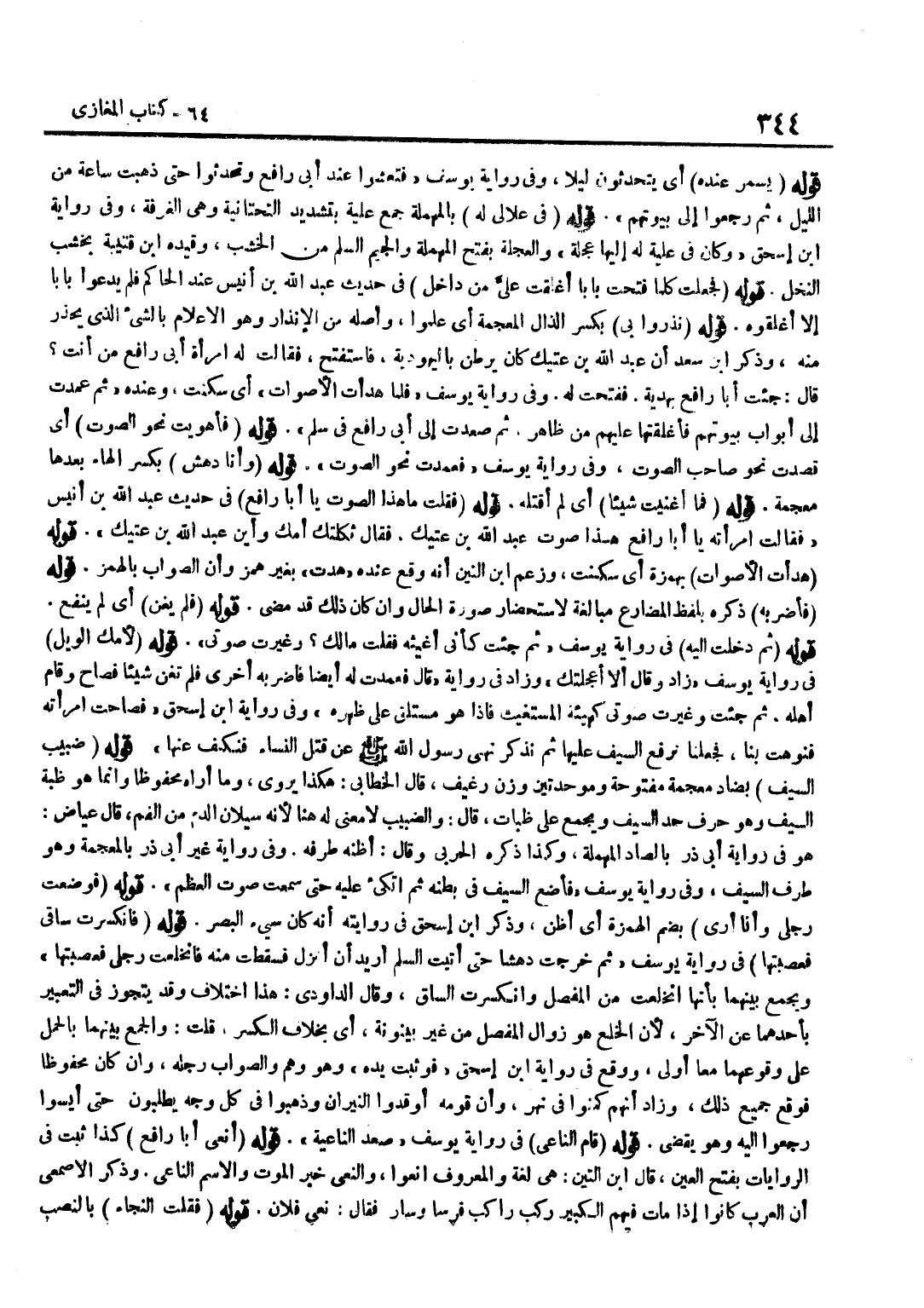 [4040] قَوْلُهُ هدأت الْأَصْوَات بِهَمْزَة أَي سكنت وَزعم بن التِّينِ أَنَّهُ وَقَعَ عِنْدَهُ هَدَتْ بِغَيْرِ هَمْزٍ وَأَنَّ الصَّوَابَ بِالْهَمْزِ قَوْلُهُ فَأَضْرِبُهُ ذَكَرَهُ بِلَفْظِ الْمُضَارِعِ مُبَالَغَةً لِاسْتِحْضَارِ صُورَةِ الْحَالِ وَإِنْ كَانَ ذَلِكَ قَدْ مَضَى قَوْلُهُ فَلَمْ يُغْنِ أَيْ لَمْ يَنْفَعْ قَوْلُهُ ثُمَّ دَخَلْتُ إِلَيْهِ فِي رِوَايَةِ يُوسُفَ ثُمَّ جِئْتُ كَأَنِّي أُغِيثُهُ فَقُلْتُ مَالك وَغَيَّرْتُ صَوْتِي قَوْلُهُ لِأُمِّكَ الْوَيْلُ فِي رِوَايَةِ يُوسُفَ زَادَ وَقَالَ أَلَا أَعْجَلْتُكَ وَزَادَ فِي رِوَايَةٍ قَالَ فَعَمَدْتُ لَهُ أَيْضًا فَأَضْرِبُهُ أُخْرَى فَلَمْ تُغْنِ شَيْئًا فَصَاحَ وَقَامَ أَهْلُهُ ثُمَّ جِئْتُ وَغَيَّرْتُ صَوْتِي كَهَيْئَةِ الْمُسْتَغِيثِ فَإِذَا هُوَ مستلق على ظَهره وَفِي رِوَايَة بن إِسْحَاقَ فَصَاحَتِ امْرَأَتُهُ فَنَوَّهَتْ بِنَا فَجَعَلْنَا نَرْفَعُ السَّيْفَ عَلَيْهَا ثُمَّ نَذْكُرُ نَهَى رَسُولُ اللَّهِ صَلَّى اللَّهُ عَلَيْهِ وَسَلَّمَ عَنْ قَتْلِ النِّسَاءِ فَنَكُفُّ عَنْهَا قَوْلُهُ ضَبِيبَ السَّيْفِ بِضَادٍ مُعْجَمَةٍ مَفْتُوحَةٍ وَمُوَحَّدَتَيْنِ وَزْنَ رَغِيفٍ قَالَ الْخَطَّابِيُّ هَكَذَا يُرْوَى وَمَا أَرَاهُ مَحْفُوظًا وَإِنَّمَا هُوَ ظُبَّةُ السَّيْف وَهُوَ حرف حد السَّيْفِ وَيُجْمَعُ عَلَى ظُبَّاتٍ قَالَ وَالضَّبِيبُ لَا مَعْنَى لَهُ هُنَا لِأَنَّهُ سَيَلَانُ الدَّمِ مِنَ الْفَمِ قَالَ عِيَاضٌ هُوَ فِي رِوَايَةِ أَبِي ذَرٍّ بِالصَّادِ الْمُهْمَلَةِ وَكَذَا ذَكَرَهُ الْحَرْبِيُّ وَقَالَ أَظُنُّهُ طَرَفَهُ وَفِي رِوَايَةِ غَيْرِ أَبِي ذَرٍّ بِالْمُعْجَمَةِ وَهُوَ طَرَفُ السَّيْفِ وَفِي رِوَايَةِ يُوسُفَ فأضع السَّيْف فِي بَطْنه ثمَّ اتكىء عَلَيْهِ حَتَّى سَمِعْتُ صَوْتَ الْعَظْمِ قَوْلُهُ فَوَضَعْتُ رِجْلِي وَأَنَا أُرَى بِضَمِّ الْهَمْزَةِ أَيْ أَظُنُّ وَذكر بن إِسْحَاق فِي رِوَايَته أَنه كَانَ سيء الْبَصَرِ قَوْلُهُ فَانْكَسَرَتْ سَاقِي فَعَصَبْتُهَا فِي رِوَايَةِ يُوسُفَ ثُمَّ خَرَجْتُ دَهِشًا حَتَّى أَتَيْتُ السُّلَّمَ أُرِيدُ أَنْ أَنْزِلَ فَسَقَطْتُ مِنْهُ فَانْخَلَعَتْ رِجْلِي فَعَصَبْتُهَا وَيُجْمَعُ بَيْنَهُمَا بِأَنَّهَا انْخَلَعَتْ مِنَ الْمِفْصَلِ وَانْكَسَرَتِ السَّاقُ وَقَالَ الدَّاوُدِيُّ هَذَا اخْتِلَافٌ وَقَدْ يُتَجَوَّزُ فِي التَّعْبِيرِ بِأَحَدِهِمَا عَنِ الْآخَرِ لِأَنَّ الْخَلْعَ هُوَ زَوَالُ الْمِفْصَلِ مِنْ غَيْرِ بَيْنُونَةٍ أَيْ بِخِلَافِ الْكَسْرِ قُلْتُ وَالْجَمْعُ بَيْنَهُمَا بِالْحَمْلِ عَلَى وُقُوعِهِمَا مَعًا أَوْلَى وَوَقَعَ فِي رِوَايَةِ بن إِسْحَاقَ فَوَثَبَتْ يَدُهُ وَهُوَ وَهَمٌ وَالصَّوَابُ رِجْلُهُ وَإِنْ كَانَ مَحْفُوظًا فَوَقَعَ جَمِيعُ ذَلِكَ وَزَادَ أَنَّهُمْ كَمَنُوا فِي نَهَرٍ وَأَنَّ قَوْمَهُ أَوْقَدُوا النِّيرَانَ وَذَهَبُوا فِي كُلِّ وَجْهٍ يَطْلُبُونَ حَتَّى أَيِسُوا رَجَعُوا إِلَيْهِ وَهُوَ يَقْضِي قَوْلُهُ قَامَ النَّاعِي فِي رِوَايَةِ يُوسُفَ صَعِدَ النَّاعِيَةُ قَوْلُهُ أَنْعَى أَبَا رَافِعٍ كَذَا ثَبَتَ فِي الرِّوَايَاتِ بِفَتْح الْعين قَالَ بن التِّينِ هِيَ لُغَةٌ وَالْمَعْرُوفُ انْعُوا وَالنَّعْيُ خَبَرُ الْمَوْتِ وَالِاسْمُ النَّاعِي وَذَكَرَ الْأَصْمَعِيُّ أَنَّ الْعَرَبَ كَانُوا إِذَا مَاتَ فِيهِمُ الْكَبِيرُ رَكِبَ رَاكِبٌ فَرَسًا وَسَارَ فَقَالَ نَعْيُ فُلَانٍ قَوْلُهُ فَقُلْتُ النَّجَاء بِالنّصب