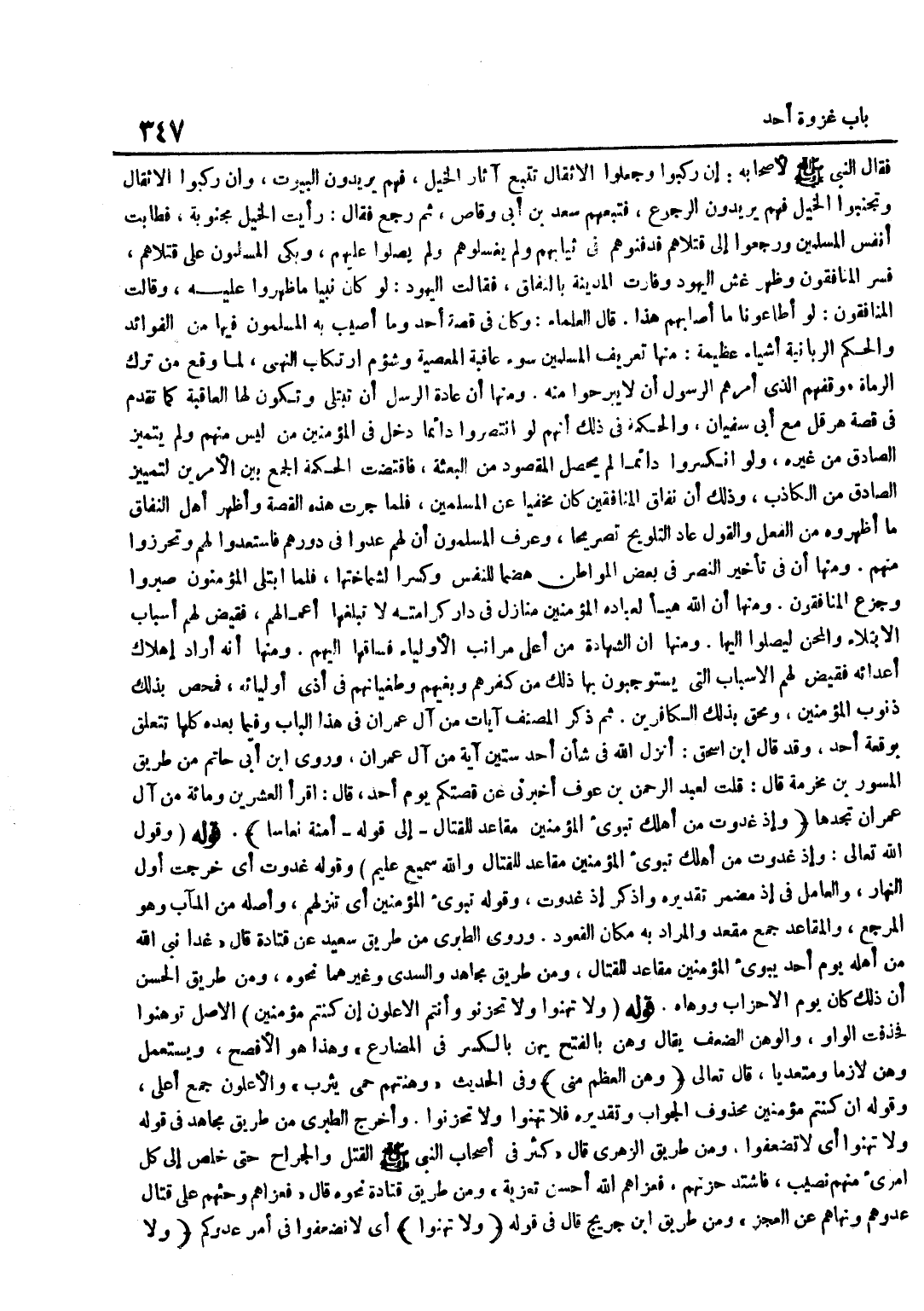 فَقَالَ النَّبِيُّ صَلَّى اللَّهُ عَلَيْهِ وَسَلَّمَ لِأَصْحَابِهِ إِنْ رَكِبُوا وَجَعَلُوا الْأَثْقَالَ تَتَبَّعُ آثَارَ الْخَيْلِ فَهُمْ يُرِيدُونَ الْبُيُوتَ وَإِنْ رَكِبُوا الْأَثْقَالَ وَتَجَنَّبُوا الْخَيْلَ فَهُمْ يُرِيدُونَ الرُّجُوعَ فَتَبِعَهُمْ سَعْدُ بْنُ أَبِي وَقَّاصٍ ثُمَّ رَجَعَ فَقَالَ رَأَيْتُ الْخَيْلَ مَجْنُوبَةً فَطَابَتْ أَنْفُسُ الْمُسْلِمِينَ وَرَجَعُوا إِلَى قَتْلَاهُمْ فَدَفَنُوهُمْ فِي ثِيَابِهِمْ وَلَمْ يُغَسِّلُوهُمْ وَلَمْ يُصَلُّوا عَلَيْهِمْ وَبَكَى الْمُسْلِمُونَ عَلَى قَتْلَاهُمْ فَسُرَّ الْمُنَافِقُونَ وَظَهَرَ غِشُّ الْيَهُودِ وَفَارَتْ الْمَدِينَةُ بِالنِّفَاقِ فَقَالَتِ الْيَهُودُ لَوْ كَانَ نَبِيًّا مَا ظَهَرُوا عَلَيْهِ وَقَالَتِ الْمُنَافِقُونَ لَوْ أَطَاعُونَا مَا أَصَابَهُمْ هَذَا قَالَ الْعُلَمَاءُ وَكَانَ فِي قِصَّةِ أُحُدٍ وَمَا أُصِيبَ بِهِ الْمُسْلِمُونَ فِيهَا مِنَ الْفَوَائِدِ وَالْحِكَمِ الرَّبَّانِيَّةِ أَشْيَاءٌ عَظِيمَةٌ مِنْهَا تَعْرِيفُ الْمُسْلِمِينَ سُوءَ عَاقِبَةِ الْمَعْصِيَةِ وَشُؤْمِ ارْتِكَابِ النَّهْيِ لِمَا وَقَعَ مِنْ تَرْكِ الرُّمَاةِ مَوْقِفَهُمُ الَّذِي أَمَرَهُمُ الرَّسُولُ أَنْ لَا يَبْرَحُوا مِنْهُ وَمِنْهَا أَنَّ عَادَةَ الرُّسُلِ أَنْ تُبْتَلَى وَتَكُونَ لَهَا الْعَاقِبَةُ كَمَا تَقَدَّمَ فِي قِصَّةِ هِرَقْلَ مَعَ أَبِي سُفْيَانَ وَالْحِكْمَةُ فِي ذَلِكَ أَنَّهُمْ لَوِ انْتَصَرُوا دَائِمًا دَخَلَ فِي الْمُؤْمِنِينَ مَنْ لَيْسَ مِنْهُمْ وَلَمْ يَتَمَيَّزِ الصَّادِقُ مِنْ غَيْرِهِ وَلَوِ انْكَسَرُوا دَائِمًا لَمْ يَحْصُلِ الْمَقْصُودُ مِنَ الْبَعْثَةِ فَاقْتَضَتِ الْحِكْمَةُ الْجَمْعَ بَيْنَ الْأَمْرَيْنِ لِتَمْيِيزِ الصَّادِقِ مِنَ الْكَاذِبِ وَذَلِكَ أَنَّ نِفَاقَ الْمُنَافِقِينَ كَانَ مَخْفِيًّا عَنِ الْمُسْلِمِينَ فَلَمَّا جَرَتْ هَذِهِ الْقِصَّةُ وَأَظْهَرَ أَهْلُ النِّفَاقِ مَا أَظْهَرُوهُ مِنَ الْفِعْلِ وَالْقَوْلِ عَادَ التَّلْوِيحُ تَصْرِيحًا وَعَرَفَ الْمُسْلِمُونَ أَنَّ لَهُمْ عَدُوًّا فِي دُورِهِمْ فَاسْتَعَدُّوا لَهُمْ وَتَحَرَّزُوا مِنْهُمْ وَمِنْهَا أَنَّ فِي تَأْخِيرِ النَّصْرِ فِي بَعْضِ الْمَوَاطِنِ هَضْمًا لِلنَّفْسِ وَكَسْرًا لِشَمَاخَتِهَا فَلَمَّا ابْتُلِيَ الْمُؤْمِنُونَ صَبَرُوا وَجَزِعَ الْمُنَافِقُونَ وَمِنْهَا أَنَّ اللَّهَ هَيَّأَ لِعِبَادِهِ الْمُؤْمِنِينَ مَنَازِلَ فِي دَارِ كَرَامَتِهِ لَا تَبْلُغُهَا أَعْمَالُهُمْ فَقَيَّضَ لَهُمْ أَسْبَابَ الِابْتِلَاءِ وَالْمِحَنِ لِيَصِلُوا إِلَيْهَا وَمِنْهَا أَنَّ الشَّهَادَةَ مِنْ أَعْلَى مَرَاتِبِ الْأَوْلِيَاءِ فَسَاقَهَا إِلَيْهِمْ وَمِنْهَا أَنَّهُ أَرَادَ إِهْلَاكَ أَعْدَائِهِ فَقَيَّضَ لَهُمُ الْأَسْبَابَ الَّتِي يَسْتَوْجِبُونَ بِهَا ذَلِكَ مِنْ كُفْرِهِمْ وَبَغْيِهِمْ وَطُغْيَانِهِمْ فِي أَذَى أَوْلِيَائِهِ فَمَحَّصَ بِذَلِكَ ذُنُوبَ الْمُؤْمِنِينَ وَمَحَقَ بِذَلِكَ الْكَافِرِينَ ثُمَّ ذَكَرَ الْمُصَنِّفُ آيَاتٍ مِنْ آلِ عِمْرَانَ فِي هَذَا الْبَابِ وَفِيمَا بَعْدَهُ كلهَا تتَعَلَّق بوقعة أحد وَقد قَالَ بن إِسْحَاقَ أَنْزَلَ اللَّهُ فِي شَأْنِ أُحُدٍ سِتِّينَ آيَة من آل عمرَان وروى بن أَبِي حَاتِمٍ مِنْ طَرِيقِ الْمِسْوَرِ بْنِ مَخْرَمَةَ قَالَ قُلْتُ لِعَبْدِ الرَّحْمَنِ بْنِ عَوْفٍ أَخْبِرْنِي عَنْ قِصَّتِكُمْ يَوْمَ أُحُدٍ قَالَ اقْرَأِ الْعِشْرِينَ وَمِائَةً مِنْ آلِ عِمْرَانَ تَجِدُهَا وَإِذْ غَدَوْتَ من أهلك تبويء الْمُؤمنِينَ مقاعد لِلْقِتَالِ إِلَى قَوْله آمِنَة نعاسا قَوْلُهُ وَقَوْلُ اللَّهِ تَعَالَى وَإِذْ غَدَوْتَ مِنْ أهلك تبويء الْمُؤمنِينَ مقاعد لِلْقِتَالِ