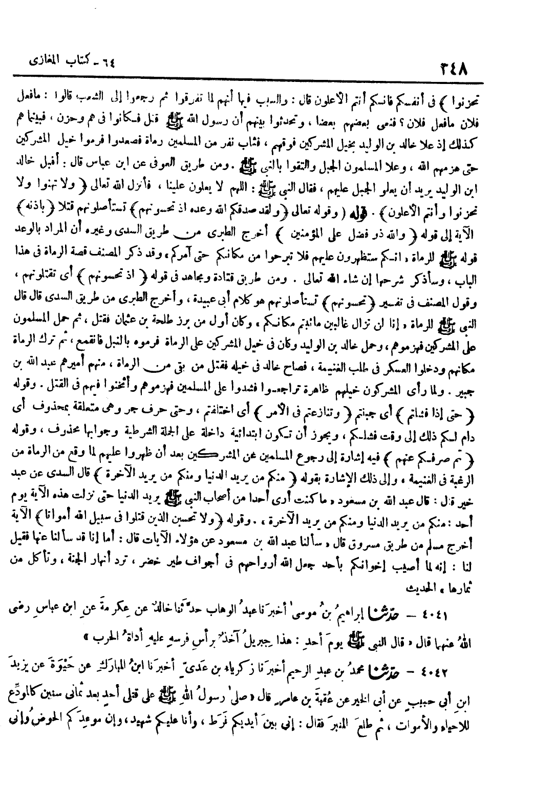 تحزنوا فِي أَنْفُسِكُمْ فَإِنَّكُمْ أَنْتُمُ الْأَعْلَوْنَ قَالَ وَالسَّبَبُ فِيهَا أَنَّهُمْ لَمَّا تَفَرَّقُوا ثُمَّ رَجَعُوا إِلَى الشِّعْبِ قَالُوا مَا فَعَلَ فُلَانٌ مَا فَعَلَ فُلَانٌ فَنَعَى بَعْضُهُمْ بَعْضًا وَتَحَدَّثُوا بَيْنَهُمْ أَنَّ رَسُولَ اللَّهِ صَلَّى اللَّهُ عَلَيْهِ وَسَلَّمَ قُتِلَ فَكَانُوا فِي هَمٍّ وَحُزْنٍ فَبَيْنَمَا هُمْ كَذَلِكَ إِذْ عَلَا خَالِدُ بْنُ الْوَلِيدِ بِخَيْلِ الْمُشْرِكِينَ فَوْقَهُمْ فَثَابَ نَفَرٌ مِنَ الْمُسْلِمِينَ رُمَاةٌ فَصَعِدُوا فَرَمَوْا خَيْلَ الْمُشْرِكِينَ حَتَّى هَزَمَهُمُ اللَّهُ وَعَلَا الْمُسْلِمُونَ الْجَبَلَ وَالْتَقَوْا بِالنَّبِيِّ صَلَّى اللَّهُ عَلَيْهِ وَسلم وَمن طَرِيق الْعَوْفِيّ عَن بن عَبَّاسٍ قَالَ أَقْبَلَ خَالِدُ بْنُ الْوَلِيدِ يُرِيدُ أَن يعلوا الْجَبَلَ عَلَيْهِمْ فَقَالَ النَّبِيُّ صَلَّى اللَّهُ عَلَيْهِ وَسَلَّمَ اللَّهُمَّ لَا يَعْلُوَنَّ عَلَيْنَا فَأَنْزَلَ اللَّهُ تَعَالَى وَلَا تَهِنُوا وَلَا تَحْزَنُوا وَأَنْتُمُ الْأَعْلَوْنَ قَوْلُهُ وَقَوْلُهُ تَعَالَى وَلَقَدْ صَدَقَكُمُ اللَّهُ وَعْدَهُ إِذْ تحسونهم تَسْتَأْصِلُونَهُمْ قَتْلًا بِإِذْنِهِ الْآيَةَ إِلَى قَوْلِهِ وَاللَّهُ ذُو فضل على الْمُؤمنِينَ أَخْرَجَ الطَّبَرِيُّ مِنْ طَرِيقِ السُّدِّيِّ وَغَيْرِهِ أَنَّ الْمُرَادَ بِالْوَعْدِ قَوْلُهُ صَلَّى اللَّهُ عَلَيْهِ وَسَلَّمَ لِلرُّمَاةِ إِنَّكُمْ سَتَظْهَرُونَ عَلَيْهِمْ فَلَا تَبْرَحُوا مِنْ مَكَانِكُمْ حَتَّى آمُرَكُمْ وَقَدْ ذَكَرَ الْمُصَنِّفُ قِصَّةَ الرُّمَاةِ فِي هَذَا الْبَابِ وَسَأَذْكُرُ شَرْحَهَا إِنْ شَاءَ اللَّهُ تَعَالَى وَمِنْ طَرِيقِ قَتَادَةَ وَمُجَاهِدٍ فِي قَوْله إِذْ تحسونهم أَيْ تَقْتُلُونَهُمْ وَقَوْلُ الْمُصَنِّفِ فِي تَفْسِيرِ تَحُسُّونَهُمْ تَسْتَأْصِلُونَهُمْ هُوَ كَلَامُ أَبِي عُبَيْدَةَ وَأَخْرَجَ الطَّبَرِيُّ مِنْ طَرِيقِ السُّدِّيِّ قَالَ قَالَ النَّبِيُّ صَلَّى اللَّهُ عَلَيْهِ وَسَلَّمَ لِلرُّمَاةِ إِنَّا لَنْ نَزَالَ غَالِبِينَ مَا ثَبَتُّمْ مَكَانَكُمْ وَكَانَ أَوَّلَ مَنْ بَرَزَ طَلْحَةُ بْنُ عُثْمَانَ فَقُتِلَ ثُمَّ حَمَلَ الْمُسْلِمُونَ عَلَى الْمُشْرِكِينَ فَهَزَمُوهُمْ وَحَمَلَ خَالِدُ بْنُ الْوَلِيدِ وَكَانَ فِي خَيْلِ الْمُشْرِكِينَ عَلَى الرُّمَاةِ فَرَمَوْهُ بِالنَّبْلِ فَانْقَمَعَ ثُمَّ تَرَكَ الرُّمَاةُ مَكَانَهُمْ وَدَخَلُوا الْعَسْكَرَ فِي طَلَبِ الْغَنِيمَةِ فَصَاحَ خَالِدٌ فِي خَيْلِهِ فَقَتَلَ مَنْ بَقِيَ مِنَ الرُّمَاةِ مِنْهُمْ أَمِيرُهُمْ عَبْدُ اللَّهِ بْنُ جُبَيْرٍ وَلَمَّا رَأَى الْمُشْرِكُونَ خَيْلَهُمْ ظَاهِرَةً تَرَاجَعُوا فَشَدُّوا عَلَى الْمُسلمين فهزموهم وأثخنوا فيهم فِي الْقَتْل وَقَوله حَتَّى إِذا فشلتم أَي جبنتم وتنازعتم فِي الْأَمر أَيِ اخْتَلَفْتُمْ وَحَتَّى حَرْفُ جَرٍّ وَهِيَ مُتَعَلِّقَةٌ بِمَحْذُوفٍ أَيْ دَامَ لَكُمْ ذَلِكَ إِلَى وَقْتِ فَشَلِكُمْ وَيَجُوزُ أَنْ تَكُونَ ابْتِدَائِيَّةً دَاخِلَةً عَلَى الْجُمْلَة الشّرطِيَّة وجوابها مَحْذُوف وَقَوله تمّ صرفكم عَنْهُم فِيهِ إِشَارَةٌ إِلَى رُجُوعِ الْمُسْلِمِينَ عَنِ الْمُشْرِكِينَ بَعْدَ أَنْ ظَهَرُوا عَلَيْهِمْ لِمَا وَقَعَ مِنَ الرُّمَاةِ مِنَ الرَّغْبَةِ فِي الْغَنِيمَةِ وَإِلَى ذَلِكَ الْإِشَارَةُ بِقَوْلِهِ مِنْكُمْ مَنْ يُرِيدُ الدُّنْيَا وَمِنْكُمْ من يُرِيد الْآخِرَة قَالَ السُّدِّيُّ عَنْ عَبْدِ خَيْرٍ قَالَ قَالَ عَبْدُ اللَّهِ بْنُ مَسْعُودٍ مَا كُنْتُ أَرَى أَحَدًا مِنْ أَصْحَابِ النَّبِيِّ صَلَّى اللَّهُ عَلَيْهِ وَسَلَّمَ يُرِيدُ الدُّنْيَا حَتَّى نَزَلَتْ هَذِهِ الْآيَةُ يَوْمَ أُحُدٍ مِنْكُمْ مَنْ يُرِيدُ ال
