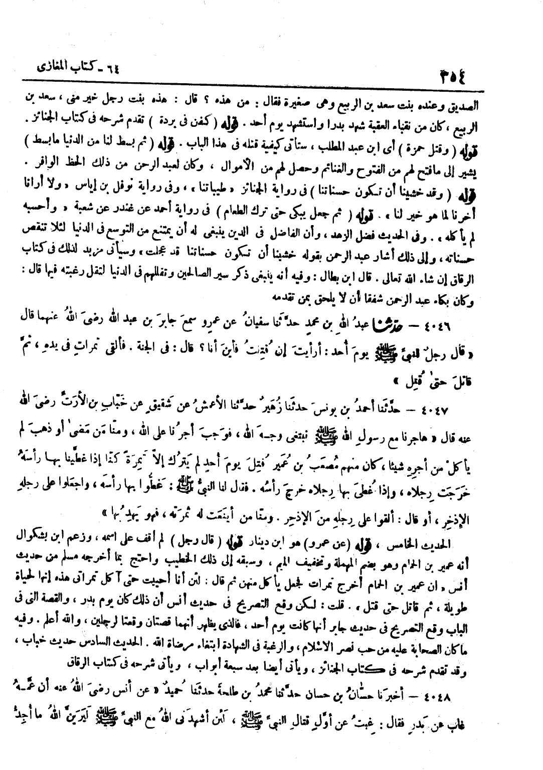 [4046] قَوْله عَن عَمْرو هُوَ بن دِينَارٍ قَوْلُهُ قَالَ رَجُلٌ لَمْ أَقِفْ عَلَى اسْمِهِ وَزعم بن بَشْكُوَالٍ أَنَّهُ عُمَيْرُ بْنُ الْحُمَامِ وَهُوَ بِضَمِّ الْمُهْمَلَةِ وَتَخْفِيفِ الْمِيمِ وَسَبَقَهُ إِلَى ذَلِكَ الْخَطِيبُ وَاحْتَجَّ بِمَا أَخْرَجَهُ مُسْلِمٌ مِنْ حَدِيثِ أَنَسٍ أَنَّ عُمَيْرَ بْنَ الْحُمَامِ أَخْرَجَ تَمَرَاتٍ فَجَعَلَ يَأْكُلُ مِنْهُنَّ ثُمَّ قَالَ لَئِنْ أَنَا أُحْيِيتُ حَتَّى آكُلَ تَمَرَاتِي هَذِهِ إِنَّهَا لَحَيَاةٌ طَوِيلَةٌ ثُمَّ قَاتَلَ حَتَّى قُتِلَ قُلْتُ لَكِنْ وَقَعَ التَّصْرِيحُ فِي حَدِيثِ أَنَسٍ أَنَّ ذَلِكَ كَانَ يَوْمَ بَدْرٍ وَالْقِصَّةُ الَّتِي فِي الْبَابِ وَقَعَ التَّصْرِيحُ فِي حَدِيثِ جَابِرٍ أَنَّهَا كَانَتْ يَوْمَ أُحُدٍ فَالَّذِي يَظْهَرُ أَنَّهُمَا قِصَّتَانِ وَقَعَتَا لِرَجُلَيْنِ وَاللَّهُ أَعْلَمُ وَفِيهِ مَا كَانَ الصَّحَابَةُ عَلَيْهِ مِنْ حُبِّ نَصْرِ الْإِسْلَامِ وَالرَّغْبَةِ فِي الشَّهَادَةِ ابْتِغَاءَ مَرْضَاةِ اللَّهِ الْحَدِيثُ السَّادِسُ حَدِيثُ خَبَّابٍ وَقَدْ تَقَدَّمَ شَرْحُهُ فِي كِتَابِ الْجَنَائِزِ وَيَأْتِي أَيْضًا بَعْدَ سَبْعَةِ أَبْوَابٍ وَيَأْتِي شَرْحُهُ فِي كتاب الرقَاق