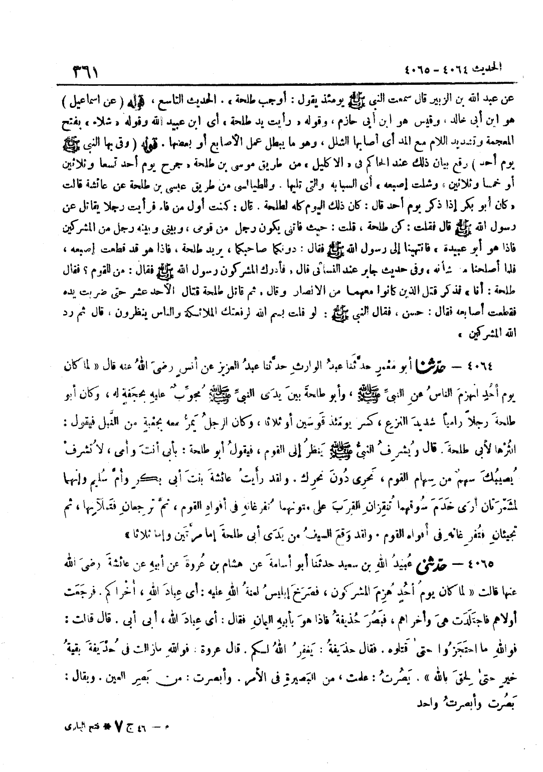 [4063] قَوْله عَن إِسْمَاعِيل هُوَ بن أبي خَالِد وَقيس هُوَ بن أَبِي حَازِمٍ وَقَوْلُهُ رَأَيْتُ يَدَ طَلْحَةَ أَيِ بن عُبَيْدِ اللَّهِ وَقَوْلُهُ شَلَّاءَ بِفَتْحِ الْمُعْجَمَةِ وَتَشْدِيدِ اللَّامِ مَعَ الْمَدِّ أَيْ أَصَابَهَا الشَّلَلُ وَهُوَ مَا يُبْطِلُ عَمَلَ الْأَصَابِعِ أَوْ بَعْضِهَا قَوْلُهُ وَقَى بِهَا النَّبِيَّ صَلَّى اللَّهُ عَلَيْهِ وَسَلَّمَ يَوْمَ أُحُدٍ وَقَعَ بَيَانُ ذَلِكَ عِنْدَ الْحَاكِمِ فِي الْإِكْلِيلِ مِنْ طَرِيقِ مُوسَى بْنِ طَلْحَةَ جُرِحَ يَوْمَ أُحُدٍ تِسْعًا وَثَلَاثِينَ أَوْ خَمْسًا وَثَلَاثِينَ وَشُلَّتْ إِصْبَعُهُ أَيِ السَّبَّابَةُ وَالَّتِي تَلِيهَا وَلِلطَّيَالِسِيِّ مِنْ طَرِيقِ عِيسَى بْنِ طَلْحَةَ عَنْ عَائِشَةَ قَالَتْ كَانَ أَبُو بَكْرٍ إِذَا ذَكَرَ يَوْمَ أُحُدٍ قَالَ كَانَ ذَلِكَ الْيَوْمُ كُلُّهُ لِطَلْحَةَ قَالَ كُنْتُ أَوَّلَ مَنْ فَاءَ فَرَأَيْتُ رَجُلًا يُقَاتِلُ عَنْ رَسُولِ اللَّهِ صَلَّى اللَّهُ عَلَيْهِ وَسَلَّمَ قَالَ فَقُلْتُ كُنْ طَلْحَةَ قُلْتُ حَيْثُ فَاتَنِي يَكُونُ رَجُلٌ مِنْ قَوْمِي وَبَيْنِي وَبَيْنَهُ رَجُلٌ مِنَ الْمُشْرِكِينَ فَإِذَا هُوَ أَبُو عُبَيْدَةَ فَانْتَهَيْنَا إِلَى رَسُولِ اللَّهِ صَلَّى اللَّهُ عَلَيْهِ وَسَلَّمَ فَقَالَ دُونَكُمَا صَاحِبُكُمَا يُرِيدُ طَلْحَةَ فَإِذَا هُوَ قَدْ قُطِعَتْ إِصْبَعُهُ فَلَمَّا أَصْلَحْنَا مِنْ شَأْنِهِ وَفِي حَدِيثِ جَابِرٍ عِنْدَ النَّسَائِيِّ قَالَ فَأَدْرَكَ الْمُشْرِكُونَ رَسُولِ اللَّهِ صَلَّى اللَّهُ عَلَيْهِ وَسَلَّمَ فَقَالَ مَنْ لِلْقَوْمِ فَقَالَ طَلْحَةُ أَنَا فَذَكَرَ قَتْلَ الَّذِينَ كَانُوا مَعَهُمَا مِنَ الْأَنْصَارِ وَقَالَ ثُمَّ قَاتَلَ طَلْحَةُ قِتَالَ الْأَحَدَ عَشَرَ حَتَّى ضُرِبَتْ يَدُهُ فَقُطِعَتْ أَصَابِعُهُ فَقَالَ حَسَنٌ فَقَالَ النَّبِيُّ صَلَّى اللَّهُ عَلَيْهِ وَسَلَّمَ لَوِ قُلْتَ بِسْمِ اللَّهِ لَرَفَعَتْكَ الْمَلَائِكَةُ وَالنَّاسُ يَنْظُرُونَ قَالَ ثُمَّ رَدَّ اللَّهُ الْمُشْرِكِينَ