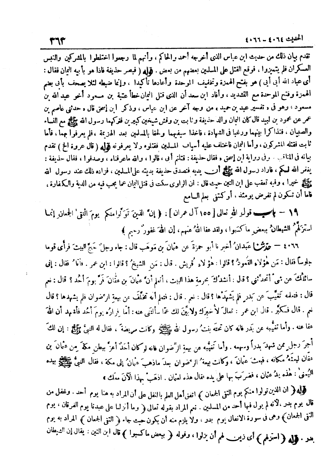 تقدم بَيَان ذَلِك من حَدِيث بن عَبَّاسٍ الَّذِي أَخْرَجَهُ أَحْمَدُ وَالْحَاكِمُ وَأَنَّهُمْ لَمَّا رَجَعُوا اخْتَلَطُوا بِالْمُشْرِكِينَ وَالْتَبَسَ الْعَسْكَرَانِ فَلَمْ يَتَمَيَّزُوا فَوَقَعَ الْقَتْلُ عَلَى الْمُسْلِمِينَ بَعْضُهُمْ مِنْ بَعْضٍ قَوْلُهُ فَبَصُرَ حُذَيْفَةُ فَإِذَا هُوَ بِأَبِيهِ الْيَمَانِ فَقَالَ أَيْ عِبَادَ اللَّهِ أَبِي أَبِي هُوَ بِفَتْحِ الْهَمْزَةِ وَتَخْفِيفِ الْمُوَحَّدَةِ وَأَعَادَهَا تَأْكِيدًا وَإِنَّمَا ضَبَطَهُ لِئَلَّا يُصَحَّفَ بِأُبَيٍّ بِضَمِّ الْهَمْزَةِ وَفَتْحِ الْمُوَحدَة مَعَ التَّشْدِيد وَأفَاد بن سَعْدٍ أَنَّ الَّذِي قَتَلَ الْيَمَانَ خَطَأً عُتْبَةُ بْنُ مَسْعُودٍ أَخُو عَبْدِ اللَّهِ بْنِ مَسْعُودٍ وَهُوَ فِي تَفْسِيرِ عَبْدِ بْنِ حُمَيْدٍ مِنْ وَجْهٍ آخَرَ عَنْ بن عَبَّاس وَذكر بن إِسْحَاقَ قَالَ حَدَّثَنِي عَاصِمِ بْنِ عُمَرَ عَنْ مَحْمُودِ بْنِ لَبِيدٍ قَالَ كَانَ الْيَمَانُ وَالِدُ حُذَيْفَةَ وَثَابِتُ بْنُ وَقْشٍ شَيْخَيْنِ كَبِيرَيْنِ فَتَرَكَهُمَا رَسُولُ اللَّهِ صَلَّى اللَّهُ عَلَيْهِ وَسَلَّمَ مَعَ النِّسَاءِ وَالصِّبْيَانِ فَتَذَاكَرَا بَيْنَهُمَا وَرَغِبَا فِي الشَّهَادَةِ فَأَخَذَا سَيْفَيْهِمَا وَلَحِقَا بِالْمُسْلِمِينَ بَعْدَ الْهَزِيمَةِ فَلَمْ يَعْرِفُوا بِهِمَا فَأَمَّا ثَابِتٌ فَقَتَلَهُ الْمُشْرِكُونَ وَأَمَّا الْيَمَانُ فَاخْتَلَفَ عَلَيْهِ أَسْيَافُ الْمُسْلِمِينَ فَقَتَلُوهُ وَلَا يَعْرِفُونَهُ قَوْلُهُ قَالَ عُرْوَةُ إِلَخْ تَقَدَّمَ بَيَانُهُ فِي المناقب وَفِي رِوَايَة بن إِسْحَاقَ فَقَالَ حُذَيْفَةُ قَتَلْتُمْ أَبِي قَالُوا وَاللَّهِ مَا عَرَفْنَاهُ وَصَدَقُوا فَقَالَ حُذَيْفَةُ يَغْفِرُ اللَّهُ لَكُمْ فَأَرَادَ رَسُولُ اللَّهِ صَلَّى اللَّهُ عَلَيْهِ وَسَلَّمَ أَنْ يَدِيَهُ فَتَصَدَّقَ حُذَيْفَةُ بِدِيَتِهِ عَلَى الْمُسْلِمِينَ فَزَادَهُ ذَلِكَ عِنْدَ رَسُولِ اللَّهِ صَلَّى اللَّهُ عَلَيْهِ وَسَلَّمَ خَيْرًا وَفِيهِ تَعَقُّبٌ عَلَى بن التِّينِ حَيْثُ قَالَ إِنَّ الرَّاوِيَ سَكَتَ فِي قَتْلِ الْيَمَانِ عَمَّا يَجِبُ فِيهِ مِنَ الدِّيَةِ وَالْكَفَّارَةِ فَإِمَّا أَنْ تَكُونَ لَمْ تُفْرَضْ يَوْمَئِذٍ أَو اكْتفى بِعلم السَّامع