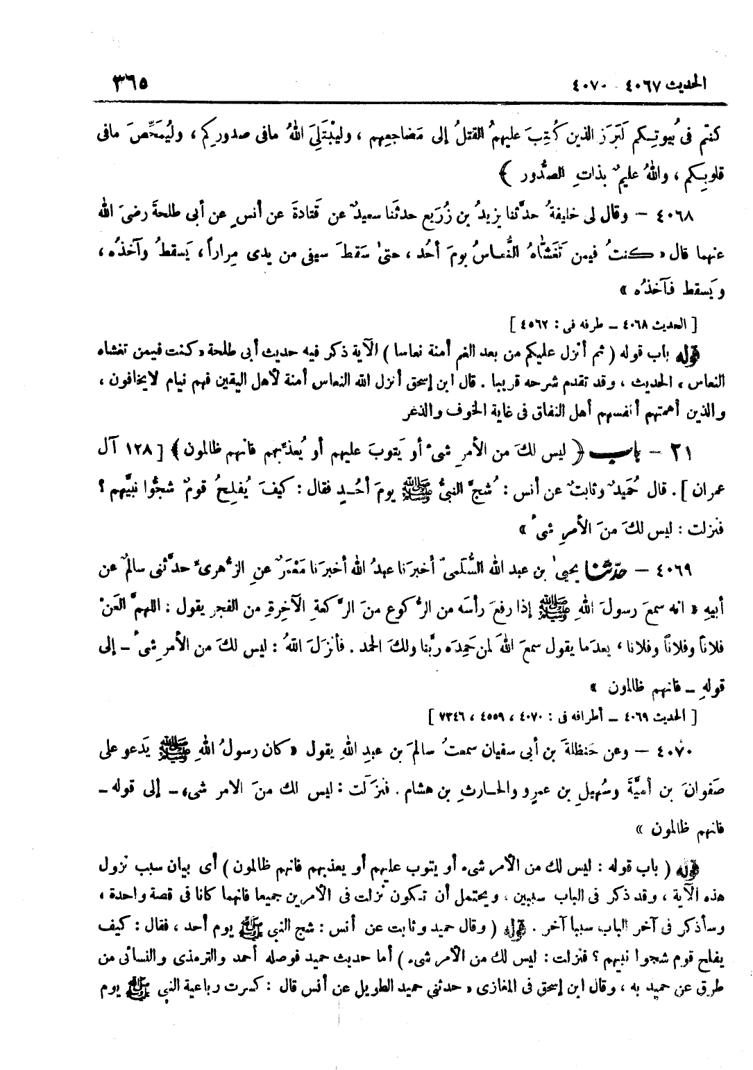 الْآيَةَ ذَكَرَ فِيهِ حَدِيثَ أَبِي طَلْحَةَ كُنْتُ فِيمَنْ تَغَشَّاهُ النُّعَاسُ الْحَدِيثَ وَقَدْ تَقَدَّمَ شَرْحُهُ قَرِيبا قَالَ بن إِسْحَاقَ أَنْزَلَ اللَّهُ النُّعَاسَ أَمَنَةً لِأَهْلِ الْيَقِينِ فَهُمْ نِيَامٌ لَا يَخَافُونَ وَالَّذِينَ أَهَمَّتْهُمْ أَنْفُسُهُمْ أهل النِّفَاق فِي غَايَة الْخَوْف والذعر قَوْلُهُ بَابُ قَوْلِهِ لَيْسَ لَكَ مِنَ الْأَمْرِ شَيْءٌ أَوْ يَتُوبَ عَلَيْهِمْ أَوْ يُعَذِّبَهُمْ فَإِنَّهُمْ ظَالِمُونَ أَيْ بَيَانُ سَبَبِ نُزُولِ هَذِهِ الْآيَةِ وَقَدْ ذَكَرَ فِي الْبَابِ سَبَبَيْنِ وَيُحْتَمَلُ أَنْ تَكُونَ نَزَلَتْ فِي الْأَمْرَيْنِ جَمِيعًا فَإِنَّهُمَا كَانَا فِي قِصَّةٍ وَاحِدَةٍ وَسَأَذْكُرُ فِي آخِرِ الْبَابِ سَبَبًا آخَرَ قَوْلُهُ وَقَالَ حُمَيْدٌ وَثَابِتٌ عَنْ أَنَسٍ شُجَّ النَّبِيُّ صَلَّى اللَّهُ عَلَيْهِ وَسَلَّمَ يَوْمَ أُحُدٍ فَقَالَ كَيْفَ يُفْلِحُ قَوْمٌ شَجُّوا نَبِيَّهُمْ فَنزلت لَيْسَ لَك من الْأَمر شَيْء أَمَّا حَدِيثُ حُمَيْدٍ فَوَصَلَهُ أَحْمَدُ وَالتِّرْمِذِيُّ وَالنَّسَائِيُّ من طرق عَن حميد بِهِ وَقَالَ بن إِسْحَاقَ فِي الْمَغَازِي حَدَّثَنِي حُمَيْدٌ الطَّوِيلُ عَنْ أَنَسٍ قَالَ كُسِرَتْ رَبَاعِيَةُ النَّبِيِّ صَلَّى اللَّهُ عَلَيْهِ وَسَلَّمَ يَوْمَ
