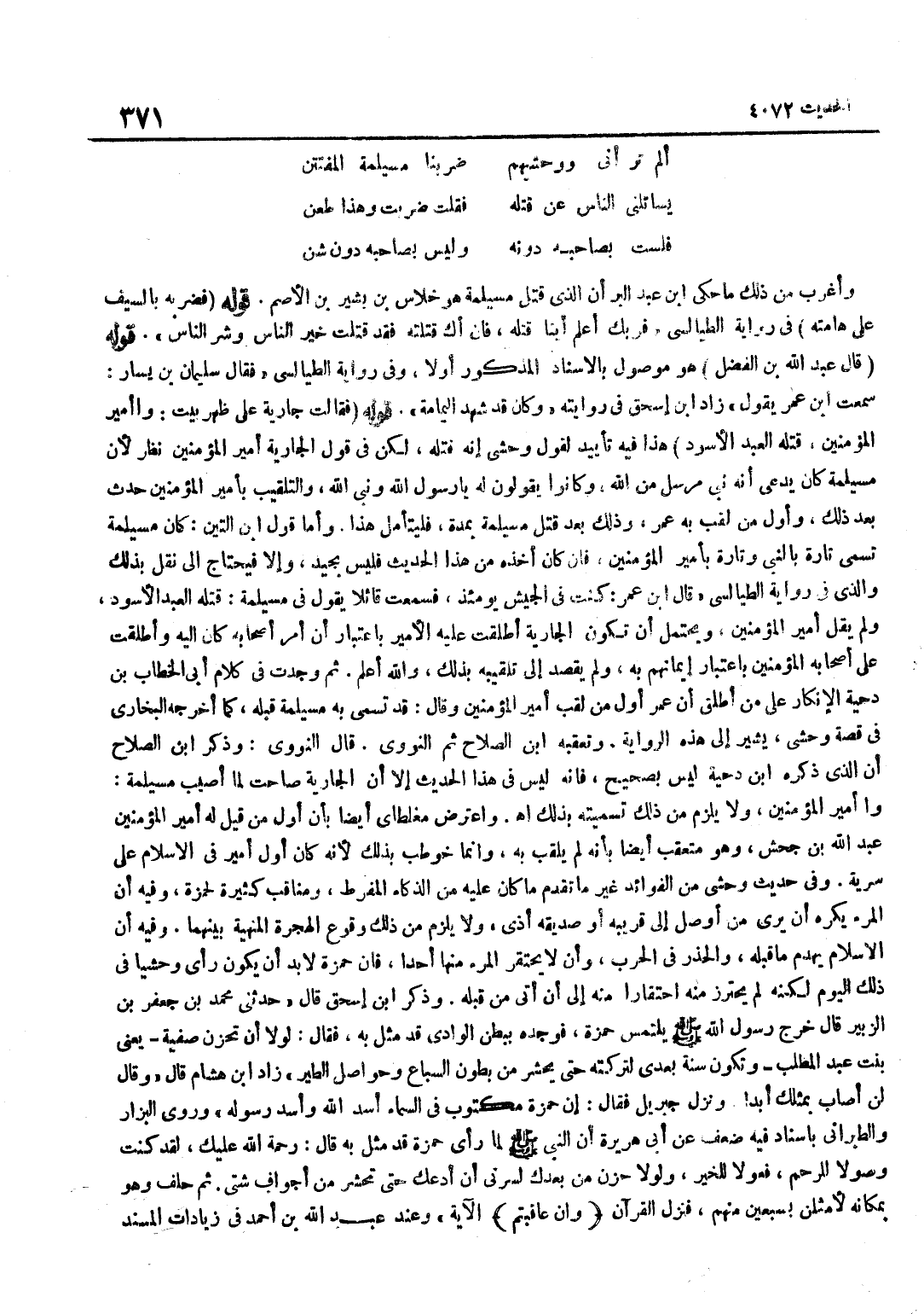 أَلَمْ تَرَ أَنِّي وَوَحْشِيَّهُمْ ضَرَبْنَا مُسَيْلِمَةَ الْمُفَتَتَنْ يُسَائِلُنِي النَّاسُ عَنْ قَتْلِهِ فَقُلْتُ ضَرَبْتُ وَهَذَا طَعَنْ فَلَسْتُ بِصَاحِبِهِ دُونَهُ وَلَيْسَ بِصَاحِبِهِ دُونَ شن وَأغْرب من ذَلِك مَا حكى بن عَبْدِ الْبَرِّ أَنَّ الَّذِي قَتَلَ مُسَيْلِمَةَ هُوَ خِلَاسُ بْنُ بَشِيرِ بْنِ الْأَصَمِّ قَوْلُهُ فَضَرَبَهُ بِالسَّيْفِ عَلَى هَامَتِهِ فِي رِوَايَةِ الطَّيَالِسِيِّ فَرَبُّكَ أَعْلَمُ أَيُّنَا قَتَلَهُ فَإِنْ أَكُ قَتَلْتُهُ فَقَدْ قَتَلْتُ خَيْرَ النَّاسِ وَشَرَّ النَّاسِ قَوْلُهُ قَالَ عَبْدُ اللَّهِ بْنُ الْفَضْلِ هُوَ مَوْصُولٌ بِالْإِسْنَادِ الْمَذْكُورِ أَوَّلًا وَفِي رِوَايَةِ الطَّيَالِسِيِّ فَقَالَ سُلَيْمَانُ بن يسَار سَمِعت بن عمر يَقُول زَاد بن إِسْحَاقَ فِي رِوَايَتِهِ وَكَانَ قَدْ شَهِدَ الْيَمَامَةَ قَوْله فَقَالَت جَارِيَة على ظهر بَيت وَا أَمِير الْمُؤْمِنِينَ قَتَلَهُ الْعَبْدُ الْأَسْوَدُ هَذَا فِيهِ تَأْيِيدٌ لِقَوْلِ وَحْشِيٍّ أَنَّهُ قَتَلَهُ لَكِنْ فِي قَوْلِ الْجَارِيَةِ أَمِيرَ الْمُؤْمِنِينَ نَظَرٌ لِأَنَّ مُسَيْلِمَةَ كَانَ يَدَّعِي أَنَّهُ نَبِيٌّ مُرْسَلٌ مِنَ اللَّهِ وَكَانُوا يَقُولُونَ لَهُ يَا رَسُولَ اللَّهِ وَنَبِيَّ اللَّهِ وَالتَّلْقِيبُ بِأَمِيرِ الْمُؤْمِنِينَ حَدَثَ بَعْدَ ذَلِكَ وَأَوَّلُ من لقب بِهِ عمر وَذَلِكَ بَعْدَ قَتْلِ مُسَيْلِمَةَ بِمُدَّةٍ فَلْيُتَأَمَّلْ هَذَا وَأَمَّا قَول بن التِّينِ كَانَ مُسَيْلِمَةُ تسَمَّى تَارَةً بِالنَّبِيِّ وَتَارَةً بِأَمِيرِ الْمُؤْمِنِينَ فَإِنْ كَانَ أَخَذَهُ مِنْ هَذَا الْحَدِيثِ فَلَيْسَ بِجَيِّدٍ وَإِلَّا فَيَحْتَاجُ إِلَى نَقْلٍ بذلك وَالَّذِي فِي رِوَايَة الطَّيَالِسِيّ قَالَ بن عُمَرَ كُنْتُ فِي الْجَيْشِ يَوْمَئِذٍ فَسَمِعْتُ قَائِلًا يَقُولُ فِي مُسَيْلِمَةَ قَتَلَهُ الْعَبْدُ الْأَسْوَدُ وَلَمْ يَقُلْ أَمِيرَ الْمُؤْمِنِينَ وَيُحْتَمَلُ أَنْ تَكُونَ الْجَارِيَةُ أَطْلَقَتْ عَلَيْهِ الْأَمِيرَ بِاعْتِبَارِ أَنَّ أَمْرَ أَصْحَابِهِ كَانَ إِلَيْهِ وَأَطْلَقَتْ عَلَى أَصْحَابِهِ الْمُؤْمِنِينَ بِاعْتِبَارِ إِيمَانهم بِهِ وَلم يقْصد إِلَى تَلْقِيبِهِ بِذَلِكَ وَاللَّهُ أَعْلَمُ ثُمَّ وَجَدْتُ فِي كَلَامِ أَبِي الْخَطَّابِ بْنِ دِحْيَةَ الْإِنْكَارَ عَلَى مَنْ أَطْلَقَ أَنَّ عُمَرَ أَوَّلُ مَنْ لُقِّبَ أَمِيرَ الْمُؤْمِنِينَ وَقَالَ قَدْ تَسَمَّى بِهِ مُسَيْلِمَةُ قَبْلَهُ كَمَا أَخْرَجَهُ الْبُخَارِيُّ فِي قِصَّةِ وَحشِي يُشِير إِلَى هَذِه الرِّوَايَة وَتعقبه بن الصّلاح ثمَّ النَّوَوِيّ قَالَ النَّوَوِيّ وَذكر بن الصّلاح أَن الَّذِي ذكره بن دِحْيَةَ لَيْسَ بِصَحِيحٍ فَإِنَّهُ لَيْسَ فِي هَذَا الْحَدِيثِ إِلَّا أَنَّ الْجَارِيَةَ صَاحَتْ لَمَّا أُصِيبَ مُسَيْلمَة وَا أَمِير الْمُؤْمِنِينَ وَلَا يَلْزَمُ مِنْ ذَلِكَ تَسْمِيَتُهُ بِذَلِكَ اه وَاعْتَرَضَ مُغَلْطَايْ أَيْضًا بِأَنَّ أَوَّلَ مَنْ قِيلَ لَهُ أَمِيرُ الْمُؤْمِنِينَ عَبْدُ اللَّهِ بْنُ جَحْشٍ وَهُوَ مُتَعَقَّبٌ أَيْضًا بِأَنَّهُ لَمْ يُلَقَّبْ بِهِ وَإِنَّمَا خُوطِبَ بِذَلِكَ لِأَنَّهُ كَانَ أَوَّلَ أَمِيرٍ فِي الْإِسْلَامِ عَلَى سَرِيَّةٍ وَفِي حَدِيثِ وَحْشِيٍّ مِنَ الْفَوَائِدِ غَيْرَ مَا تَقَدَّمَ مَا كَانَ عَلَيْهِ مِنَ الذَّكَاءِ الْمُفْرِطِ وَمَنَاقِبُ كَثِيرَةٍ لِحَمْزَةَ وَفِيهِ أَنَّ الْمَرْءَ يَكْرَهُ أَنْ يَرَى مَنْ أَوْصَلَ إِلَى قَرِيبِهِ أَوْ صَدِيقِهِ أَذًى وَلَا يَلْزَمُ مِنْ ذَلِكَ وُقُوعُ الْهِجْرَةِ الْمَنْهِيَّةِ بَيْنَهُمَا وَفِيهِ أَنَّ الْإِسْلَامَ يَهْدِمُ مَا قَبْلَهُ وَالْحَذَرُ فِي الْحَرْبِ وَأَنْ لَا يَحْتَقِرَ الْمَرْءُ مِنْهَا أَحَدً