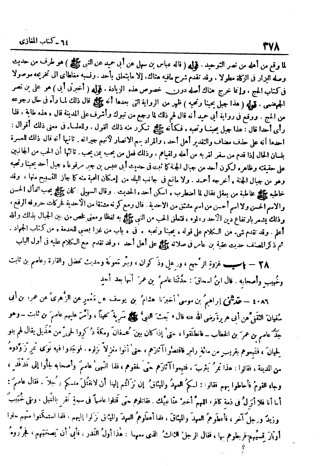 [4083] قَوْلُهُ أَخْبَرَنِي أَبِي هُوَ عَلِيُّ بْنُ نَصْرٍ الْجَهْضَمِيُّ قَوْلُهُ هَذَا جَبَلٌ يُحِبُّنَا وَنُحِبُّهُ ظَهَرَ مِنَ الرِّوَايَةِ الَّتِي بَعْدَهَا أَنَّهُ صَلَّى اللَّهُ عَلَيْهِ وَسَلَّمَ قَالَ ذَلِكَ لَمَّا رَآهُ فِي حَالِ رُجُوعِهِ مِنَ الْحَجِّ وَوَقَعَ فِي رِوَايَةِ أَبِي حُمَيْدٍ أَنَّهُ قَالَ لَهُمْ ذَلِكَ لَمَّا رَجَعَ مِنْ تَبُوكَ وَأَشْرَفَ عَلَى الْمَدِينَةِ قَالَ هَذِهِ طَابَةُ فَلَمَّا رَأَى أُحُدًا قَالَ هَذَا جَبَلٌ يُحِبُّنَا وَنُحِبُّهُ فَكَأَنَّهُ صَلَّى اللَّهُ عَلَيْهِ وَسَلَّمَ تَكَرَّرَ مِنْهُ ذَلِكَ الْقَوْلُ وَلِلْعُلَمَاءِ فِي مَعْنَى ذَلِكَ أَقْوَالٌ أَحَدُهَا أَنَّهُ عَلَى حَذْفِ مُضَافٍ وَالتَّقْدِيرُ أَهْلُ أُحُدٍ وَالْمُرَادُ بِهِمُ الْأَنْصَارُ لِأَنَّهُمْ جِيرَانُهُ ثَانِيهَا أَنَّهُ قَالَ ذَلِكَ لِلْمَسَرَّةِ بِلِسَانِ الْحَالِ إِذَا قَدِمَ مِنْ سَفَرٍ لِقُرْبِهِ مِنْ أَهْلِهِ وَلُقْيَاهُمْ وَذَلِكَ فِعْلُ مَنْ يُحِبُّ بِمَنْ يُحِبُّ ثَالِثُهَا أَنَّ الْحُبَّ مِنَ الْجَانِبَيْنِ عَلَى حَقِيقَتِهِ وَظَاهِرِهِ لِكَوْنِ أُحُدٍ مِنْ جِبَالِ الْجَنَّةِ كَمَا ثَبَتَ فِي حَدِيثِ أَبِي عَبْسِ بْنِ جَبْرٍ مَرْفُوعًا جَبَلُ أُحُدٍ يُحِبُّنَا وَنُحِبُّهُ وَهُوَ مِنْ جِبَالِ الْجَنَّةِ أَخْرَجَهُ أَحْمَدُ وَلَا مَانِعَ فِي جَانِبِ الْبَلَدِ مِنْ إِمْكَانِ الْمَحَبَّةِ مِنْهُ كَمَا جَازَ التَّسْبِيحُ مِنْهَا وَقَدْ خَاطَبَهُ صَلَّى اللَّهُ عَلَيْهِ وَسَلَّمَ مُخَاطَبَةَ مَنْ يَعْقِلُ فَقَالَ لَمَّا اضْطَرَبَ اسْكُنْ أُحُدُ الْحَدِيثَ وَقَالَ السُّهَيْلِيُّ كَانَ صَلَّى اللَّهُ عَلَيْهِ وَسَلَّمَ يُحِبُّ الْفَأْلَ الْحَسَنَ وَالِاسْمَ الْحَسَنَ وَلَا اسْمَ أَحْسَنُ مِنِ اسْمٍ مُشْتَقٍّ مِنَ الْأَحَدِيَّةِ قَالَ وَمَعَ كَوْنِهِ مُشْتَقًّا مِنَ الْأَحَدِيَّةِ فَحَرَكَاتُ حُرُوفِهِ الرَّفْعُ وَذَلِكَ يُشْعِرُ بِارْتِفَاعِ دِينِ الْأَحَدِ وَعُلُوِّهِ فَتَعَلُّقُ الْحُبِّ مِنَ النَّبِيِّ صَلَّى اللَّهُ عَلَيْهِ وَسَلَّمَ بِهِ لَفْظًا وَمَعْنًى فَخُصَّ مِنْ بَيْنِ الْجِبَالِ بِذَلِكَ وَاللَّهُ أَعْلَمُ وَقَدْ تَقَدَّمَ شَيْءٌ مِنَ الْكَلَامِ عَلَى قَوْلِهِ يُحِبُّنَا وَنُحِبُّهُ فِي بَابِ مَنْ غَزَا بِصَبِيٍّ لِلْخِدْمَةِ مِنْ كتاب الْجِهَادِ ثُمَّ ذَكَرَ الْمُصَنِّفُ حَدِيثَ عُقْبَةَ بْنِ عَامِرٍ فِي صَلَاتِهِ صَلَّى اللَّهُ عَلَيْهِ وَسَلَّمَ عَلَى أَهْلِ أُحُدٍ وَقَدْ تَقَدَّمَ مَعَ الْكَلَامِ عَلَيْهِ فِي أول الْبَاب
