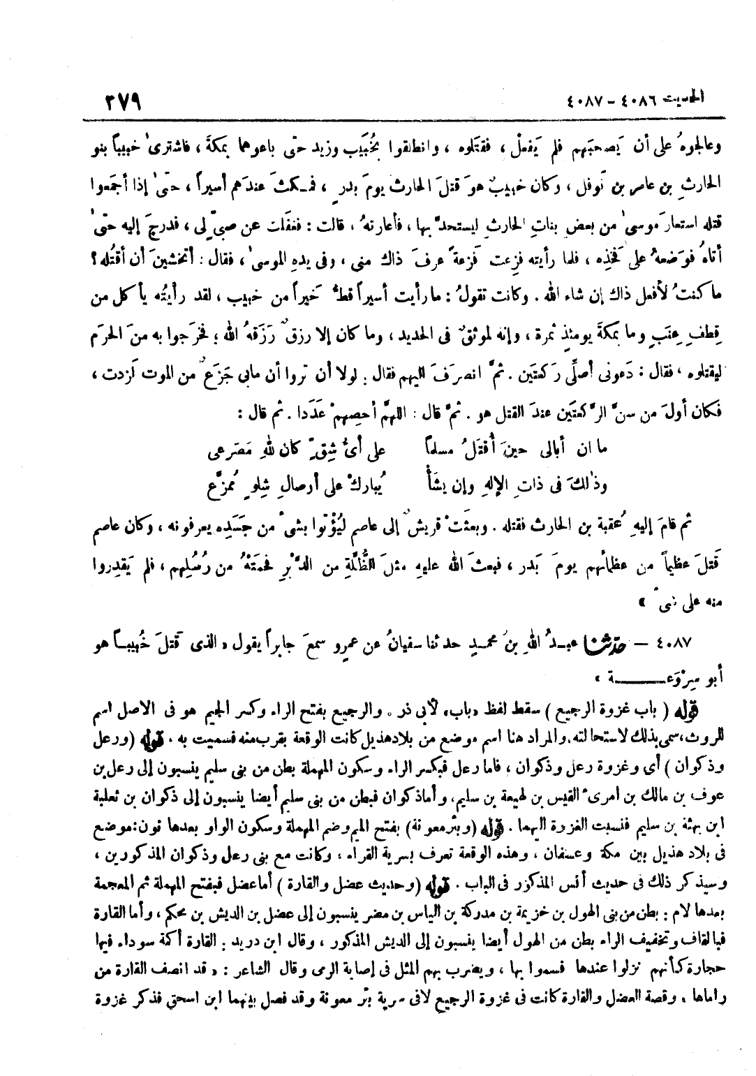 سَقَطَ لَفْظُ بَابُ لِأَبِي ذَرٍّ وَالرَّجِيعُ بِفَتْحِ الرَّاءِ وَكَسْرِ الْجِيمِ هُوَ فِي الْأَصْلِ اسْمٌ لِلرَّوْثِ سُمِّيَ بِذَلِكَ لِاسْتِحَالَتِهِ وَالْمُرَادُ هُنَا اسْمُ مَوْضِعٍ مِنْ بِلَادِ هُذَيْلٍ كَانَتِ الْوَقْعَةُ بِقُرْبٍ مِنْهُ فَسُمِّيَتْ بِهِ قَوْله ورعل وذكوان أَي وغزوة رِعْلٍ وَذَكْوَانَ فَأَمَّا رِعْلٌ فَبِكَسْرِ الرَّاءِ وَسُكُونِ الْمُهْمَلَةِ بَطْنٌ مِنْ بَنِي سُلَيْمٍ يُنْسَبُونَ إِلَى رِعْلِ بْنِ عَوْفِ بْنِ مَالِكِ بْنِ امْرِئِ الْقَيْسِ بْنِ لَهِيعَةَ بْنِ سُلَيْمٍ وَأَمَّا ذَكْوَانُ فَبَطْنٌ مِنْ بَنِي سُلَيْمٍ أَيْضًا يُنْسَبُونَ إِلَى ذكْوَان بن ثَعْلَبَة بن بُهْثَةَ بْنِ سُلَيْمٍ فَنُسِبَتِ الْغَزْوَةُ إِلَيْهِمَا قَوْلُهُ وَبِئْرُ مَعُونَةَ بِفَتْحِ الْمِيمِ وَضَمِّ الْمُهْمَلَةِ وَسُكُونِ الْوَاوِ بَعْدَهَا نُونٌ مَوْضِعٌ فِي بِلَادِ هُذَيْلٍ بَيْنَ مَكَّةَ وَعُسْفَانَ وَهَذِهِ الْوَقْعَةُ تُعْرَفُ بِسَرِيَّةِ الْقُرَّاءِ وَكَانَتْ مَعَ بَنِي رِعْلٍ وَذَكْوَانَ الْمَذْكُورَيْنِ وَسَيُذْكَرُ ذَلِكَ فِي حَدِيثِ أَنَسٍ الْمَذْكُورِ فِي الْبَابِ قَوْلُهُ وَحَدِيثُ عَضَلٍ وَالْقَارَةِ أَمَّا عَضَلٌ فَبِفَتْحِ الْمُهْمَلَةِ ثُمَّ الْمُعْجَمَةِ بَعْدَهَا لَامٌ بَطْنٌ مِنْ بَنِي الْهَوْلِ بْنِ خُزَيْمَةَ بْنِ مُدْرِكَةَ بْنِ إِلْيَاسَ بْنِ مُضَرَ يُنْسَبُونَ إِلَى عَضَلِ بْنِ الدِّيشِ بْنِ مُحَكِّمٍ وَأَمَّا الْقَارَةُ فَبِالْقَافِ وَتَخْفِيفِ الرَّاءِ بَطْنٌ مِنَ الْهَوْلِ أَيْضًا يُنْسَبُونَ إِلَى الديش الْمَذْكُور وَقَالَ بن دُرَيْدٍ الْقَارَةُ أَكَمَةٌ سَوْدَاءُ فِيهَا حِجَارَةٌ كَأَنَّهُمْ نَزَلُوا عِنْدَهَا فَسُمُّوا بِهَا وَيُضْرَبُ بِهِمُ الْمَثَلُ فِي إِصَابَةِ الرَّمْيِ وَقَالَ الشَّاعِرُ قَدْ أَنْصَفَ الْقَارَةَ مَنْ رَامَاهَا وَقِصَّةُ الْعَضَلِ وَالْقَارَةِ كَانَتْ فِي غَزْوَة الرجيع لافي سَرِيَّة بِئْر مَعُونَة وَقد فصل بَينهمَا بن إِسْحَاقَ فَذَكَرَ غَزْوَةَ