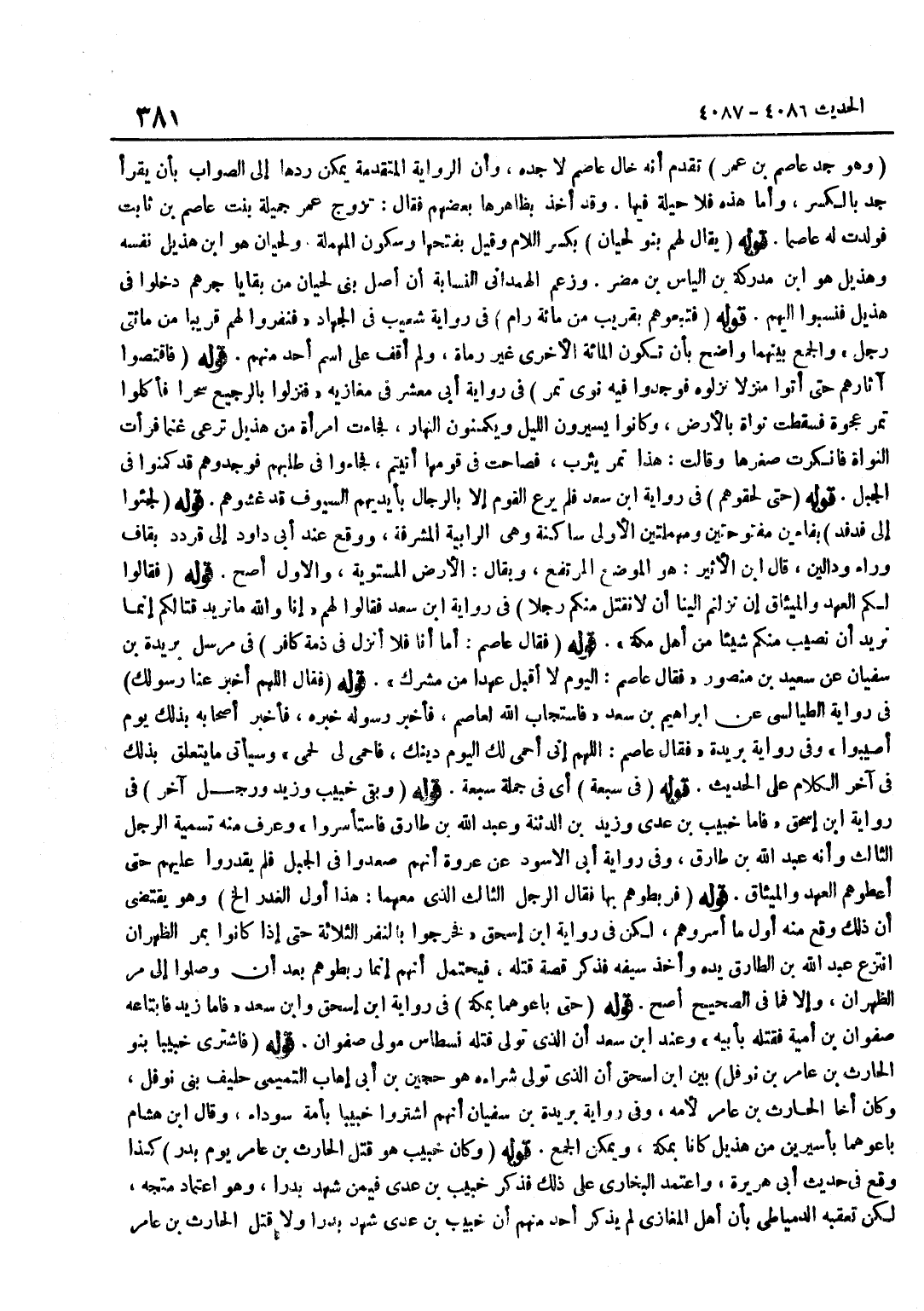 وَهُوَ جَدُّ عَاصِمِ بْنِ عُمَرَ تَقَدَّمَ أَنَّهُ خَالُ عَاصِمٍ لَا جَدُّهُ وَأَنَّ الرِّوَايَةَ الْمُتَقَدِّمَةَ يُمْكِنُ رَدُّهَا إِلَى الصَّوَابِ بِأَنْ يُقْرَأَ جِدُّ بِالْكَسْرِ وَأَمَّا هَذِهِ فَلَا حِيلَةَ فِيهَا وَقَدْ أَخَذَ بِظَاهِرِهَا بَعْضُهُمْ فَقَالَ تَزَوَّجَ عُمَرُ جَمِيلَةَ بِنْتَ عَاصِمِ بْنِ ثَابِتٍ فَوَلَدَتْ لَهُ عَاصِمًا قَوْلُهُ يُقَالُ لَهُمْ بَنُو لِحْيَانَ بِكَسْرِ اللَّامِ وَقيل بِفَتْحِهَا وَسُكُون الْمُهْملَة ولحيان هُوَ بن هُذَيْل نَفسه وهذيل هُوَ بن مُدْرِكَةَ بْنِ إِلْيَاسَ بْنِ مُضَرَ وَزَعَمَ الْهَمْدَانِيُّ النَّسَّابَةُ أَنَّ أَصْلَ بَنِي لِحْيَانَ مِنْ بَقَايَا جُرْهُمَ دَخَلُوا فِي هُذَيْلٍ فَنُسِبُوا إِلَيْهِمْ قَوْلُهُ فَتَبِعُوهُمْ بِقَرِيبٍ مِنْ مِائَةِ رَامٍ فِي رِوَايَةِ شُعَيْبٍ فِي الْجِهَادِ فَنَفَرُوا لَهُمْ قَرِيبًا مِنْ مِائَتَيْ رَجُلٍ وَالْجَمْعُ بَيْنَهُمَا وَاضِحٌ بِأَنْ تَكُونَ الْمِائَةُ الْأُخْرَى غَيْرَ رُمَاةٍ وَلَمْ أَقِفْ عَلَى اسْمِ أَحَدٍ مِنْهُمْ قَوْلُهُ فَاقْتَصُّوا آثَارَهُمْ حَتَّى أَتَوْا مَنْزِلًا نَزَلُوهُ فَوَجَدُوا فِيهِ نَوَى تَمْرٍ فِي رِوَايَةِ أَبِي مَعْشَرٍ فِي مَغَازِيهِ فَنَزَلُوا بِالرَّجِيعِ سَحَرًا فَأَكَلُوا تَمْرَ عَجْوَةٍ فَسَقَطَتْ نَوَاةٌ بِالْأَرْضِ وَكَانُوا يَسِيرُونَ اللَّيْلَ وَيَكْمُنُونَ النَّهَارَ فَجَاءَتِ امْرَأَةٌ مِنْ هُذَيْلٍ تَرْعَى غَنَمًا فَرَأَتِ النَّوَاةَ فَأَنْكَرَتْ صِغَرَهَا وَقَالَتْ هَذَا تَمْرُ يَثْرِبَ فَصَاحَتْ فِي قَومهَا أتيتم فجاؤوا فِي طَلَبِهِمْ فَوَجَدُوهُمْ قَدْ كَمَنُوا فِي الْجَبَلِ قَوْله حَتَّى لحقوهم فِي رِوَايَة بن سَعْدٍ فَلَمْ يُرَعِ الْقَوْمُ إِلَّا بِالرِّجَالِ بِأَيْدِيهِمُ السُّيُوفُ قَدْ غَشَوْهُمْ قَوْلُهُ لَجَئُوا إِلَى فَدْفَدَ بِفَاءَيْنِ مَفْتُوحَتَيْنِ وَمُهْمَلَتَيْنِ الْأُولَى سَاكِنَةٌ وَهِيَ الرَّابِيَةُ الْمُشْرِفَةُ وَوَقَعَ عِنْدَ أَبِي دَاوُدَ إِلَى قَرْدَدَ بقاف وَرَاء ودالين قَالَ بن الْأَثِيرِ هُوَ الْمَوْضِعُ الْمُرْتَفِعُ وَيُقَالُ الْأَرْضُ الْمُسْتَوِيَةُ وَالْأَوَّلُ أَصَحُّ قَوْلُهُ فَقَالُوا لَكُمُ الْعَهْدُ وَالْمِيثَاقُ إِنْ نَزَلْتُمْ إِلَيْنَا أَنْ لَا نَقْتُلَ مِنْكُمْ رجلا فِي رِوَايَة بن سعد فَقَالُوا لَهُم إِنَّا وَاللَّهِ مَا نُرِيدُ قِتَالَكُمْ إِنَّمَا نُرِيدُ أَنْ نُصِيبَ مِنْكُمْ شَيْئًا مِنْ أَهْلِ مَكَّةَ قَوْلُهُ فَقَالَ عَاصِمٌ أَمَّا أَنَا فَلَا أَنْزِلُ فِي ذِمَّةِ كَافِرٍ فِي مُرْسَلِ بُرَيْدَةَ بْنِ سُفْيَانَ عَنْ سَعِيدِ بْنِ مَنْصُورٍ فَقَالَ عَاصِمٌ الْيَوْمَ لَا أَقْبَلُ عَهْدًا مِنْ مُشْرِكٍ قَوْلُهُ فَقَالَ اللَّهُمَّ أَخْبِرْ عَنَّا رَسُولَكَ فِي رِوَايَةِ الطَّيَالِسِيِّ عَنْ إِبْرَاهِيمَ بْنِ سَعْدٍ فَاسْتَجَابَ اللَّهُ لِعَاصِمٍ فَأَخْبَرَ رَسُولَهُ خَبَرَهُ فَأَخْبَرَ أَصْحَابَهُ بِذَلِكَ يَوْمَ أُصِيبُوا وَفِي رِوَايَةِ بُرَيْدَةَ فَقَالَ عَاصِمٌ اللَّهُمَّ إِنِّي أحمى لَك الْيَوْم دينك فاحمي لِي لَحْمِي وَسَيَأْتِي مَا يَتَعَلَّقُ بِذَلِكَ فِي آخِرِ الْكَلَامِ عَلَى الْحَدِيثِ قَوْلُهُ فِي سَبْعَةٍ أَيْ فِي جُمْلَةِ سَبْعَةٍ قَوْلُهُ وَبَقِيَ خُبَيْبٌ وَزيد وَرجل آخر فِي رِوَايَة بن إِسْحَاق فَأَما خبيب بن عدي وَزيد بن الدَّثِنَّةِ وَعَبْدُ اللَّهِ بْنُ طَارِقٍ فَاسْتَأْسَرُوا وَعُرِفَ مِنْهُ تَسْمِيَةُ الرَّجُلِ الثَّالِثِ وَأَنَّهُ عَبْدُ اللَّهِ بْنُ طَارِقٍ وَفِي رِوَايَةِ أَبِي الْأَسْوَدِ عَنْ عُرْوَةَ أَنَّهُمْ صَعِدُوا فِي الْجَبَلِ فَلَمْ يَقْدِرُوا عَلَيْهِمْ حَتَّى أَعْطَوْهُمُ الْعَهْدَ وَالْمِيثَاقَ قَوْلُهُ فَرَبَطُوهُمْ بِهَا فَ