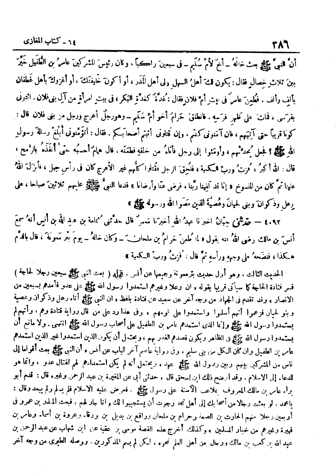 [4088] الْحَدِيثُ الثَّالِثُ وَهُوَ أَوَّلُ حَدِيثِ بِئْرِ مَعُونَةَ وَجَمِيعُهَا عَنْ أَنَسٍ قَوْلُهُ بَعَثَ النَّبِيُّ صَلَّى اللَّهُ عَلَيْهِ وَسَلَّمَ سَبْعِينَ رَجُلًا لِحَاجَةٍ فَسَّرَ قَتَادَةُ الْحَاجَةَ كَمَا سَيَأْتِي قَرِيبًا بِقَوْلِهِ أَنَّ رِعْلًا وَغَيْرَهُمُ اسْتَمَدُّوا رَسُولِ اللَّهِ صَلَّى اللَّهُ عَلَيْهِ وَسَلَّمَ عَلَى عَدُوٍّ فَأَمَدَّهُمْ بِسَبْعِينَ مِنَ الْأَنْصَارِ وَقَدْ تَقَدَّمَ فِي الْجِهَادِ مِنْ وَجْهٍ آخَرَ عَنْ سَعِيدٍ عَنْ قَتَادَةَ بِلَفْظِ أَنَّ النَّبِيَّ صَلَّى اللَّهُ عَلَيْهِ وَسَلَّمَ أَتَاهُ رِعْلٌ وَذَكْوَانُ وَعُصَيَّةُ وَبَنُو لِحْيَانَ فَزَعَمُوا أَنَّهُمْ أَسْلَمُوا وَاسْتَمَدُّوا عَلَى قَوْمِهِمْ وَفِي هَذَا رَدٌّ عَلَى مَنْ قَالَ رِوَايَةُ قَتَادَةَ وَهَمٌ وَأَنَّهُمْ لَمْ يَسْتَمِدُّوا رَسُولِ اللَّهِ صَلَّى اللَّهُ عَلَيْهِ وَسَلَّمَ وَإِنَّمَا الَّذِي اسْتَمَدَّهُمْ عَامِرُ بْنُ الطُّفَيْلِ عَلَى أَصْحَابِ رَسُولِ اللَّهِ صَلَّى اللَّهُ عَلَيْهِ وَسَلَّمَ انْتَهَى وَلَا مَانِعَ أَنْ يَسْتَمِدُّوا رَسُولَ اللَّهِ صَلَّى اللَّهُ عَلَيْهِ وَسَلَّمَ فِي الظَّاهِرِ وَيَكُونَ قَصْدُهُمُ الْغَدْرُ بِهِمْ وَيُحْتَمَلُ أَنْ يَكُونَ الَّذِينَ اسْتَمَدُّوا غَيْرَ الَّذِينَ اسْتَمَدَّهُمْ عَامِرُ بْنُ الطُّفَيْلِ وَإِنْ كَانَ الْكُلُّ مِنْ بَنِي سُلَيْمٍ وَفِي رِوَايَةِ عَاصِمٍ آخِرَ الْبَابِ عَنْ أَنَسٍ أَنَّ النَّبِيَّ صَلَّى اللَّهُ عَلَيْهِ وَسَلَّمَ بَعَثَ أَقْوَامًا إِلَى نَاسٍ مِنَ الْمُشْرِكِينَ بَيْنَهُمْ وَبَيْنَ رَسُولِ اللَّهِ صَلَّى اللَّهُ عَلَيْهِ وَسَلَّمَ عَهْدٌ وَيُحْتَمَلُ أَنَّهُ لَمْ يَكُنِ اسْتِمْدَادُهُمْ لَهُمْ لِقِتَالِ عَدُوٍّ وَإِنَّمَا هُوَ لِلدُّعَاءِ إِلَى الْإِسْلَامِ وَقَدْ أَوْضَحَ ذَلِك بن إِسْحَاقَ قَالَ حَدَّثَنِي أَبِي عَنِ الْمُغِيرَةِ بْنِ عَبْدِ الرَّحْمَنِ وَغَيْرِهِ قَالَ قَدِمَ أَبُو بَرَاءٍ عَامِرُ بْنُ مَالِكٍ الْمَعْرُوفُ بِمُلَاعِبِ الْأَسِنَّةِ عَلَى رَسُول صَلَّى اللَّهُ عَلَيْهِ وَسَلَّمَ فَعَرَضَ عَلَيْهِ الْإِسْلَامَ فَلَمْ يُسْلِمْ وَلَمْ يُبْعِدْ وَقَالَ يَا مُحَمَّدُ لَوْ بَعَثْتَ رِجَالًا مِنْ أَصْحَابِكَ إِلَى أَهْلِ نَجْدٍ رَجَوْتُ أَنْ يَسْتَجِيبُوا لَكَ وَأَنَا جَارٌ لَهُمْ فَبَعَثَ الْمُنْذِرَ بْنَ عَمْرٍو فِي أَرْبَعِينَ رَجُلًا مِنْهُمِ الْحَارِثُ بْنُ الصِّمَّةَ وَحَرَامُ بْنُ مِلْحَانِ وَرَافِعُ بْنُ بُدَيْلِ بْنِ وَرْقَاءَ وَعُرْوَةُ بْنُ أَسْمَاءَ وَعَامِرُ بْنُ فُهَيْرَةَ وَغَيْرُهُمْ مِنْ خِيَارِ الْمُسْلِمِينَ وَكَذَلِكَ أَخْرَجَ هَذِهِ الْقِصَّةَ مُوسَى بن عقبَة عَن بن شِهَابٍ عَنْ عَبْدِ الرَّحْمَنِ بْنِ عَبْدِ اللَّهِ بْنِ كَعْبِ بْنِ مَالِكٍ وَرِجَالٍ مِنْ أَهْلِ الْعِلْمِ نَحْوَهُ لَكِنْ لَمْ يُسَمِّ الْمَذْكُورِينَ وَوَصَلَهُ الطَّبَرِيّ من وَجه آخر