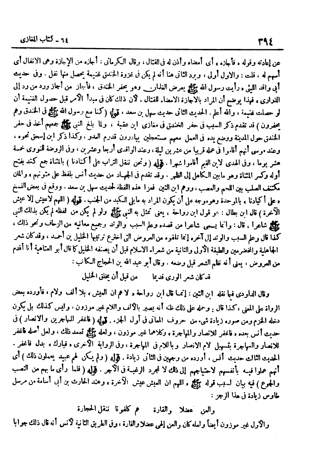 [4098] قَوْلُهُ كُنَّا مَعَ رَسُولِ اللَّهِ صَلَّى اللَّهُ عَلَيْهِ وَسَلَّمَ فِي الْخَنْدَقِ وَهُمْ يَحْفِرُونَ قَدْ تَقَدَّمَ ذِكْرُ السَّبَبِ فِي حَفْرِ الْخَنْدَقِ فِي مغازي بن عُقْبَةَ وَلَمَّا بَلَغَ النَّبِيَّ صَلَّى اللَّهُ عَلَيْهِ وَسَلَّمَ جَمْعُهُمْ أَخَذَ فِي حَفْرِ الْخَنْدَقِ حَوْلَ الْمَدِينَةِ وَوَضَعَ يَدَهُ فِي الْعَمَلِ مَعَهُمْ مُسْتَعْجِلِينَ يبادرون قدوم الْعَدو وَكَذَا ذكر بن إِسْحَاقَ نَحْوَهُ وَعِنْدَ مُوسَى أَنَّهُمْ أَقَامُوا فِي عَمَلِهِ قَرِيبًا مِنْ عِشْرِينَ لَيْلَةً وَعِنْدَ الْوَاقِدِيِّ أَرْبَعًا وَعِشْرِينَ وَفِي الرَّوْضَةِ لِلنَّوَوِيِّ خَمْسَةَ عَشَرَ يَوْمًا وَفِي الْهَدْيِ لِابْنِ الْقَيِّمِ أَقَامُوا شَهْرًا قَوْلُهُ وَنَحْنُ نَنْقُلُ التُّرَابَ عَلَى أَكْتَادِنَا بِالْمُثَنَّاةِ جَمْعُ كَتِدٍ بِفَتْحِ أَوَّلِهِ وَكَسْرِ الْمُثَنَّاةِ وَهُوَ مَا بَيْنَ الْكَاهِلِ إِلَى الظَّهْرِ وَقَدْ تَقَدَّمَ فِي الْجِهَادِ مِنْ حَدِيثِ أَنَسٍ بِلَفْظِ عَلَى مُتُونِهِمْ وَالْمَتْنُ مُكْتَنَفُ الصُّلْبِ بَيْنَ اللَّحْمِ وَالْعَصَبِ وَوهم بن التِّينِ فَعَزَا هَذِهِ اللَّفْظَةَ لِحَدِيثِ سَهْلِ بْنِ سَعْدٍ وَوَقَعَ فِي بَعْضِ النُّسَخِ عَلَى أَكْبَادِنَا بِالْمُوَحَّدَةِ وَهُوَ مُوَجَّهٌ عَلَى أَنْ يَكُونَ الْمُرَادُ بِهِ مَا يَلِي الْكَبِدَ مِنَ الْجَنْبِ قَوْلُهُ اللَّهُمَّ لَا عَيْشَ إِلَّا عَيْشُ الْآخِرَةِ قَالَ بن بطال هُوَ قَول بن رَوَاحَةَ يَعْنِي تَمَثَّلَ بِهِ النَّبِيِّ صَلَّى اللَّهُ عَلَيْهِ وَسَلَّمَ وَلَوْ لَمْ يَكُنْ مِنْ لَفْظِهِ لَمْ يَكُنْ بِذَلِكَ النَّبِيُّ صَلَّى اللَّهُ عَلَيْهِ وَسَلَّمَ شَاعِرًا قَالَ وَإِنَّمَا يُسَمَّى شَاعِرًا مَنْ قَصَدَهُ وَعَلِمَ السَّبَبَ وَالْوَتَدَ وَجَمِيعَ مَعَانِيهِ مِنَ الزِّحَافِ وَنَحْوِ ذَلِكَ كَذَا قَالَ وَعِلْمُ السَّبَبِ وَالْوَتَدِ إِلَى آخِرِهِ إِنَّمَا تَلَقَّوْهُ مِنَ الْعَرُوضِ الَّتِي اخْتَرَعَ تَرْتِيبَهَا الْخَلِيلُ بْنُ أَحْمَدَ وَقَدْ كَانَ شِعْرُ الْجَاهِلِيَّةِ وَالْمُخَضْرَمِينَ وَالطَّبَقَةِ الْأُولَى وَالثَّانِيَةِ مِنْ شُعَرَاءِ الْإِسْلَامِ قَبْلَ أَنْ يُصَنِّفَهُ الْخَلِيلُ كَمَا قَالَ أَبُو الْعَتَاهِيَةِ أَنَا أَقْدَمُ مِنَ الْعَرُوضِ يَعْنِي أَنَّهُ نَظَمَ الشِّعْرَ قَبْلَ وَضْعِهِ وَقَالَ أَبُو عَبْدِ اللَّهِ بْنُ الْحَجَّاجِ الْكَاتِبُ قَدْ كَانَ شِعْرُ الْوَرَى قَدِيمًا مِنْ قَبْلِ أَنْ يُخْلَقَ الْخَلِيلُ وَقَالَ الدَّاوُدِيُّ فِيمَا نَقَلَهُ بن التِّين إِنَّمَا قَالَ بن رَوَاحَةَ لَا هُمَّ إِنَّ الْعَيْشَ بِلَا أَلِفٍ وَلَام فَأوردهُ بَعْضُ الرُّوَاةِ عَلَى الْمَعْنَى كَذَا قَالَ وَحَمَلَهُ عَلَى ذَلِكَ ظَنُّهُ أَنَّهُ يَصِيرُ بِالْأَلِفِ وَاللَّامِ غَيْرَ مَوْزُونٍ وَلَيْسَ كَذَلِكَ بَلْ يَكُونُ دَخَلَهُ الْخَزْمُ وَمِنْ صُوَرِهِ زِيَادَةُ شَيْءٍ مِنْ حُرُوفِ الْمَعَانِي فِي أَوَّلِ الْجُزْءِ قَوْلُهُ فَاغْفِرْ لِلْمُهَاجِرِينَ وَالْأَنْصَارِ فِي حَدِيثِ أَنَسٍ بَعْدَهُ فَاغْفِرْ لِلْأَنْصَارِ وَالْمُهَاجِرَةْ وَكِلَاهُمَا غَيْرُ مَوْزُونٍ وَلَعَلَّهُ صَلَّى اللَّهُ عَلَيْهِ وَسَلَّمَ تَعَمَّدَ ذَلِكَ وَلَعَلَّ أَصْلَهُ فَاغْفِرْ لِلَانْصَارِ وَالْمُهَاجِرَةْ بِتَسْهِيلِ لَامِ الْأَنْصَارِ وَبِاللَّامِ فِي الْمُهَاجِرَةِ وَفِي الرِّوَايَةِ الْأُخْرَى فَبَارِكْ بَدَلَ فَاغْفِرْ الحَدِيث الثَّالِث حَدِيثُ أَنَسٍ أَوْرَدَهُ مِنْ وَجْهَيْنِ فِي الثَّانِي زِيَادَةٌ