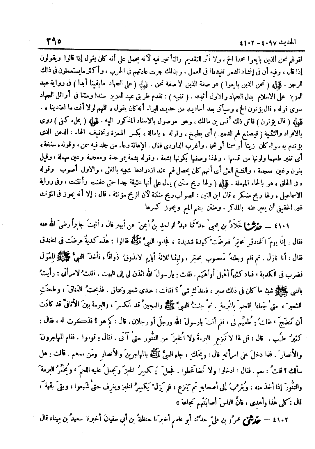 لِقَوْلِهِمْ نَحْنُ الَّذِينَ بَايَعُوا مُحَمَّدًا إِلَخْ وَلَا أَثَرَ لِلتَّقْدِيمِ وَالتَّأْخِيرِ فِيهِ لِأَنَّهُ يُحْمَلُ عَلَى أَنَّهُ كَانَ يَقُولُ إِذَا قَالُوا وَيَقُولُونَ إِذَا قَالَ وَفِيهِ أَنَّ فِي إِنْشَادِ الشِّعْرِ تَنْشِيطًا فِي الْعَمَلِ وَبِذَلِكَ جَرَتْ عَادَتُهُمْ فِي الْحَرْبِ وَأَكْثَرُ مَا يَسْتَعْمِلُونَ فِي ذَلِكَ الرَّجَزُ قَوْلُهُ نَحْنُ الَّذِينَ بَايَعُوا هُوَ صِفَةُ الَّذِينَ لَا صِفَةَ نَحْنُ قَوْلُهُ عَلَى الْجِهَادِ مَا بَقِينَا أَبَدًا فِي رِوَايَةِ عَبْدِ الْعَزِيزِ عَلَى الْإِسْلَامِ بَدَلَ الْجِهَادِ وَالْأَوَّلُ أَثْبَتُ تَنْبِيهٌ تَقَدَّمَ طَرِيقُ عَبْدِ الْعَزِيزِ سَنَدًا وَمَتْنًا فِي أَوَائِلِ الْجِهَادِ سِوَى قَوْلِهِ قَالَ يُؤْتَوْنَ إِلَخْ وَسَيَأْتِي بَعْدَ أَحَادِيثَ مِنْ حَدِيثِ الْبَرَاءِ أَنَّهُ كَانَ يَقُولُ اللَّهُمَّ لَوْلَا أَنْتَ مَا اهْتَدَيْنَا