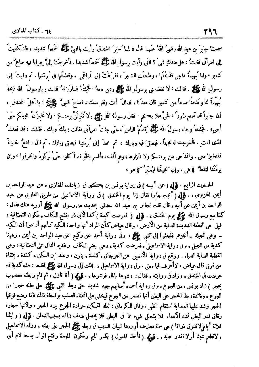 [4101] الْحَدِيثُ الرَّابِعُ قَوْلُهُ عَنْ أَبِيهِ فِي رِوَايَةِ يُونُسُ بْنُ بُكَيْرٍ فِي زِيَادَاتِ الْمَغَازِي عَنِ عَبْدِ الْوَاحِدِ بْنِ أَيْمَنَ الْمَخْزُومِيِّ قَوْلُهُ أَتَيْتُ جَابِرًا فَقَالَ إِنَّا يَوْمَ الْخَنْدَقِ فِي رِوَايَةِ الْإِسْمَاعِيلِيِّ مِنْ طَرِيقِ الْمَحَارِبِيِّ عَنْ عَبْدِ الْوَاحِدِ بْنِ أَيْمَنَ عَنْ أَبِيهِ قَالَ قُلْتُ لِجَابِرِ بْنِ عَبْدِ اللَّهِ حَدِّثْنِي بِحَدِيثٍ عَنْ رَسُولِ اللَّهِ صَلَّى اللَّهُ عَلَيْهِ وَسَلَّمَ أَرْوِيهِ عَنْكَ فَقَالَ كُنَّا مَعَ رَسُولِ اللَّهِ صَلَّى اللَّهُ عَلَيْهِ وَسَلَّمَ يَوْمَ الْخَنْدَقِ قَوْلُهُ فَعَرَضَتْ كَيْدَةٌ كَذَا لِأَبِي ذَرٍّ بِفَتْحِ الْكَافِ وَسُكُونِ التَّحْتَانِيَّةِ قِيلَ هِيَ الْقِطْعَةُ الشَّدِيدَةُ الصُّلْبَةُ مِنَ الْأَرْضِ وَقَالَ عِيَاضٌ كَأَنَّ الْمُرَادَ أَنَّهَا وَاحِدَةُ الْكَيْدِ كَأَنَّهُمْ أَرَادُوا أَنَّ الْكَيْدَ وَهِيَ الْجِبِلَّةُ أَعْجَزَهُمْ فَلَجَئُوا إِلَى النَّبِيِّ صَلَّى اللَّهُ عَلَيْهِ وَسَلَّمَ وَفِي رِوَايَةِ أَحْمَدَ عَنْ وَكِيعٍ عَنْ عَبْدِ الْوَاحِدِ بن أَيمن وَهَهُنَا كُدْيَةٌ مِنَ الْجَبَلِ وَفِي رِوَايَةِ الْإِسْمَاعِيلِيِّ فَعَرَضَتْ كُدْيَةٌ وَهِيَ بِضَمِّ الْكَافِ وَتَقْدِيمِ الدَّالِ عَلَى التَّحْتَانِيَّةِ وَهِيَ الْقِطْعَةُ الصُّلْبَةُ الصَّمَّاءُ وَوَقَعَ فِي رِوَايَةِ الْأَصِيلِيِّ عَنِ الْجُرْجَانِيِّ كِنْدَةٌ بِنُونٍ وَعِنْدَ بن السَّكَنِ كَتِدَةٌ بِمُثَنَّاةٍ مِنْ فَوْقُ قَالَ عِيَاضٌ لَا أَعْرِفُ لَهُمَا مَعْنًى وَفِي رِوَايَةِ الْإِسْمَاعِيلِيِّ فَجِئْتُ إِلَى رَسُولِ اللَّهِ صَلَّى اللَّهُ عَلَيْهِ وَسَلَّمَ فَقُلْتُ هَذِهِ كُدْيَةٌ قَدْ عَرَضَتْ فِي الْخَنْدَقِ وَزَادَ فِي رِوَايَتِهِ فَقَالَ رُشُّوهَا بِالْمَاءِ فَرَشُّوهَا قَوْلُهُ أَنَا نَازِلٌ ثُمَّ قَامَ وَبَطْنُهُ مَعْصُوبٌ بِحَجَرٍ زَادَ يُونُسُ مِنَ الْجُوعِ وَفِي رِوَايَةِ أَحْمَدَ أَصَابَهُمْ جَهْدٌ شَدِيدٌ حَتَّى رَبَطَ النَّبِيُّ صَلَّى اللَّهُ عَلَيْهِ وَسَلَّمَ عَلَى بَطْنِهِ حَجَرًا مِنَ الْجُوعِ وَفَائِدَةُ رَبْطِ الْحَجْرِ عَلَى الْبَطْنِ أَنَّهَا تُضْمِرُ مِنَ الْجُوعِ فَيُخْشَى عَلَى انْحِنَاءِ الصُّلْبِ بِوَاسِطَةِ ذَلِكَ فَإِذَا وَضَعَ فَوْقَهَا الْحَجَرَ وَشَدَّ عَلَيْهَا الْعِصَابَةَ اسْتَقَامَ الظَّهْرُ وَقَالَ الْكَرْمَانِيُّ لَعَلَّهُ لِتَسْكِينِ حَرَارَةِ الْجُوعِ بِبَرْدِ الْحَجَرِ وَلِأَنَّهَا حِجَارَةٌ رِقَاقٌ قَدْرَ الْبَطْنِ تَشُدُّ الْأَمْعَاءَ فَلَا يَتَحَلَّلُ شَيْءٌ مِمَّا فِي الْبَطْنِ فَلَا يَحْصُلُ ضَعْفٌ زَائِدٌ بِسَبَبِ التَّحَلُّلِ قَوْلُهُ وَلَبِثْنَا ثَلَاثَةَ أَيَّامٍ لَا نَذُوقُ ذَوَاقًا هِيَ جُمْلَةٌ مُعْتَرِضَةٌ أَوْرَدَهَا لِبَيَانِ السَّبَبِ فِي رَبْطِهِ صَلَّى اللَّهُ عَلَيْهِ وَسَلَّمَ الْحَجَرَ عَلَى بَطْنِهِ وَزَادَ الْإِسْمَاعِيلِيُّ لَا نَطْعَمُ شَيْئًا أَوْ لَا نَقْدِرُ عَلَيْهِ قَوْلُهُ فَأَخَذَ الْمِعْوَلَ بِكَسْرِ الْمِيمِ وَسُكُونِ الْمُهْمَلَةِ وَفَتْحِ الْوَاوِ بَعْدَهَا لَامٌ أَيِ
