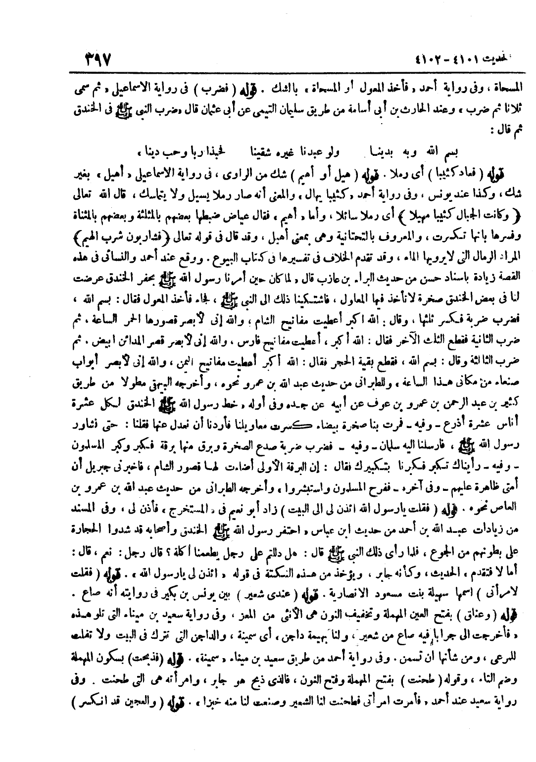 الْمِسْحَاةُ وَفِي رِوَايَةِ أَحْمَدَ فَأَخَذَ الْمِعْوَلَ أَوِ الْمِسْحَاةَ بِالشَّكِّ قَوْلُهُ فَضَرَبَ فِي رِوَايَةِ الْإِسْمَاعِيلِيِّ ثُمَّ سَمَّى ثَلَاثًا ثُمَّ ضَرَبَ وَعِنْدَ الْحَارِثِ بْنِ أَبِي أُسَامَةَ مِنْ طَرِيقِ سُلَيْمَانَ التَّيْمِيِّ عَنْ أَبِي عُثْمَانَ قَالَ ضَرَبَ النَّبِيُّ صَلَّى اللَّهُ عَلَيْهِ وَسَلَّمَ فِي الْخَنْدَقِ ثُمَّ قَالَ بِسْمِ اللَّهِ وَبِهِ بَدَيْنَا وَلَوْ عَبَدْنَا غَيْرَهُ شقينا فحبذا رَبًّا وَحب دِينَا قَوْلُهُ فَعَادَ كَثِيبًا أَيْ رَمْلًا قَوْلُهُ هيل أَوْ أَهْيَمَ شَكٌّ مِنَ الرَّاوِي فِي رِوَايَةِ الْإِسْمَاعِيلِيِّ أَهْيَلَ بِغَيْرِ شَكٍّ وَكَذَا عِنْدَ يُونُسَ وَفِي رِوَايَةِ أَحْمَدَ كَثِيبًا يُهَالُ وَالْمَعْنَى أَنَّهُ صَارَ رَمْلًا يَسِيلُ وَلَا يَتَمَاسَكُ قَالَ اللَّهُ تَعَالَى وَكَانَت الْجبَال كثيبا مهيلا أَيْ رَمْلًا سَائِلًا وَأَمَّا أَهْيَمُ فَقَالَ عِيَاضٌ ضَبَطَهَا بَعْضُهُمْ بِالْمُثَلَّثَةِ وَبَعْضُهُمْ بِالْمُثَنَّاةِ وَفَسَّرَهَا بِأَنَّهَا تَكَسَّرَتْ وَالْمَعْرُوفُ بِالتَّحْتَانِيَّةِ وَهِيَ بِمَعْنَى أَهْيَلَ وَقَدْ قَالَ فِي قَوْلِهِ تَعَالَى فَشَارِبُونَ شُرْبَ الْهِيمِ الْمُرَادُ الرِّمَالُ الَّتِي لَا يَرْوِيهَا الْمَاءُ وَقَدْ تَقَدَّمَ الْخِلَافُ فِي تَفْسِيرِهَا فِي كِتَابِ الْبُيُوعِ وَوَقَعَ عِنْدَ أَحْمَدَ وَالنَّسَائِيِّ فِي هَذِهِ الْقِصَّةِ زِيَادَةٌ بِإِسْنَادٍ حَسَنٍ مِنْ حَدِيثِ الْبَرَاءِ بْنِ عَازِبٍ قَالَ لَمَّا كَانَ حِينُ أَمَرَنَا رَسُولُ اللَّهِ صَلَّى اللَّهُ عَلَيْهِ وَسَلَّمَ بِحَفْرِ الْخَنْدَقِ عَرَضَتْ لَنَا فِي بَعْضِ الْخَنْدَقِ صَخْرَةٌ لَا تَأْخُذُ فِيهَا الْمَعَاوِلُ فَاشْتَكَيْنَا ذَلِكَ إِلَى النَّبِيِّ صَلَّى اللَّهُ عَلَيْهِ وَسَلَّمَ فَجَاءَ فَأَخَذَ الْمِعْوَلَ فَقَالَ بِسْمِ اللَّهِ فَضَرَبَ ضَرْبَةً فَكَسَرَ ثُلُثَهَا وَقَالَ اللَّهُ أَكْبَرُ أُعْطِيتُ مَفَاتِيحَ الشَّامِ وَاللَّهِ إِنِّي لَأُبْصِرُ قُصُورَهَا الْحُمْرَ السَّاعَةَ ثُمَّ ضَرَبَ الثَّانِيَةَ فَقَطَعَ الثُّلُثَ الْآخَرَ فَقَالَ اللَّهُ أَكْبَرُ أُعْطِيتُ مَفَاتِيحَ فَارِسٍ وَاللَّهِ إِنِّي لَأُبْصِرُ قَصْرَ الْمَدَائِنِ أَبْيَضَ ثُمَّ ضَرَبَ الثَّالِثَةَ وَقَالَ بِسْمِ اللَّهِ فَقَطَعَ بَقِيَّةَ الْحَجَرِ فَقَالَ اللَّهُ أَكْبَرُ أُعْطِيتُ مَفَاتِيحَ الْيَمَنِ وَاللَّهِ إِنِّي لَأُبْصِرُ أَبْوَابَ صَنْعَاءَ مِنْ مَكَانِي هَذَا السَّاعَةَ وَلِلطَّبَرَانِيِّ مِنْ حَدِيثِ عَبْدِ اللَّهِ بْنِ عَمْرٍو نَحْوُهُ وَأَخْرَجَهُ الْبَيْهَقِيُّ مُطَوَّلًا مِنْ طَرِيقِ كَثِيرِ بْنِ عَبْدِ الرَّحْمَنِ بْنِ عَمْرِو بْنِ عَوْفٍ عَنْ أَبِيهِ عَنْ جَدِّهِ وَفِي أَوَّلِهِ خَطَّ رَسُولُ اللَّهِ صَلَّى اللَّهُ عَلَيْهِ وَسَلَّمَ الْخَنْدَقَ لِكُلِّ عَشْرَةِ أُنَاسٍ عَشْرَةُ أَذْرُعٍ وَفِيهِ فَمَرَّتْ بِنَا صَخْرَةٌ بَيْضَاءُ كَسَرَتْ مَعَاوِيلَنَا فَأَرَدْنَا أَنْ نَعْدِلَ عَنْهَا فَقُلْنَا حَتَّى نُشَاوِرَ رَسُولَ اللَّهِ صَلَّى اللَّهُ عَلَيْهِ وَسَلَّمَ فَأَرْسَلْنَا إِلَيْهِ سَلْمَانَ وَفِيهِ فَضَرَبَ ضَرْبَةً صَدَعَ الصَّخْرَةَ وَبَرَقَ مِنْهَا بَرْقَةٌ فَكَبَّرَ وَكَبَّرَ الْمُسْلِمُونَ وَفِيهِ رَأَيْنَاكَ تُكَبِّرُ فَكَبَّرْنَا بِتَكْبِيرِكَ فَقَالَ إِنَّ الْبَرْقَةَ الْأُولَى أَضَاءَتْ لَهَا قُصُورُ الشَّامِ فَأَخْبَرَنِي جِبْرِيلُ أَنَّ أُمَّتِي ظَاهِرَةٌ عَلَيْهِمْ وَفِي آخِرِهِ فَفَرِحَ الْمُسْلِمُونَ وَاسْتَبْشَرُوا وَأَخْرَجَهُ الطَّبَرَانِيُّ مِنْ حَدِيثِ عَبْدِ اللَّهِ بْنِ عَمْرِو بْنِ الْعَاصِ نَحْوَهُ قَوْلُهُ فَقُلْتُ يَا رَسُولَ اللَّهِ ائْذَنْ لِي إِل