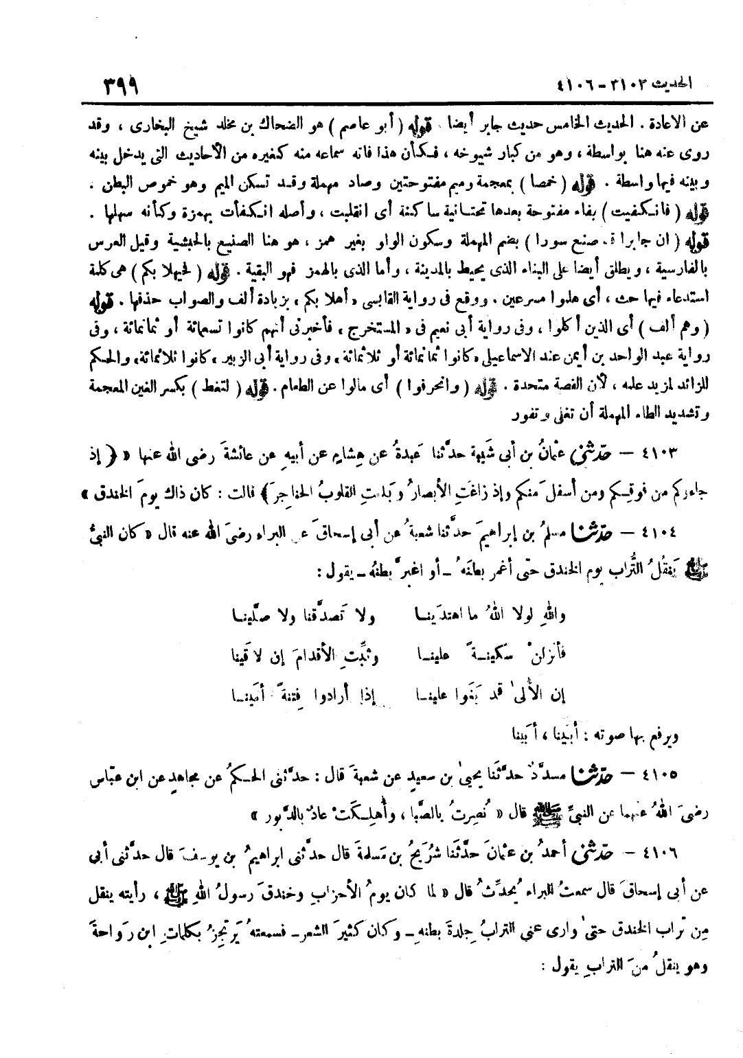 عَنِ الْإِعَادَةِ الْحَدِيثُ الْخَامِسُ حَدِيثُ جَابِرٍ أَيْضًا قَوْلُهُ أَبُو عَاصِمٍ هُوَ الضَّحَّاكُ بْنُ مَخْلَدٍ شَيْخُ الْبُخَارِيِّ وَقَدْ رَوَى عَنْهُ هُنَا بِوَاسِطَةٍ وَهُوَ مِنْ كِبَارِ شُيُوخِهِ فَكَأَنَّ هَذَا فَاتَهُ سَمَاعُهُ مِنْهُ كَغَيْرِهِ مِنَ الْأَحَادِيثِ الَّتِي يَدْخُلُ بَيْنَهُ وَبَيْنَهُ فِيهَا وَاسِطَةٌ قَوْلُهُ خَمَصًا بِمُعْجَمَةٍ وَمِيمٍ مَفْتُوحَتَيْنِ وَصَادٍ مُهْمَلَةٍ وَقَدْ تُسَكَّنُ الْمِيمُ وَهُوَ خُمُوصُ الْبَطْنِ قَوْلُهُ فَانْكَفَيْتُ بِفَاءٍ مَفْتُوحَةٍ بَعْدَهَا تَحْتَانِيَّةٌ سَاكِنَةٌ أَيِ انْقَلَبْتُ وَأَصْلُهُ انْكَفَأْتُ بِهَمْزَةٍ وَكَأَنَّهُ سَهَّلَهَا قَوْلُهُ إِنَّ جَابِرًا قَدْ صَنَعَ سُورًا بِضَمِّ الْمُهْمَلَةِ وَسُكُونِ الْوَاوِ بِغَيْرِ هَمْزٍ هُوَ هُنَا الصَّنِيعُ بِالْحَبَشِيَّةِ وَقِيلَ الْعُرْسُ بِالْفَارِسِيَّةِ وَيُطْلَقُ أَيْضًا عَلَى الْبِنَاءِ الَّذِي يُحِيطُ بِالْمَدِينَةِ وَأَمَّا الَّذِي بِالْهَمْزِ فَهُوَ الْبَقِيَّةُ قَوْلُهُ فَحَيَّهَلا بِكُمْ هِيَ كَلِمَةُ اسْتِدْعَاءٍ فِيهَا حَثٌّ أَيْ هَلُمُّوا مُسْرِعِينَ وَوَقَعَ فِي رِوَايَةِ الْقَابِسِيِّ أَهْلًا بِكُمْ بِزِيَادَةِ أَلِفٍ وَالصَّوَابُ حَذْفُهَا قَوْلُهُ وَهُمْ أَلْفٌ أَيِ الَّذِينَ أَكَلُوا وَفِي رِوَايَةِ أَبِي نُعَيْمٍ فِي الْمُسْتَخْرَجِ فَأَخْبَرَنِي أَنَّهُمْ كَانُوا تِسْعَمِائَةٍ أَوْ ثَمَانِمِائَةٍ وَفِي رِوَايَةِ عَبْدِ الْوَاحِدِ بْنِ أَيْمَنَ عِنْدَ الْإِسْمَاعِيلِيِّ كَانُوا ثَمَانَمِائَةٍ أَوْ ثَلَاثَمِائَةٍ وَفِي رِوَايَةِ أَبِي الزُّبَيْرِ كَانُوا ثَلَاثَمِائَةٍ وَالْحُكْمُ لِلزَّائِدِ لِمَزِيدِ عِلْمِهِ لِأَنَّ الْقِصَّةَ مُتَّحِدَةٌ قَوْلُهُ وَانْحَرَفُوا أَيْ مَالُوا عَنِ الطَّعَامِ قَوْلُهُ لَتَغِطُّ بِكَسْر الْغَيْن الْمُعْجَمَة وَتَشْديد الطَّاء الْمُهْملَة أَن تغلي وتفور