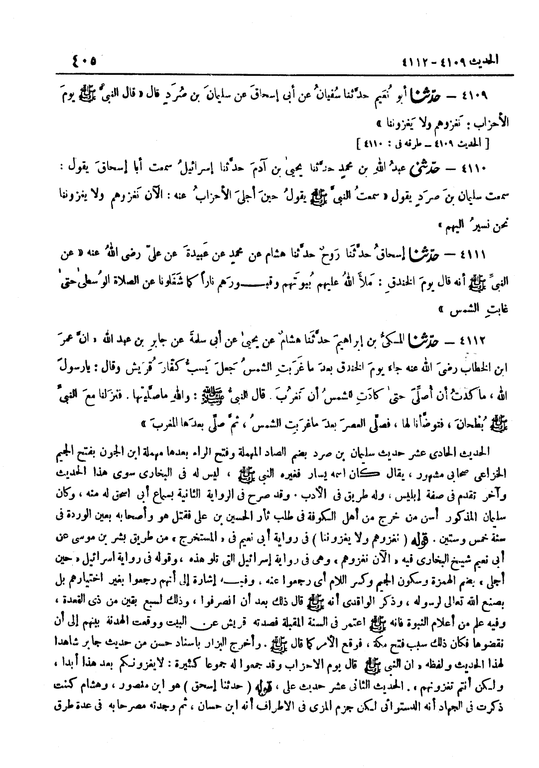[4111] قَوْلُهُ حَدثنَا إِسْحَاق هُوَ بن مَنْصُورٍ وَهِشَامٌ كُنْتُ ذَكَرْتُ فِي الْجِهَادِ أَنَّهُ الدَّسْتُوَائِيُّ لَكِنْ جَزَمَ الْمِزِّيُّ فِي الْأَطْرَافِ أَنَّهُ بن حَسَّانَ ثُمَّ وَجَدْتُهُ مُصَرَّحًا بِهِ فِي عِدَّةِ طُرُقٍ فَهَذَا هُوَ الْمُعْتَمَدُ وَأَمَّا تَضْعِيفُ الْأَصِيلِيِّ لِلْحَدِيثِ بِهِ فَلَيْسَ بِمُعْتَمَدٍ كَمَا سَأُوَضِّحُهُ فِي التَّفْسِيرِ إِنْ شَاءَ اللَّهُ تَعَالَى قَوْلُهُ عَنْ مُحَمَّدِ هُوَ بن سِيرِين وَعبيدَة بِفَتْح الْعين هُوَ بن عَمْرٍو السَّلْمَانِيُّ قَوْلُهُ قَالَ يَوْمَ الْخَنْدَقِ فِي رِوَايَةِ الْجِهَادِ يَوْمَ الْأَحْزَابِ وَهُوَ بِالْمَعْنَى وَفِي رِوَايَةِ يَحْيَى بْنِ الْجَزَّارِ عَنْ عَلِيٍّ عِنْدَ مُسْلِمٍ أَنَّ رَسُولَ اللَّهِ صَلَّى اللَّهُ عَلَيْهِ وَسَلَّمَ كَانَ يَوْمَ الْأَحْزَابِ قَاعِدًا عَلَى فِرْصَةٍ مِنْ فِرَصِ الْخَنْدَقِ فَذَكَرَهُ قَوْلُهُ كَمَا شَغَلُونَا فِي رِوَايَةِ الْكُشْمِيهَنِيِّ كُلَّمَا شَغَلُونَا بِزِيَادَةِ لَامٍ وَهُوَ خَطَأٌ قَوْلُهُ الصَّلَاةِ الْوُسْطَى زَادَ مُسْلِمٌ صَلَاةِ الْعَصْرِ وَسَيَأْتِي الْكَلَامُ عَلَيْهَا وَعَلَى شَرْحُ هَذَا الْحَدِيثِ مُسْتَوْفًى فِي تَفْسِيرِ سُورَةِ الْبَقَرَةِ الْحَدِيثُ الثَّالِثَ عَشَرَ حَدِيثُ جَابِرٍ