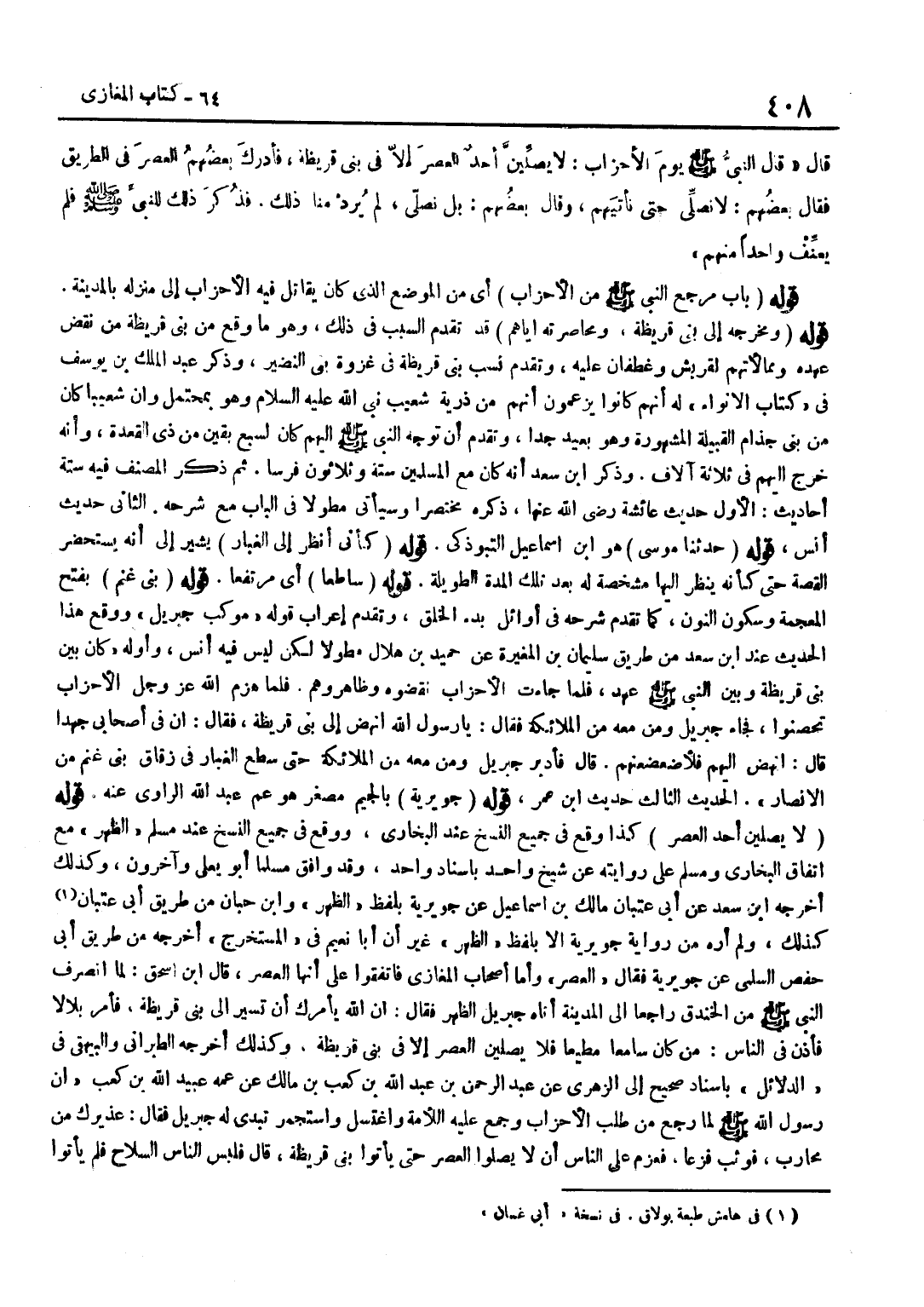 [4119] قَوْلُهُ جُوَيْرِيَةُ بِالْجِيمِ مُصَغَّرٌ هُوَ عَمُّ عَبْدِ اللَّهِ الرَّاوِي عَنْهُ قَوْلُهُ لَا يُصَلِّيَنَّ أَحَدٌ الْعَصْرَ كَذَا وَقَعَ فِي جَمِيعِ النُّسَخِ عِنْدَ الْبُخَارِيِّ وَوَقَعَ فِي جَمِيعِ النُّسَخِ عِنْدَ مُسْلِمٍ الظُّهْرَ مَعَ اتِّفَاقِ الْبُخَارِيِّ وَمُسْلِمٍ عَلَى رِوَايَتِهِ عَنْ شَيْخٍ وَاحِدٍ بِإِسْنَادٍ وَاحِدٍ وَقَدْ وَافَقَ مُسْلِمًا أَبُو يَعْلَى وَآخَرُونَ وَكَذَلِكَ أَخْرَجَهُ بن سَعْدٍ عَنْ أَبِي عَتْبَانَ مَالِكِ بْنِ إِسْمَاعِيلَ عَن جوَيْرِية بِلَفْظ الظّهْر وبن حبَان من طَرِيق أبي عتْبَان كَذَلِكَ وَلَمْ أَرَهُ مِنْ رِوَايَةِ جُوَيْرِيَةَ إِلَّا بِلَفْظِ الظُّهْرَ غَيْرَ أَنَّ أَبَا نُعَيْمٍ فِي الْمُسْتَخْرَجِ أَخْرَجَهُ مِنْ طَرِيقِ أَبِي حَفْصٍ السِّلْمِيِّ عَنْ جُوَيْرِيَةَ فَقَالَ الْعَصْرَ وَأَمَّا أَصْحَابُ الْمَغَازِي فاتفقوا على أَنَّهَا الْعَصْر قَالَ بن إِسْحَاق لَمَّا انْصَرَفَ النَّبِيُّ صَلَّى اللَّهُ عَلَيْهِ وَسَلَّمَ مِنَ الْخَنْدَقِ رَاجِعًا إِلَى الْمَدِينَةِ أَتَاهُ جِبْرِيلُ الظُّهْرَ فَقَالَ إِنَّ اللَّهَ يَأْمُرُكَ أَنْ تَسِيرَ إِلَى بَنِي قُرَيْظَةَ فَأَمَرَ بِلَالًا فَأَذَّنَ فِي النَّاس من كَانَ سَامِعًا مُطيعًا فَلَا يُصَلِّيَنَّ الْعَصْرَ إِلَّا فِي بَنِي قُرَيْظَةَ وَكَذَلِكَ أَخْرَجَهُ الطَّبَرَانِيُّ وَالْبَيْهَقِيُّ فِي الدَّلَائِلِ بِإِسْنَادٍ صَحِيحٍ إِلَى الزُّهْرِيِّ عَنْ عَبْدِ الرَّحْمَنِ بْنِ عَبْدِ اللَّهِ بْنِ كَعْبِ بْنِ مَالِكٍ عَنْ عَمِّهِ عُبَيْدِ اللَّهِ بْنِ كَعْبٍ أَنَّ رَسُولَ اللَّهِ صَلَّى اللَّهُ عَلَيْهِ وَسَلَّمَ لَمَّا رَجَعَ مِنْ طَلَبِ الْأَحْزَابِ وَجَمَعَ عَلَيْهِ اللَّأْمَةَ وَاغْتَسَلَ وَاسْتَجْمَرَ تَبَدَّى لَهُ جِبْرِيلُ فَقَالَ عَذِيرُكَ مِنْ مُحَارِبٍ فَوَثَبَ فَزِعًا فَعَزَمَ عَلَى النَّاسِ أَنْ لَا يُصَلُّوا الْعَصْرَ حَتَّى يَأْتُوا بَنِي قُرَيْظَةَ قَالَ فَلَبِسَ النَّاسُ السِّلَاحَ فَلَمْ يَأْتُوا