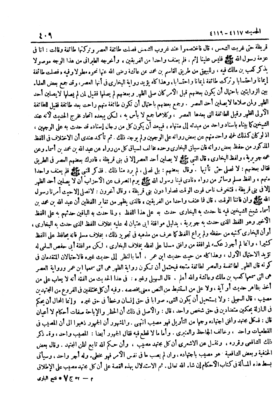 قُرَيْظَةَ حَتَّى غَرَبَتِ الشَّمْسُ قَالَ فَاخْتَصَمُوا عِنْدَ غُرُوبِ الشَّمْسِ فَصَلَّتْ طَائِفَةٌ الْعَصْرَ وَتَرَكَتْهَا طَائِفَةٌ وَقَالَتْ إِنَّا فِي عَزْمَةِ رَسُولِ اللَّهِ صَلَّى اللَّهُ عَلَيْهِ وَسَلَّمَ فَلَيْسَ عَلَيْنَا إِثْمٌ فَلَمْ يُعَنِّفْ وَاحِدًا مِنَ الْفَرِيقَيْنِ وَأَخْرَجَهُ الطَّبَرَانِيُّ مِنْ هَذَا الْوَجْه مَوْصُولا يذكر كَعْبِ بْنِ مَالِكٍ فِيهِ وَلِلْبَيْهَقِيِّ مِنْ طَرِيقِ الْقَاسِمِ بْنِ مُحَمَّدٍ عَنْ عَائِشَةَ رَضِيَ اللَّهُ عَنْهَا نَحْوَهُ مُطَوَّلًا وَفِيهِ فَصَلَّتْ طَائِفَةٌ إِيمَانًا وَاحْتِسَابًا وَتَرَكَتْ طَائِفَةٌ إِيمَانًا وَاحْتِسَابًا وَهَذَا كُلُّهُ يُؤَيِّدُ رِوَايَةَ الْبُخَارِيِّ فِي أَنَّهَا الْعَصْرُ وَقَدْ جَمَعَ بَعْضُ الْعُلَمَاءِ بَيْنَ الرِّوَايَتَيْنِ بِاحْتِمَالِ أَنْ يَكُونَ بَعْضُهُمْ قَبْلَ الْأَمْرِ كَانَ صَلَّى الظُّهْرَ وَبَعْضُهُمْ لَمْ يُصَلِّهَا فَقِيلَ لِمَنْ لَمْ يُصَلِّهَا لَا يُصَلِّيَنَّ أَحَدٌ الظُّهْرَ وَلِمَنْ صَلَّاهَا لَا يُصَلِّيَنَّ أَحَدٌ الْعَصْرَ وَجَمَعَ بَعْضُهُمْ بِاحْتِمَالِ أَنْ تَكُونَ طَائِفَةٌ مِنْهُمْ رَاحَتْ بَعْدَ طَائِفَةٍ فَقِيلَ لِلطَّائِفَةِ الْأُولَى الظُّهْرَ وَقِيلَ لِلطَّائِفَةِ الَّتِي بَعْدَهَا الْعَصْرَ وَكِلَاهُمَا جَمْعٌ لَا بَأْسَ بِهِ لَكِنْ يُبْعِدُهُ اتِّحَادُ مَخْرَجِ الْحَدِيثِ لِأَنَّهُ عِنْدَ الشَّيْخَيْنِ كَمَا بَيَّنَّاهُ بِإِسْنَادٍ وَاحِدٍ مِنْ مَبْدَئِهِ إِلَى مُنْتَهَاهُ فَيَبْعُدُ أَنْ يَكُونَ كُلٌّ مِنْ رِجَالِ إِسْنَادِهِ قَدْ حَدَّثَ بِهِ عَلَى الْوَجْهَيْنِ إِذْ لَوْ كَانَ كَذَلِكَ لَحَمَلَهُ وَاحِدٌ مِنْهُمْ عَنْ بَعْضِ رُوَاتِهِ عَلَى الْوَجْهَيْنِ وَلَمْ يُوجَدْ ذَلِكَ ثُمَّ تَأَكَّدَ عِنْدِي أَنَّ الِاخْتِلَافَ فِي اللَّفْظِ الْمَذْكُورِ مِنْ حِفْظِ بَعْضِ رُوَاتِهِ فَإِنَّ سِيَاقَ الْبُخَارِيِّ وَحْدَهُ مُخَالِفٌ لِسِيَاقِ كُلِّ مَنْ رَوَاهُ عَنْ عَبْدِ اللَّهِ بْنِ مُحَمَّدِ بْنِ أَسْمَاءَ وَعَنْ عَمِّهِ جُوَيْرِيَةَ وَلَفْظُ الْبُخَارِيِّ قَالَ النَّبِيُّ صَلَّى اللَّهُ عَلَيْهِ وَسَلَّمَ لَا يُصَلِّيَنَّ أَحَدٌ الْعَصْرَ إِلَّا فِي بَنِي قُرَيْظَةَ فَأَدْرَكَ بَعْضُهُمُ الْعَصْرَ فِي الطَّرِيقِ فَقَالَ بَعْضُهُمْ لَا نُصَلِّي حَتَّى نَأْتِيَهَا وَقَالَ بَعْضُهُمْ بَلْ نُصَلِّي لَمْ يُرِدْ مِنَّا ذَلِكَ فَذُكِرَ لِلنَّبِيِّ صَلَّى اللَّهُ عَلَيْهِ وَسَلَّمَ فَلَمْ يُعَنِّفْ وَاحِدًا مِنْهُمْ وَلَفْظُ مُسْلِمٍ وَسَائِرِ مِنْ رَوَاهُ نَادَى فِينَا رَسُولُ اللَّهِ صَلَّى اللَّهُ عَلَيْهِ وَسَلَّمَ يَوْمَ انْصَرَفَ عَنِ الْأَحْزَابِ أَنَّ لَا يُصَلِّينَّ أَحَدٌ الظُّهْرَ إِلَّا فِي بَنِي قُرَيْظَةَ فَتَخَوَّفَ نَاسٌ فَوْتَ الْوَقْتِ فَصَلَّوْا دُونَ بَنِي قُرَيْظَةَ وَقَالَ آخَرُونَ لَا نُصَلِّي إِلَّا حَيْثُ أَمَرَنَا رَسُولُ اللَّهِ صَلَّى اللَّهُ عَلَيْهِ وَسَلَّمَ وَإِنْ فَاتَنَا الْوَقْتُ قَالَ فَمَا عَنَّفَ وَاحِدًا مِنَ الْفَرِيقَيْنِ فَالَّذِي يَظْهَرُ مِنْ تَغَايُرِ اللَّفْظَيْنِ أَنَّ عَبْدِ اللَّهِ بْنِ مُحَمَّدِ بْنِ أَسْمَاءَ شَيْخِ الشَّيْخَيْنِ فِيهِ لَمَّا حَدَّثَ بِهِ الْبُخَارِيَّ حَدَّثَ بِهِ عَلَى هَذَا اللَّفْظِ وَلَمَّا حَدَّثَ بِهِ الْبَاقِينَ حَدَّثَهُمْ بِهِ عَلَى اللَّفْظِ الْأَخِيرِ وَهُوَ اللَّفْظُ الَّذِي حَدَّثَ بِهِ جُوَيْرِيَةَ بِدَلِيلِ مُوَافَقَةِ أَبِي عِتْبَانَ لَهُ عَلَيْهِ بِخِلَافِ اللَّفْظِ الَّذِي حَدَّثَ بِهِ الْبُخَارِيُّ أَوْ أَنَّ الْبُخَارِيَّ كَتَبَهُ مِنْ حِفْظِهِ وَلَمْ يُرَاعِ اللَّفْظَ كَمَا عُرِفَ مِنْ مَذْهَبِهِ فِي تَجْوِيزِ ذَلِكَ بِخِلَافِ مُسْ