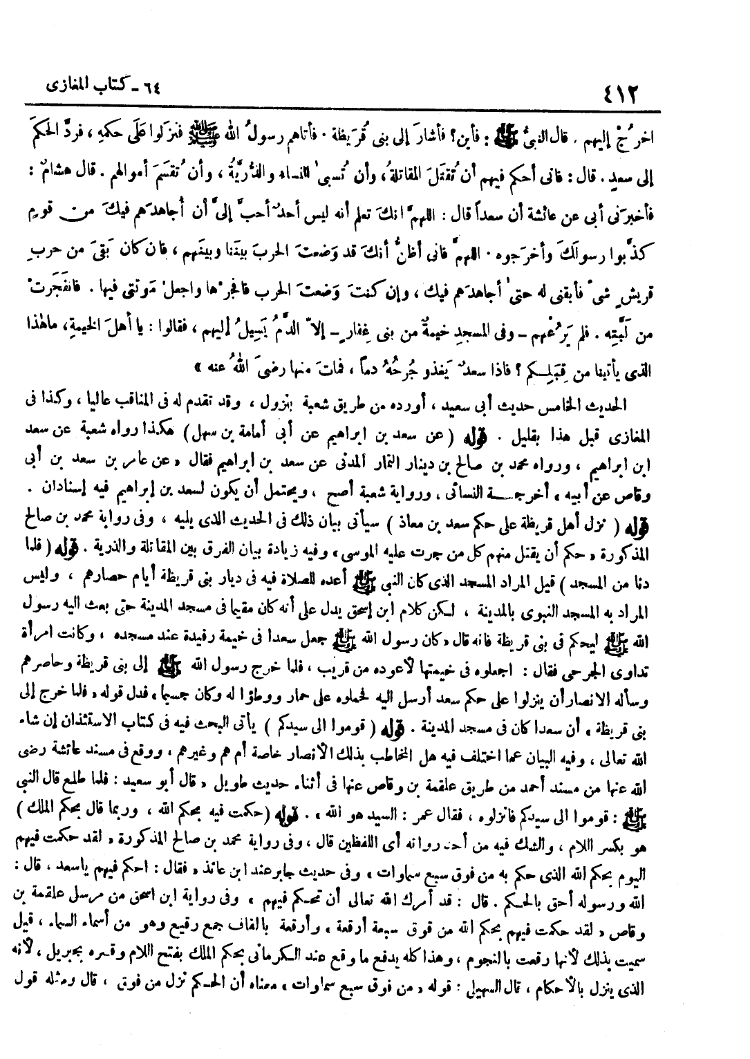 [4121] قَوْلُهُ عَنْ سَعْدِ بْنِ إِبْرَاهِيمَ عَنْ أَبِي أُمَامَةَ بْنِ سَهْلٍ هَكَذَا رَوَاهُ شُعْبَةُ عَنْ سَعْدِ بْنِ إِبْرَاهِيمَ وَرَوَاهُ مُحَمَّدُ بْنُ صَالِحِ بْنِ دِينَارٍ التَّمَّارُ الْمَدَنِيُّ عَنْ سَعْدِ بْنِ إِبْرَاهِيمَ فَقَالَ عَنْ عَامِرِ بْنِ سَعْدِ بْنِ أَبِي وَقَّاصٍ عَنْ أَبِيهِ أَخْرَجَهُ النَّسَائِيُّ وَرِوَايَةُ شُعْبَةَ أَصَحُّ وَيُحْتَمَلُ أَنْ يَكُونَ لِسَعْدِ بْنِ إِبْرَاهِيمَ فِيهِ إِسْنَادَانِ قَوْلُهُ نَزَلَ أَهْلُ قُرَيْظَةَ عَلَى حُكْمِ سَعْدِ بْنِ مُعَاذٍ سَيَأْتِي بَيَانُ ذَلِكَ فِي الْحَدِيثِ الَّذِي يَلِيهِ وَفِي رِوَايَةِ مُحَمَّدِ بْنِ صَالِحٍ الْمَذْكُورَةِ حَكَمَ أَنْ يُقْتَلَ مِنْهُمْ كُلُّ مَنْ جَرَتْ عَلَيْهِ الْمُوسَى وَفِيهِ زِيَادَةُ بَيَانِ الْفَرْقِ بَيْنَ الْمُقَاتِلَةِ وَالذُّرِّيَّةِ قَوْلُهُ فَلَمَّا دَنَا مِنَ الْمَسْجِدِ قِيلَ الْمُرَادُ الْمَسْجِدُ الَّذِي كَانَ النَّبِيُّ صَلَّى اللَّهُ عَلَيْهِ وَسَلَّمَ أَعَدَّهُ لِلصَّلَاةِ فِيهِ فِي دِيَارِ بَنِي قُرَيْظَةَ أَيَّامَ حِصَارِهِمْ وَلَيْسَ الْمُرَادُ بِهِ الْمَسْجِدَ النَّبَوِيّ بِالْمَدِينَةِ لَكِن كَلَام بن إِسْحَاقَ يَدُلُّ عَلَى أَنَّهُ كَانَ مُقِيمًا فِي مَسْجِدِ الْمَدِينَةِ حَتَّى بَعَثَ إِلَيْهِ رَسُولُ اللَّهِ صَلَّى اللَّهُ عَلَيْهِ وَسَلَّمَ لِيَحْكُمَ فِي بَنِي قُرَيْظَةَ فَإِنَّهُ قَالَ كَانَ رَسُولُ اللَّهِ صَلَّى اللَّهُ عَلَيْهِ وَسَلَّمَ جَعَلَ سَعْدًا فِي خَيْمَةِ رَفِيدَةَ عِنْدَ مَسْجِدِهِ وَكَانَتِ امْرَأَةً تُدَاوِي الْجَرْحَى فَقَالَ اجْعَلُوهُ فِي خَيْمَتِهَا لِأَعُودَهُ مِنْ قَرِيبٍ فَلَمَّا خَرَجَ رَسُولُ اللَّهِ صَلَّى اللَّهُ عَلَيْهِ وَسَلَّمَ إِلَى بَنِي قُرَيْظَةَ وَحَاصَرَهُمْ وَسَأَلَهُ الْأَنْصَارُ أَنْ يَنْزِلُوا عَلَى حُكْمِ سَعْدٍ أَرْسَلَ إِلَيْهِ فَحَمَلُوهُ على حمَار ووطؤا لَهُ وَكَانَ جَسِيمًا فَدَلَّ قَوْلُهُ فَلَمَّا خَرَجَ إِلَى بَنِي قُرَيْظَةَ أَنَّ سَعْدًا كَانَ فِي مَسْجِدِ الْمَدِينَةِ قَوْلُهُ قُومُوا إِلَى سَيِّدِكُمْ يَأْتِي الْبَحْثُ فِيهِ فِي كِتَابِ الِاسْتِئْذَانِ إِنْ شَاءَ اللَّهُ تَعَالَى وَفِيهِ الْبَيَانُ عَمَّا اخْتُلِفَ فِيهِ هَلِ الْمُخَاطَبُ بِذَلِكَ الْأَنْصَارُ خَاصَّةً أَمْ هُمْ وَغَيْرُهُمْ وَوَقَعَ فِي مُسْنَدِ عَائِشَةَ رَضِيَ اللَّهُ عَنْهَا مِنْ مُسْنَدِ أَحْمَدَ مِنْ طَرِيقِ عَلْقَمَةَ بْنِ وَقَّاصٍ عَنْهَا فِي أَثْنَاءِ حَدِيثٍ طَوِيلٍ قَالَ أَبُو سَعِيدٍ فَلَمَّا طَلَعَ قَالَ النَّبِيُّ صَلَّى اللَّهُ عَلَيْهِ وَسَلَّمَ قُومُوا إِلَى سَيِّدِكُمْ فَأَنْزِلُوهُ فَقَالَ عُمَرُ السَّيِّدُ هُوَ اللَّهُ قَوْلُهُ حكمت فِيهِ بِحُكْمِ اللَّهِ وَرُبَّمَا قَالَ بِحُكْمِ الْمَلِكِ هُوَ بِكَسْرِ اللَّامِ وَالشَّكُّ فِيهِ مِنْ أَحَدِ رُوَاتِهِ أَيُّ اللَّفْظَيْنِ قَالَ وَفِي رِوَايَةِ مُحَمَّدِ بْنِ صَالِحٍ الْمَذْكُورَةِ لَقَدْ حَكَمْتَ فِيهِمُ الْيَوْمَ بِحُكْمِ اللَّهِ الَّذِي حَكَمَ بِهِ مِنْ فَوْقِ سَبْعِ سماوات وَفِي حَدِيث جَابر عِنْد بن عَائِذٍ فَقَالَ احْكُمْ فِيهِمْ يَا سَعْدُ قَالَ اللَّهُ وَرَسُولُهُ أَحَقُّ بِالْحُكْمِ قَالَ قَدْ أَمَرَكَ اللَّهُ تَعَالَى أَنْ تَحْكُمَ فِيهِمْ وَفِي رِوَايَةِ بن إِسْحَاقَ مِنْ مُرْسَلِ عَلْقَمَةَ بْنِ وَقَّاصٍ لَقَدْ حَكَمْتَ فِيهِمْ بِحُكْمِ اللَّهِ مِنْ فَوْقِ سَبْعَةِ أَرْقِعَةٍ وَأَرْقِعَةٌ بِالْقَافِ جَمْعُ رَقِيعٍ وَهُوَ مِنْ أَسْمَاءِ السَّمَاءِ قِيلَ سُمِّيَتْ بِذَلِكَ لِأَنَّهَا رُقِّعَتْ بِالنُّجُومِ وَهَذَا كُلُّهُ يَدْفَعُ مَا وَقَعَ عِنْدَ الْكَرْمَانِيِّ بِحُكْمِ الْمَلَكِ بِفَتْحِ اللَّامِ وَفَسَّرَهُ بِجِبْرِ