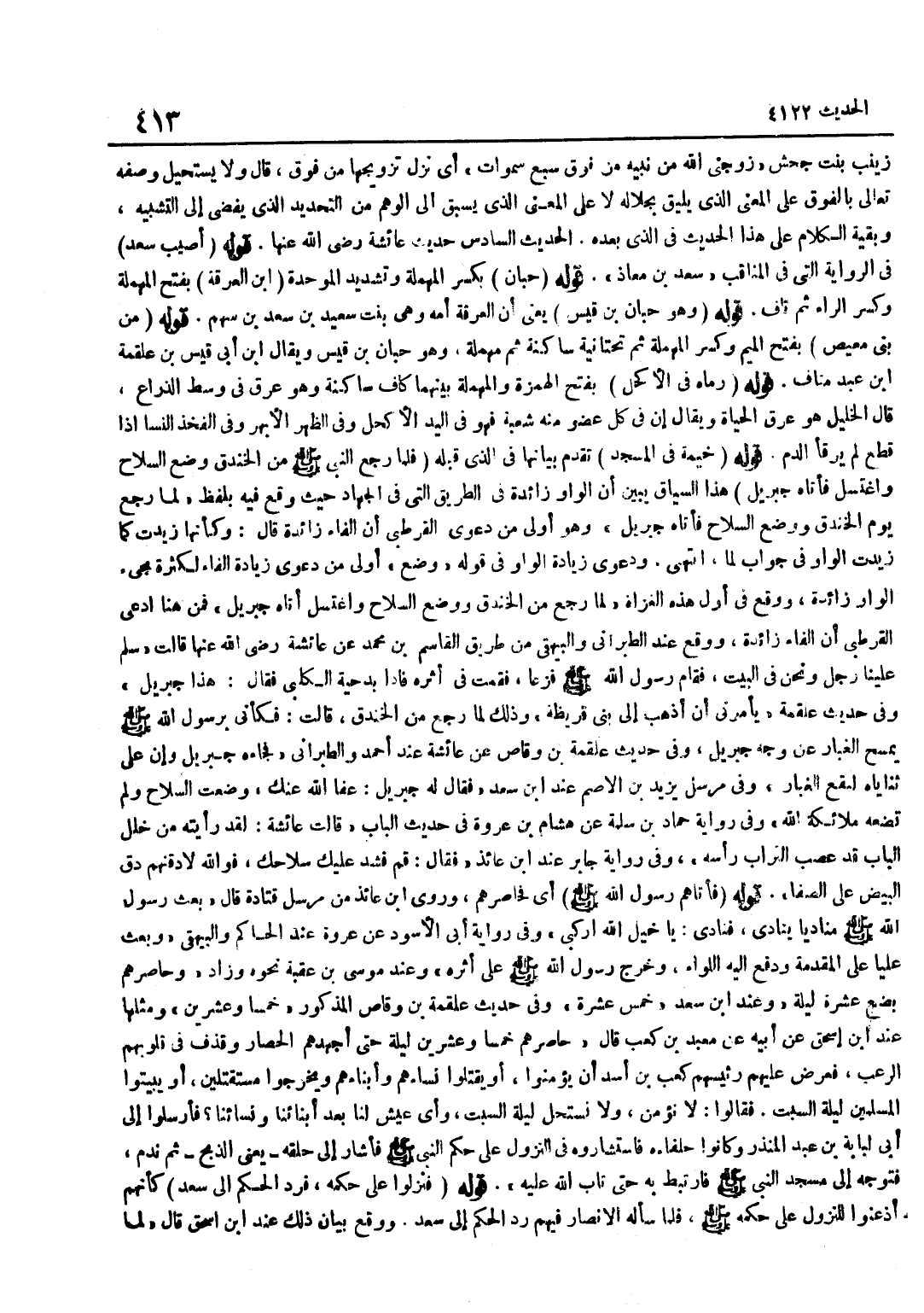 [4122] قَوْلُهُ أُصِيبَ سَعْدٌ فِي الرِّوَايَةِ الَّتِي فِي الْمَنَاقِبِ سَعْدُ بْنُ مُعَاذٍ قَوْلُهُ حِبَّانَ بِكَسْرِ الْمُهْمَلَةِ وَتَشْديد الْمُوَحدَة بن الْعَرِقَةِ بِفَتْحِ الْمُهْمَلَةِ وَكَسْرِ الرَّاءِ ثُمَّ قَافٍ قَوْلُهُ وَهُوَ حِبَّانُ بْنُ قَيْسٍ يَعْنِي أَنَّ الْعَرِقَةَ أُمُّهُ وَهِيَ بِنْتُ سَعِيدِ بْنِ سَعْدِ بْنِ سَهْمٍ قَوْلُهُ مِنْ بَنِي مَعِيصٍ بِفَتْحِ الْمِيمِ وَكَسْرِ الْمُهْمَلَةِ ثُمَّ تَحْتَانِيَّةٌ سَاكِنَةٌ ثُمَّ مُهْملَة وَهُوَ حبَان بن قيس وَيُقَال بن أَبِي قَيْسِ بْنِ عَلْقَمَةَ بْنِ عَبْدِ مَنَافٍ قَوْلُهُ رَمَاهُ فِي الْأَكْحَلِ بِفَتْحِ الْهَمْزَةِ وَالْمُهْمَلَةَ بَيْنَهُمَا كَافٌ سَاكِنَةٌ وَهُوَ عِرْقٌ فِي وَسَطِ الذِّرَاعِ قَالَ الْخَلِيلُ هُوَ عِرْقُ الْحَيَاةِ وَيُقَالُ إِنْ فِي كُلِّ عُضْوٍ مِنْهُ شُعْبَةً فَهُوَ فِي الْيَدِ الْأَكْحَلُ وَفِي الظَّهْرِ الْأَبْهَرُ وَفِي الْفَخِذِ النَّسَا إِذَا قُطِعَ لَمْ يَرْقَأِ الدَّمُ قَوْلُهُ خَيْمَةٌ فِي الْمَسْجِدِ تَقَدَّمَ بَيَانُهَا فِي الَّذِي قَبْلَهُ فَلَمَّا رَجَعَ النَّبِيُّ صَلَّى اللَّهُ عَلَيْهِ وَسَلَّمَ مِنْ الْخَنْدَقِ وَضَعَ السِّلَاحَ وَاغْتَسَلَ فَأَتَاهُ جِبْرِيلُ هَذَا السِّيَاقُ يُبَيِّنُ أَنَّ الْوَاوَ زَائِدَةٌ فِي الطَّرِيقِ الَّتِي فِي الْجِهَادِ حَيْثُ وَقَعَ فِيهِ بِلَفْظِ لَمَّا رَجَعَ يَوْمَ الْخَنْدَقِ وَوَضَعَ السِّلَاحَ فَأَتَاهُ جِبْرِيلُ وَهُوَ أَوْلَى مِنْ دَعْوَى الْقُرْطُبِيِّ أَنَّ الْفَاءَ زَائِدَةٌ قَالَ وَكَأَنَّهَا زِيدَتْ كَمَا زِيدَتِ الْوَاوُ فِي جَوَابِ لَمَّا انْتَهَى وَدَعْوَى زِيَادَةِ الْوَاوِ فِي قَوْلِهِ وَضَعَ أَوْلَى مِنْ دَعْوَى زِيَادَةِ الْفَاءِ لِكَثْرَةِ مَجِيءِ الْوَاوِ زَائِدَةً وَوَقَعَ فِي أَوَّلِ هَذِهِ الْغَزَاةِ لَمَّا رَجَعَ مِنَ الْخَنْدَقِ وَوَضَعَ السِّلَاحَ وَاغْتَسَلَ أَتَاهُ جِبْرِيلُ فَمِنْ هُنَا ادَّعَى الْقُرْطُبِيُّ أَنَّ الْفَاءَ زَائِدَةٌ وَوَقَعَ عِنْدَ الطَّبَرَانِيِّ وَالْبَيْهَقِيِّ مِنْ طَرِيقِ الْقَاسِمِ بْنِ مُحَمَّدٍ عَنْ عَائِشَةَ رَضِيَ اللَّهُ عَنْهَا قَالَتْ سَلَّمَ عَلَيْنَا رَجُلٌ وَنَحْنُ فِي الْبَيْتِ فَقَامَ رَسُولُ اللَّهِ صَلَّى اللَّهُ عَلَيْهِ وَسَلَّمَ فَزِعًا فَقُمْتُ فِي أَثَرِهِ فَإِذَا بِدِحْيَةَ الْكَلْبِيِّ فَقَالَ هَذَا جِبْرِيلُ وَفِي حَدِيثِ عَلْقَمَةَ يَأْمُرُنِي أَنْ أَذْهَبَ إِلَى بَنِي قُرَيْظَةَ وَذَلِكَ لَمَّا رَجَعَ مِنَ الْخَنْدَقِ قَالَتْ فَكَأَنِّي بِرَسُولِ اللَّهِ صَلَّى اللَّهُ عَلَيْهِ وَسَلَّمَ يَمْسَحُ الْغُبَارَ عَنْ وَجْهِ جِبْرِيلَ وَفِي حَدِيثِ عَلْقَمَةَ بْنِ وَقَّاصٍ عَنْ عَائِشَةَ عِنْدَ أَحْمَدَ وَالطَّبَرَانِيِّ فَجَاءَهُ جِبْرِيل وَإِن على ثناياه لنقع الْغُبَارُ وَفِي مُرْسَلِ يَزِيدَ بْنِ الْأَصَمِّ عِنْدَ بن سَعْدٍ فَقَالَ لَهُ جِبْرِيلُ عَفَا اللَّهُ عَنْكَ وَضَعْتَ السِّلَاحَ وَلَمْ تَضَعْهُ مَلَائِكَةُ اللَّهِ وَفِي رِوَايَةِ حَمَّادِ بْنِ سَلَمَةَ عَنْ هِشَامِ بْنِ عُرْوَةَ فِي حَدِيثِ الْبَابِ قَالَتْ عَائِشَةُ لَقَدْ رَأَيْتُهُ مِنْ خَلَلِ الْبَابِ قَدْ عَصَبَ التُّرَابُ رَأسه وَفِي رِوَايَة جَابر عِنْد بن عَائِذٍ فَقَالَ قُمْ فَشُدَّ عَلَيْكَ سِلَاحَكَ فَوَاللَّهِ لَأَدُقَّنَّهُمْ دَقَّ الْبَيْضِ عَلَى الصَّفَا قَوْلُهُ فَأَتَاهُمْ رَسُولِ اللَّهِ صَلَّى اللَّهُ عَلَيْهِ وَسَلَّمَ أَيْ فَحَاصَرَهُمْ وروى بن عَائِذٍ مِنْ مُرْسَلِ قَتَادَةَ قَالَ بَعَثَ رَسُولُ اللَّهِ صَلَّى اللَّهُ عَلَيْهِ وَسَلَّمَ مُنَادِيًا يُنَادِي فَنَادَى يَا خَيْلَ اللَّهِ ارْكَبِي وَفِي رِوَايَةِ أَبِي الْأَسْوَدِ عَنْ عُرْوَةَ عِنْدَ الْحَ