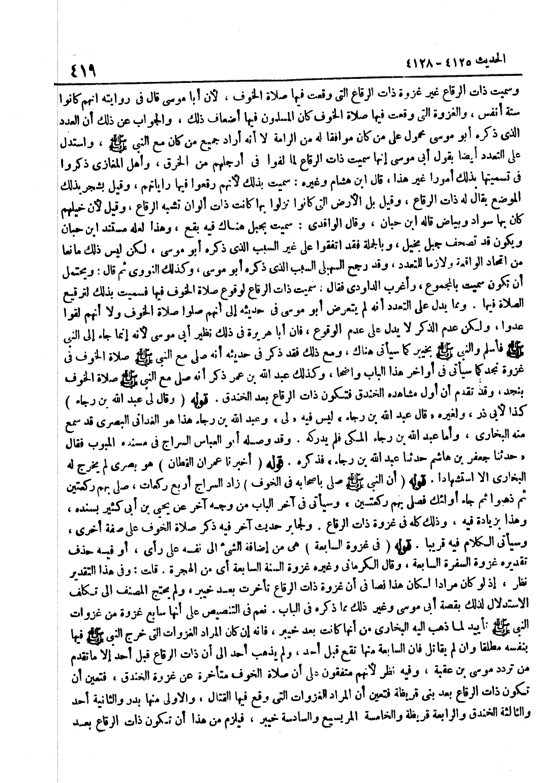 [4125] قَوْلُهُ وَقَالَ لِي عَبْدُ اللَّهِ بْنُ رَجَاءٍ كَذَا لِأَبِي ذَرٍّ وَلِغَيْرِهِ قَالَ عَبْدُ اللَّهِ بْنُ رَجَاءٍ لَيْسَ فِيهِ لِي وَعَبْدُ اللَّهِ بْنُ رَجَاءٍ هَذَا هُوَ الْغُدَانِيُّ الْبِصْرَيُّ قَدْ سَمِعَ مِنْهُ الْبُخَارِيُّ وَأَمَّا عَبْدُ اللَّهِ بْنُ رَجَاءٍ الْمَكِّيُّ فَلَمْ يُدْرِكْهُ وَقَدْ وَصَلَهُ أَبُو الْعَبَّاسِ السَّرَّاجُ فِي مُسْنَدِهِ الْمُبَوَّبِ فَقَالَ حَدَّثَنَا جَعْفَرُ بْنُ هَاشِمٍ حَدَّثَنَا عَبْدُ اللَّهِ بْنُ رَجَاءٍ فَذَكَرَهُ قَوْلُهُ أَخْبَرَنَا عِمْرَانُ الْقَطَّانُ هُوَ بَصْرِيٌّ لَمْ يُخَرِّجْ لَهُ الْبُخَارِيُّ إِلَّا اسْتِشْهَادًا قَوْلُهُ أَنَّ النَّبِيَّ صَلَّى اللَّهُ عَلَيْهِ وَسَلَّمَ صَلَّى بِأَصْحَابِهِ فِي الْخَوْفِ زَادَ السَّرَّاجُ أَرْبَعَ رَكَعَاتٍ صَلَّى بِهِمْ رَكْعَتَيْنِ ثُمَّ ذَهَبُوا ثُمَّ جَاءَ أُولَئِكَ فَصَلَّى بِهِمْ رَكْعَتَيْنِ وَسَيَأْتِي فِي آخِرِ الْبَابِ مِنْ وَجْهٍ آخَرَ عَنِ يَحْيَى بْنِ أَبِي كَثِيرٍ بِسَنَدِهِ وَهَذَا بِزِيَادَةٍ فِيهِ وَذَلِكَ كُلُّهُ فِي غَزْوَةِ ذَاتِ الرِّقَاعِ وَلِجَابِرٍ حَدِيثٌ آخَرُ فِيهِ ذِكْرُ صَلَاةِ الْخَوْفِ عَلَى صِفَةٍ أُخْرَى وَسَيَأْتِي الْكَلَامُ فِيهِ قَرِيبًا قَوْلُهُ فِي غَزْوَةِ السَّابِعَةِ هِيَ مِنْ إِضَافَةِ الشَّيْءِ إِلَى نَفْسِهِ عَلَى رَأْيٍ أَوْ فِيهِ حَذْفٌ تَقْدِيرُهُ غَزْوَةُ السَّفْرَةِ السَّابِعَةِ وَقَالَ الْكَرْمَانِيُّ وَغَيْرُهُ غَزْوَةُ السَّنَةِ السَّابِعَةِ أَيْ مِنَ الْهِجْرَةِ قُلْتُ وَفِي هَذَا التَّقْدِيرِ نَظَرٌ إِذْ لَوْ كَانَ مُرَادًا لَكَانَ هَذَا نَصًّا فِي أَنَّ غَزْوَةَ ذَاتِ الرِّقَاعِ تَأَخَّرَتْ بَعْدَ خَيْبَرَ وَلَمْ يَحْتَجِ الْمُصَنِّفُ إِلَى تَكَلُّفِ الِاسْتِدْلَالِ لِذَلِكَ بِقِصَّةِ أَبِي مُوسَى وَغَيْرِ ذَلِكَ مِمَّا ذَكَرَهُ فِي الْبَابِ نَعَمْ فِي التَّنْصِيصِ عَلَى أَنَّهَا سَابِعُ غَزْوَةٍ مِنْ غَزَوَاتِ النَّبِيِّ صَلَّى اللَّهُ عَلَيْهِ وَسَلَّمَ تَأْيِيدٌ لِمَا ذهب إِلَيْهِ البُخَارِيّ من أَنَّهَا كَانَت بَعْدَ خَيْبَرَ فَإِنَّهُ إِنْ كَانَ الْمُرَادُ الْغَزَوَاتُ الَّتِي خَرَجَ النَّبِيُّ صَلَّى اللَّهُ عَلَيْهِ وَسَلَّمَ فِيهَا بِنَفْسِهِ مُطْلَقًا وَإِنْ لَمْ يُقَاتِلْ فَإِنَّ السَّابِعَةَ مِنْهَا تَقَعُ قَبْلَ أُحُدٍ وَلَمْ يَذْهَبْ أَحَدٌ إِلَى أَنَّ ذَاتَ الرِّقَاعِ قَبْلَ أُحُدٍ إِلَّا مَا تَقَدَّمَ مِنْ تَرَدُّدِ مُوسَى بْنِ عُقْبَةَ وَفِيهِ نَظَرٌ لِأَنَّهُمْ مُتَّفِقُونَ عَلَى أَنَّ صَلَاةَ الْخَوْفِ مُتَأَخِّرَةٌ عَنْ غَزْوَةِ الْخَنْدَقِ فَتَعَيَّنَ أَنْ تَكُونَ ذَاتُ الرِّقَاعِ بَعْدَ بَنِي قُرَيْظَةَ فَتَعَيَّنَ أَنَّ الْمُرَادَ الْغَزَوَاتُ الَّتِي وَقَعَ فِيهَا الْقِتَالُ وَالْأُولَى مِنْهَا بَدْرٌ وَالثَّانِيَةُ أُحُدٌ وَالثَّالِثَةُ الْخَنْدَقُ وَالرَّابِعَةُ قُرَيْظَةُ وَالْخَامِسَةُ الْمُرَيْسِيعُ وَالسَّادِسَةُ خَيْبَرُ فَيَلْزَمُ مِنْ هَذَا أَنْ تَكُونَ ذَاتُ الرِّقَاعِ بعد