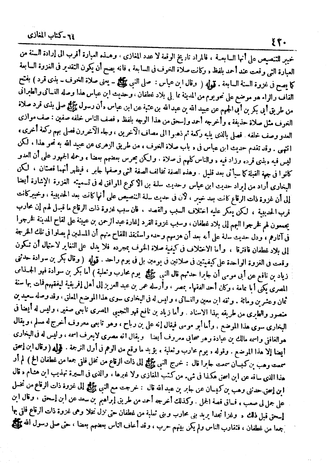 خَيْبَرَ لِلتَّنْصِيصِ عَلَى أَنَّهَا السَّابِعَةُ فَالْمُرَادُ تَارِيخُ الْوَقْعَةِ لَا عَدَدَ الْمَغَازِي وَهَذِهِ الْعِبَارَةُ أَقْرَبُ إِلَى إِرَادَةِ السَّنَةِ مِنَ الْعِبَارَةِ الَّتِي وَقَعَتْ عِنْدَ أَحْمَدَ بِلَفْظِ وَكَانَتْ صَلَاةُ الْخَوْفِ فِي السَّابِعَةِ فَإِنَّهُ يَصِحُّ أَنْ يَكُونَ التَّقْدِيرُ فِي الْغَزْوَةِ السَّابِعَةِ كَمَا يَصِحُّ فِي غَزْوَةِ السَّنَةِ السَّابِعَة قَوْله وَقَالَ بن عَبَّاسٍ صَلَّى النَّبِيُّ صَلَّى اللَّهُ عَلَيْهِ وَسَلَّمَ يَعْنِي صَلَاةَ الْخَوْفِ بِذِي قَرَدٍ بِفَتْحِ الْقَافِ وَالرَّاءِ هُوَ مَوْضِعٌ عَلَى نَحْوِ يَوْمٍ مِنَ الْمَدِينَة مِمَّا يَلِي بِلَاد غطفان وَحَدِيث بن عَبَّاسٍ هَذَا وَصَلَهُ النَّسَائِيُّ وَالطَّبَرَانِيُّ مِنْ طَرِيقِ أَبِي بَكْرِ بْنِ أَبِي الْجَهْمِ عَنْ عُبَيْدِ اللَّهِ بْنِ عَبْدِ اللَّهِ بْنِ عُتْبَةَ عَنِ بن عَبَّاسٍ أَنَّ رَسُولَ اللَّهِ صَلَّى اللَّهُ عَلَيْهِ وَسَلَّمَ صَلَّى بِذِي قَرَدٍ صَلَاةَ الْخَوْفِ مِثْلَ صَلَاةِ حُذَيْفَةَ وَأَخْرَجَهُ أَحْمَدُ وَإِسْحَاقُ مِنْ هَذَا الْوَجْهِ بِلَفْظِ فَصَفَّ النَّاسَ خَلْفَهُ صَفَّيْنِ صَفٌّ مُوَازِي الْعَدُوِّ وَصَفٌّ خَلْفَهُ فَصَلَّى بِالَّذِي يَلِيهِ رَكْعَةً ثُمَّ ذَهَبُوا إِلَى مَصَافِّ الْآخَرِينَ وَجَاءَ الْآخَرُونَ فَصَلَّى بِهِمْ رَكْعَةً أُخْرَى انْتَهَى وَقَدْ تقدم حَدِيث بن عَبَّاسٍ فِي بَابِ صَلَاةِ الْخَوْفِ مِنْ طَرِيقِ الزُّهْرِيِّ عَنْ عُبَيْدِ اللَّهِ بِهِ نَحْوَ هَذَا لَكِنْ لَيْسَ فِيهِ بِذِي قَرَدٍ وَزَادَ فِيهِ وَالنَّاسُ كُلُّهُمْ فِي صَلَاةٍ وَلَكِنْ يَحْرُسُ بَعْضُهُمْ بَعْضًا وَحَمَلَهُ الْجُمْهُورُ عَلَى أَنَّ الْعَدُوَّ كَانُوا فِي جِهَةِ الْقِبْلَةِ كَمَا سَيَأْتِي بَعْدَ قَلِيلٍ وَهَذِهِ الصِّفَةُ تُخَالِفُ الصِّفَةَ الَّتِي وَصَفَهَا جَابِرٌ فَيَظْهَرُ أَنَّهُمَا قِصَّتَانِ لَكِنَّ الْبُخَارِيَّ أَرَادَ مِنْ إِيرَاد حَدِيث بن عَبَّاسٍ وَحَدِيثِ سَلَمَةَ بْنِ الْأَكْوَعِ الْمُوَافِقِ لَهُ فِي تَسْمِيَتِهِ الْغَزْوَةَ الْإِشَارَةَ أَيْضًا إِلَى أَنَّ غَزْوَةَ ذَاتِ الرِّقَاعِ كَانَتْ بَعْدَ خَيْبَرَ لِأَنَّ فِي حَدِيثِ سَلَمَةَ التَّنْصِيصَ عَلَى أَنَّهَا كَانَتْ بَعْدَ الْحُدَيْبِيَةِ وَخَيْبَرُ كَانَتْ قُرْبَ الْحُدَيْبِيَةِ لَكِنْ يُعَكِّرُ عَلَيْهِ اخْتِلَافُ السَّبَبِ وَالْقَصْدِ فَإِنَّ سَبَبَ غَزْوَةِ ذَاتِ الرِّقَاعِ مَا قِيلَ لَهُمْ إِنَّ مُحَارِبَ يَجْمَعُونَ لَهُمْ فَخَرَجُوا إِلَيْهِمْ إِلَى بِلَادِ غَطَفَانَ وَسَبَبُ غَزْوَةِ الْقَرَدِ إِغَارَةُ عَبْدِ الرَّحْمَنِ بْنِ عُيَيْنَةَ عَلَى لِقَاحِ الْمَدِينَةِ فَخَرَجُوا فِي آثَارِهِمْ وَدَلَّ حَدِيثُ سَلَمَةَ عَلَى أَنَّهُ بَعْدَ أَنْ هَزَمَهُمْ وَحْدَهُ وَاسْتَنْقَذَ اللِّقَاحَ مِنْهُمْ أَنَّ الْمُسْلِمِينَ لَمْ يَصِلُوا فِي تِلْكَ الْخَرْجَةِ إِلَى بِلَادِ غَطَفَانَ فَافْتَرَقَا وَأَمَّا الِاخْتِلَافُ فِي كَيْفِيَّةِ صَلَاةِ الْخَوْفِ بِمُجَرَّدِهِ فَلَا يَدُلُّ عَلَى التَّغَايُرِ لِاحْتِمَالِ أَنْ تَكُونَ وَقَعَتْ فِي الْغَزْوَةِ الْوَاحِدَةِ عَلَى كَيْفِيَّتَيْنِ فِي صَلَاتَيْنِ فِي يَوْمَيْنِ بَلْ فِي يَوْمٍ وَاحِدٍ قَوْلُهُ وَقَالَ بَكْرُ بْنُ سَوَادَةَ حَدَّثَنِي زِيَادُ بْنُ نَافِعٍ عَنْ أَبِي مُوسَى أَنَّ جَابِرًا حَدَّثَهُمْ قَالَ النَّبِيُّ صَلَّى اللَّهُ عَلَيْهِ وَسَلَّمَ يَوْمَ مُحَارِبَ وَثَعْلَبَةَ أَمَّا بَكْرُ بْنُ سَوَادَةَ فَهُوَ الْجُذَامِيُّ الْمِصْرِيُّ يُكَنَّى أَبَا ثُمَامَةَ وَكَانَ أَحَدَ الْفُقَهَاءِ بِمِصْرَ وَأَرْسَلَهُ عُمَرُ بْنُ عَبْدِ الْعَزِيزِ إِلَى أَهْلِ إِفْرِيقِيَّةَ لِيُفَقِّهَ