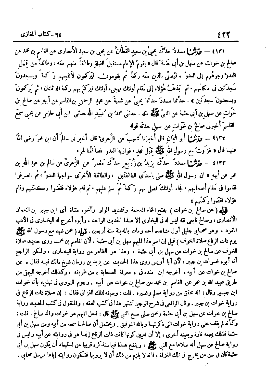 [4129] قَوْلُهُ عَنْ صَالِحِ بْنِ خَوَّاتٍ بِفَتْحِ الْخَاءِ الْمُعْجَمَة وَتَشْديد الْوَاو وَآخره مثناة أَي بن جُبَيْرِ بْنِ النُّعْمَانِ الْأَنْصَارِيُّ وَصَالِحٌ تَابِعِيٌّ ثِقَةٌ لَيْسَ لَهُ فِي الْبُخَارِيِّ إِلَّا هَذَا الْحَدِيثُ الْوَاحِدُ وَأَبُوهُ أَخْرَجَ لَهُ الْبُخَارِيُّ فِي الْأَدَبِ الْمُفْرَدِ وَهُوَ صَحَابِيٌّ جَلِيلٌ أَوَّلُ مَشَاهِدِهِ أُحُدٌ وَمَاتَ بِالْمَدِينَةِ سَنَةَ أَرْبَعِينَ قَوْلُهُ عَمَّنْ شَهِدَ مَعَ رَسُولِ اللَّهِ صَلَّى اللَّهُ عَلَيْهِ وَسَلَّمَ يَوْمَ ذَاتِ الرِّقَاعِ صَلَاةَ الْخَوْفِ قِيلَ إِنَّ اسْم هَذَا الْمُبْهم سهل بن أَبِي حَثْمَةَ لِأَنَّ الْقَاسِمَ بْنَ مُحَمَّدٍ رَوَى حَدِيثَ صَلَاةِ الْخَوْفِ عَنْ صَالِحِ بْنِ خَوَّاتٍ عَنْ سَهْلِ بْنِ أَبِي حَثْمَةَ وَهَذَا هُوَ الظَّاهِرُ مِنْ رِوَايَةِ الْبُخَارِيِّ وَلَكِنَّ الرَّاجِحَ أَنَّهُ أَبُوهُ خَوَّاتُ بْنُ جُبَيْرٍ لِأَنَّ أَبَا أُوَيْسٍ رَوَى هَذَا الْحَدِيثَ عَنْ يَزِيدَ بْنِ رُومَانَ شَيْخِ مَالِكٍ فِيهِ فَقَالَ عَنْ صَالِحِ بْنِ خَوات عَن أَبِيه أخرجه بن مَنْدَهْ فِي مَعْرِفَةِ الصَّحَابَةِ مِنْ طَرِيقِهِ وَكَذَلِكَ أَخْرَجَهُ الْبَيْهَقِيُّ مِنْ طَرِيقِ عُبَيْدِ اللَّهِ بْنِ عُمَرَ عَنْ الْقَاسِمِ بْنِ مُحَمَّدٍ عَنْ صَالِحِ بْنِ خَوَّاتٍ عَنْ أَبِيهِ وَجَزَمَ النَّوَوِيُّ فِي تَهْذِيبِهِ بِأَنَّهُ خَوَّاتُ بْنُ جُبَيْرٍ وَقَالَ إِنَّهُ مُحَقَّقٌ مِنْ رِوَايَةِ مُسْلِمٍ وَغَيْرِهِ قُلْتُ وَسَبَقَهُ لِذَلِكَ الْغَزَّالِيُّ فَقَالَ إِنَّ صَلَاةَ ذَاتِ الرِّقَاعِ فِي رِوَايَةِ خَوَّاتِ بْنِ جُبَيْرٍ وَقَالَ الرَّافِعِيُّ فِي شَرْحِ الْوَجِيزِ اشْتُهِرَ هَذَا فِي كُتُبِ الْفِقْهِ وَالْمَنْقُولُ فِي كُتُبِ الْحَدِيثِ رِوَايَةُ صَالِحِ بْنِ خَوَّاتٍ عَنْ سَهْلِ بْنِ أَبِي حَثْمَةَ وَعَمَّنْ صَلَّى مَعَ النَّبِيِّ صَلَّى اللَّهُ عَلَيْهِ وَسَلَّمَ قَالَ فَلَعَلَّ الْمُبْهَمَ هُوَ خَوَّاتٌ وَالِدُ صَالِحٍ قُلْتُ وَكَأَنَّهُ لَمْ يَقِفْ عَلَى رِوَايَةِ خَوَّاتٍ الَّتِي ذَكَرْتُهَا وَبِاللَّهِ التَّوْفِيقُ وَيُحْتَمَلُ أَنَّ صَالِحًا سَمِعَهُ مِنْ أَبِيهِ وَمِنْ سَهْلِ بْنِ أَبِي حَثْمَةَ فَلِذَلِكَ يُبْهِمُهُ تَارَةً وَيُعَيِّنُهُ أُخْرَى إِلَّا أَنَّ تَعْيِينَ كَوْنِهَا كَانَتْ ذَاتَ الرِّقَاعِ إِنَّمَا هُوَ فِي رِوَايَتِهِ عَنْ أَبِيهِ وَلَيْسَ فِي رِوَايَةِ صَالِحٍ عَنْ سَهْلٍ أَنَّهُ صَلَّاهَا مَعَ النَّبِيِّ صَلَّى اللَّهُ عَلَيْهِ وَسَلَّمَ وَيَنْفَعُ هَذَا فِيمَا سَنَذْكُرُهُ قَرِيبًا مِنِ اسْتِبْعَادِ أَنْ يَكُونَ سَهْلُ بْنُ أَبِي حَثْمَةَ كَانَ فِي سِنِّ مَنْ يَخْرُجُ فِي تِلْكَ الْغُزَاةِ فَإِنَّهُ لَا يَلْزَمُ مِنْ ذَلِكَ أَنْ لَا يَرْوِيَهَا فَتَكُونُ رِوَايَتُهُ إِيَّاهَا مُرْسَلَ صَحَابِيٍّ