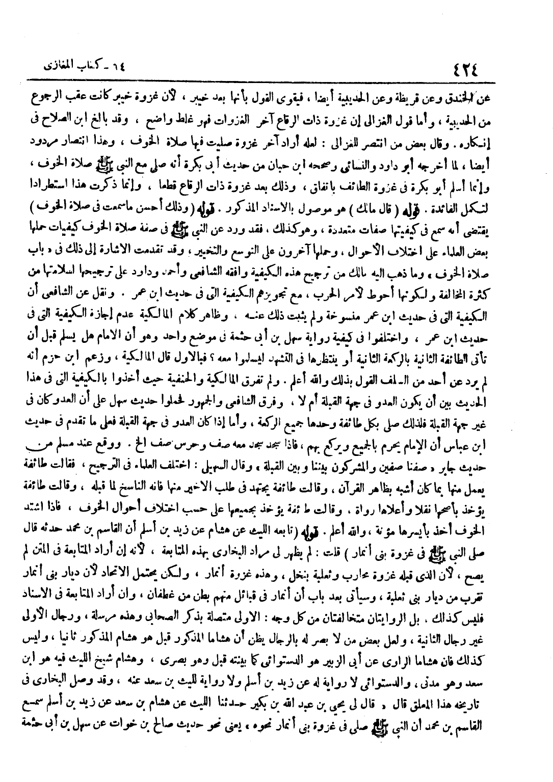 عَنِ الْخَنْدَقِ وَعَنْ قُرَيْظَةَ وَعَنِ الْحُدَيْبِيَةِ أَيْضًا فَيَقْوَى الْقَوْلُ بِأَنَّهَا بَعْدَ خَيْبَرَ لِأَنَّ غَزْوَةَ خَيْبَرَ كَانَتْ عَقِبَ الرُّجُوعِ مِنَ الْحُدَيْبِيَةِ وَأَمَّا قَوْلُ الْغَزَّالِيِّ إِنَّ غَزْوَةَ ذَاتِ الرِّقَاعِ آخِرُ الْغَزَوَات فَهُوَ غلط وَاضح وَقد بَالغ بن الصَّلَاحِ فِي إِنْكَارِهِ وَقَالَ بَعْضُ مَنِ انْتَصَرَ لِلْغَزَّالِيِّ لَعَلَّهُ أَرَادَ آخِرَ غَزْوَةٍ صُلِّيَتْ فِيهَا صَلَاةُ الْخَوْفِ وَهَذَا انْتِصَارٌ مَرْدُودٌ أَيْضًا لِمَا أخرجه أَبُو دَاوُد وَالنَّسَائِيّ وَصَححهُ بن حِبَّانَ مِنْ حَدِيثِ أَبِي بَكْرَةَ أَنَّهُ صَلَّى مَعَ النَّبِيِّ صَلَّى اللَّهُ عَلَيْهِ وَسَلَّمَ صَلَاةَ الْخَوْفِ وَإِنَّمَا أَسْلَمَ أَبُو بَكْرَةَ فِي غَزْوَةِ الطَّائِفِ بِاتِّفَاقٍ وَذَلِكَ بَعْدَ غَزْوَةِ ذَاتِ الرِّقَاعِ قَطْعًا وَإِنَّمَا ذَكَرْتُ هَذَا اسْتِطْرَادًا لِتَكْمُلَ الْفَائِدَةُ قَوْلُهُ قَالَ مَالِكٌ هُوَ مَوْصُولٌ بِالْإِسْنَادِ الْمَذْكُورِ قَوْلُهُ وَذَلِكَ أَحْسَنُ مَا سَمِعْتُ فِي صَلَاةِ الْخَوْفِ يَقْتَضِي أَنَّهُ سَمِعَ فِي كَيْفِيَّتِهَا صِفَاتٍ مُتَعَدِّدَةً وَهُوَ كَذَلِكَ فَقَدْ وَرَدَ عَنِ النَّبِيِّ صَلَّى اللَّهُ عَلَيْهِ وَسَلَّمَ فِي صِفَةِ صَلَاةِ الْخَوْفِ كَيْفِيَّاتٌ حَمَلَهَا بَعْضُ الْعُلَمَاءِ عَلَى اخْتِلَافِ الْأَحْوَالِ وَحَمَلَهَا آخَرُونَ عَلَى التَّوَسُّعِ وَالتَّخْيِيرِ وَقَدْ تَقَدَّمَتِ الْإِشَارَةُ إِلَى ذَلِكَ فِي بَابِ صَلَاةِ الْخَوْفِ وَمَا ذَهَبَ إِلَيْهِ مَالِكٌ مِنْ تَرْجِيحِ هَذِهِ الْكَيْفِيَّةِ وَافَقَهُ الشَّافِعِيُّ وَأَحْمَدُ وَدَاوُدُ عَلَى تَرْجِيحِهَا لِسَلَامَتِهَا مِنْ كَثْرَةِ الْمُخَالَفَةِ وَلِكَوْنِهَا أَحْوَطَ لِأَمْرِ الْحَرْبِ مَعَ تَجْوِيزِهِمُ الْكَيْفِيَّةَ الَّتِي فِي حَدِيث بن عُمَرَ وَنُقِلَ عَنِ الشَّافِعِيِّ أَنَّ الْكَيْفِيَّةَ الَّتِي فِي حَدِيث بن عُمَرَ مَنْسُوخَةٌ وَلَمْ يَثْبُتْ ذَلِكَ عَنْهُ وَظَاهِرُ كَلَامِ الْمَالِكِيَّةِ عَدَمُ إِجَازَةِ الْكَيْفِيَّةِ الَّتِي فِي حَدِيث بن عُمَرَ وَاخْتَلَفُوا فِي كَيْفِيَّةِ رِوَايَةِ سَهْلِ بْنِ أَبِي حَثْمَةَ فِي مَوْضِعٍ وَاحِدٍ وَهُوَ أَنَّ الْإِمَامَ هَلْ يُسَلِّمُ قَبْلَ أَنْ تَأْتِيَ الطَّائِفَةُ الثَّانِيَةُ بِالرَّكْعَةِ الثَّانِيَةِ أَوْ يَنْتَظِرُهَا فِي التَّشَهُّدِ ليسلموا مَعَه فبالأول قَالَ الْمَالِكِيَّة وَزعم بن حَزْمٍ أَنَّهُ لَمْ يَرِدْ عَنْ أَحَدٍ مِنَ السَّلَفِ الْقَوْلُ بِذَلِكَ وَاللَّهُ أَعْلَمُ وَلَمْ تُفَرِّقِ الْمَالِكِيَّةُ وَالْحَنَفِيَّةُ حَيْثُ أَخَذُوا بِالْكَيْفِيَّةِ الَّتِي فِي هَذَا الْحَدِيثِ بَيْنَ أَنْ يَكُونَ الْعَدُوُّ فِي جِهَةِ الْقِبْلَةِ أَمْ لَا وَفَرَّقَ الشَّافِعِيُّ وَالْجُمْهُورُ فَحَمَلُوا حَدِيثَ سَهْلٍ عَلَى أَنَّ الْعَدُوَّ كَانَ فِي غَيْرِ جِهَةِ الْقِبْلَةِ فَلِذَلِكَ صَلَّى بِكُلِّ طَائِفَةٍ وَحْدَهَا جَمِيعَ الرَّكْعَةِ وَأَمَّا إِذَا كَانَ الْعَدُوُّ فِي جِهَةِ الْقِبْلَةِ فَعَلَى مَا تَقَدَّمَ فِي حَدِيث بن عَبَّاسٍ أَنَّ الْإِمَامَ يُحْرِمُ بِالْجَمِيعِ وَيَرْكَعُ بِهِمْ فَإِذَا سَجَدَ سَجَدَ مَعَهُ صَفٌّ وَحَرَسَ صَفٌّ إِلَخْ وَوَقَعَ عِنْدَ مُسْلِمٍ مِنْ حَدِيثِ جَابِرٍ صَفَّنَا صَفَّيْنِ وَالْمُشْرِكُونَ بَيْنَنَا وَبَيْنَ الْقِبْلَةِ وَقَالَ السُّهَيْلِيُّ اخْتَلَفَ الْعُلَمَاءُ فِي التَّرْجِيحِ فَقَالَتْ طَائِفَةٌ يُعْمَلُ مِنْهَا بِمَا كَانَ أَشْبَهَ بِظَاهِرِ الْقُرْآنِ وَقَالَتْ طَائِفَةٌ يَجْتَهِدُ فِي طَلَبِ الْأَخِيرِ مِنْهَا فَإِنَّهُ النَّاسِخُ لِمَا قَبْلَهُ وَقَالَتْ طَائِفَةٌ يُؤْخَذُ بِأَصَحِّه