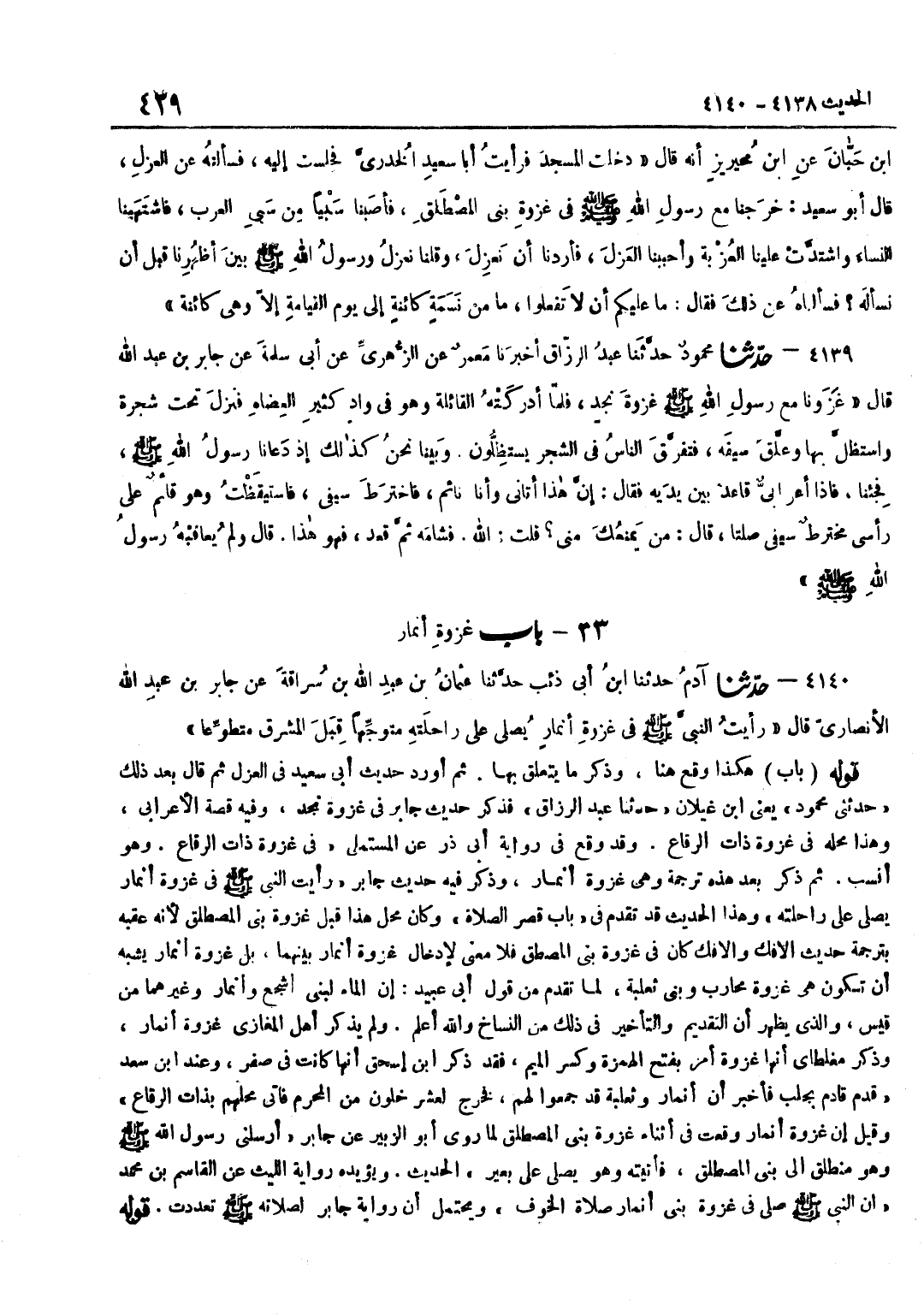 هَكَذَا وَقَعَ هُنَا وَذَكَرَ مَا يَتَعَلَّقُ بِهَا ثُمَّ أَوْرَدَ حَدِيثَ أَبِي سَعِيدٍ فِي الْعَزْلِ ثُمَّ قَالَ بَعْدَ ذَلِكَ حَدَّثَنِي مَحْمُود يَعْنِي بن غَيْلَانَ حَدَّثَنَا عَبْدُ الرَّزَّاقِ فَذَكَرَ حَدِيثَ جَابِرٍ فِي غَزْوَة نحد وَفِيهِ قِصَّةُ الْأَعْرَابِيِّ وَهَذَا مَحَلُّهُ فِي غَزْوَةِ ذَاتِ الرِّقَاعِ وَقَدْ وَقَعَ فِي رِوَايَةِ أَبِي ذَرٍّ عَنِ الْمُسْتَمْلِي فِي غَزْوَةِ ذَاتِ الرِّقَاعِ وَهُوَ أنسب ثمَّ ذكر بعد هَذِه تَرْجَمَة وَهِي غَزْوَة أَنْمَار وَذكر فِيهِ حَدِيثَ جَابِرٍ رَأَيْتُ النَّبِيُّ صَلَّى اللَّهُ عَلَيْهِ وَسَلَّمَ فِي غَزْوَةِ أَنْمَارَ يُصَلِّي عَلَى رَاحِلَتِهِ وَهَذَا الْحَدِيثُ قَدْ تَقَدَّمَ فِي بَابِ قَصْرِ الصَّلَاةِ وَكَانَ مَحَلُّ هَذَا قَبْلَ غَزْوَةِ بَنِي الْمُصْطَلِقِ لِأَنَّهُ عَقَّبَهُ بِتَرْجَمَةِ حَدِيثِ الْإِفْكِ وَالْإِفْكُ كَانَ فِي غَزْوَةِ بَنِي الْمُصْطَلِقِ فَلَا مَعْنَى لِإِدْخَالِ غَزْوَةِ أَنْمَارَ بَيْنَهُمَا بَلْ غَزْوَةُ أَنْمَارَ يُشْبِهُ أَنْ تَكُونَ هِيَ غَزْوَةُ مُحَارِبَ وَبَنِي ثَعْلَبَةَ لِمَا تَقَدَّمَ مِنْ قَوْلِ أَبِي عُبَيْدٍ إِنَّ الْمَاءَ لِبَنِي أَشْجَعَ وَأَنْمَارَ وَغَيْرِهِمَا مِنْ قَيْسٍ وَالَّذِي يَظْهَرُ أَنَّ التَّقْدِيمَ وَالتَّأْخِيرَ فِي ذَلِكَ مِنَ النُّسَّاخِ وَاللَّهُ أَعْلَمُ وَلَمْ يَذْكُرْ أَهْلُ الْمَغَازِي غَزْوَةَ أَنْمَارَ وَذَكَرَ مُغَلْطَايْ أَنَّهَا غَزْوَةُ أَمِرَ بِفَتْحِ الْهَمْزَةِ وَكَسْرِ الْمِيمِ فَقَدْ ذكر بن إِسْحَاق أَنَّهَا كَانَت فِي صفر وَعند بن سَعْدٍ قَدِمَ قَادِمٌ بِجَلْبٍ فَأَخْبَرَ أَنَّ أَنْمَارَ وَثَعْلَبَةَ قَدْ جَمَعُوا لَهُمْ فَخَرَجَ لِعَشْرٍ خَلَوْنَ مِنَ الْمُحَرَّمِ فَأَتَى مَحَلَّهُمْ بِذَاتِ الرِّقَاعِ وَقِيلَ إِنْ غَزْوَةَ أَنْمَارَ وَقَعَتْ فِي أَثْنَاءِ غَزْوَةِ بَنِي الْمُصْطَلِقِ لِمَا رَوَى أَبُو الزُّبَيْرِ عَنْ جَابِرٍ أَرْسَلَنِي رَسُولُ اللَّهِ صَلَّى اللَّهُ عَلَيْهِ وَسَلَّمَ وَهُوَ مُنْطَلِقٌ إِلَى بَنِي الْمُصْطَلِقِ فَأَتَيْتُهُ وَهُوَ يُصَلِّي عَلَى بَعِيرٍ الْحَدِيثَ وَيُؤَيِّدُهُ رِوَايَةُ اللَّيْثِ عَنِ الْقَاسِمِ بْنِ مُحَمَّدٍ أَنَّ النَّبِيَّ صَلَّى اللَّهُ عَلَيْهِ وَسَلَّمَ صَلَّى فِي غَزْوَةِ بَنِي أَنْمَارَ صَلَاةَ الْخَوْفِ وَيُحْتَمَلُ أَنَّ رِوَايَةَ جَابِرٍ لِصَلَاتِهِ صَلَّى اللَّهُ عَلَيْهِ وَسَلَّمَ تَعَدَّدَتْ قَوْله