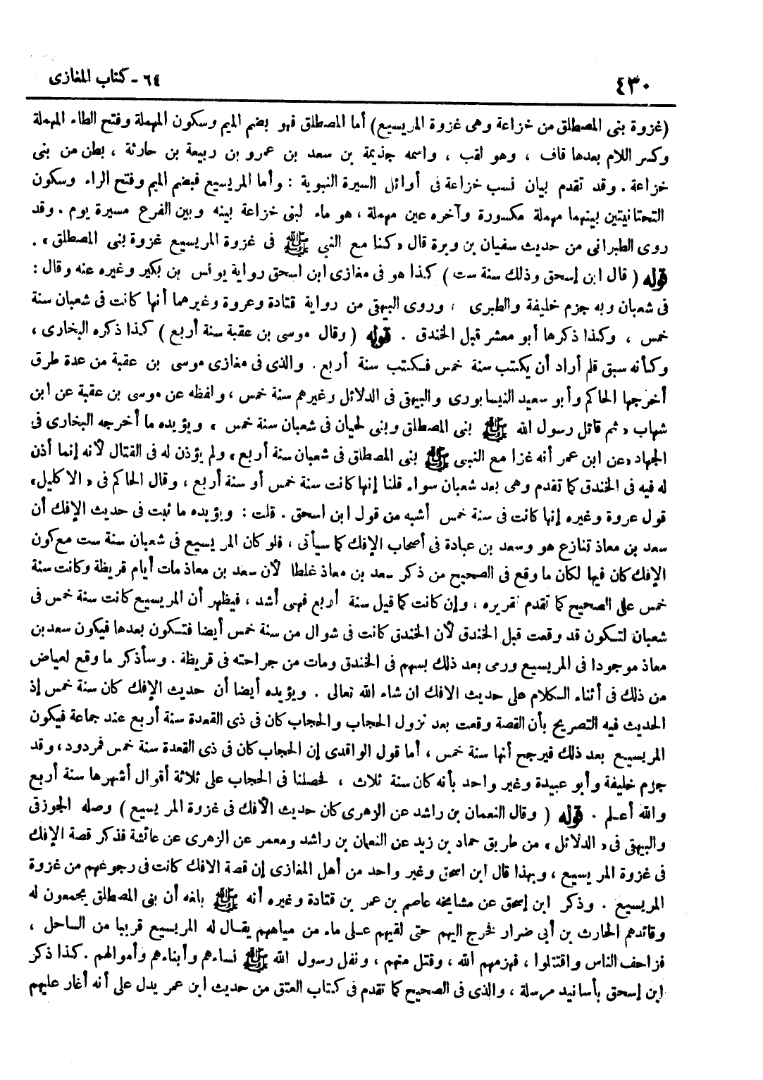غَزْوَة بني المصطلق من خُزَاعَة وَهِي غَزْوَة الْمُرَيْسِيعِ أَمَّا الْمُصْطَلِقُ فَهُوَ بِضَمِّ الْمِيمِ وَسُكُونِ الْمُهْمَلَةِ وَفَتْحِ الطَّاءِ الْمُهْمَلَةِ وَكَسْرِ اللَّامِ بَعْدَهَا قَافٌ وَهُوَ لَقَبٌ وَاسْمُهُ جُذَيْمَةُ بْنُ سَعْدِ بْنِ عَمْرِو بْنِ رَبِيعَةَ بْنِ حَارِثَةَ بَطْنٌ مِنْ بَنِي خُزَاعَةَ وَقَدْ تَقَدَّمَ بَيَانُ نَسَبِ خُزَاعَةَ فِي أَوَائِلِ السِّيرَةِ النَّبَوِيَّةِ وَأَمَّا الْمُرَيْسِيعُ فَبِضَمِّ الْمِيمِ وَفَتْحِ الرَّاءِ وَسُكُونِ التَّحْتَانِيَّتَيْنِ بَيْنَهُمَا مُهْمَلَةٌ مَكْسُورَةٌ وَآخِرُهُ عَيْنٌ مُهْمَلَةٌ هُوَ مَاءٌ لِبَنِي خُزَاعَةَ بَيْنَهُ وَبَيْنَ الْفَرْعِ مَسِيرَةُ يَوْمٍ وَقَدْ رَوَى الطَّبَرَانِيُّ مِنْ حَدِيثِ سُفْيَانَ بْنِ وَبَرَةَ قَالَ كُنَّا مَعَ النَّبِيِّ صَلَّى اللَّهُ عَلَيْهِ وَسَلَّمَ فِي غَزْوَةِ الْمُرَيْسِيعِ غَزْوَةِ بَنِي المصطلق قَوْله قَالَ بن إِسْحَاقَ وَذَلِكَ سَنَةَ سِتٍّ كَذَا هُوَ فِي مغازي بن إِسْحَاقَ رِوَايَةِ يُونُسَ بْنِ بُكَيْرٍ وَغَيْرِهِ عَنْهُ وَقَالَ فِي شَعْبَانَ وَبِهِ جَزَمَ خَلِيفَةٌ وَالطَّبَرِيُّ وَرَوَى الْبَيْهَقِيُّ مِنْ رِوَايَةِ قَتَادَةَ وَعُرْوَةَ وَغَيْرِهِمَا أَنَّهَا كَانَتْ فِي شَعْبَانَ سَنَةَ خَمْسٍ وَكَذَا ذَكَرَهَا أَبُو مَعْشَرٍ قَبْلَ الْخَنْدَقِ قَوْلُهُ وَقَالَ مُوسَى بْنُ عُقْبَةَ سَنَةَ أَرْبَعٍ كَذَا ذَكَرَهُ الْبُخَارِيُّ وَكَأَنَّهُ سَبْقُ قَلَمٍ أَرَادَ أَنْ يَكْتُبَ سَنَةَ خَمْسٍ فَكَتَبَ سَنَةَ أَرْبَعٍ وَالَّذِي فِي مَغَازِي مُوسَى بْنِ عُقْبَةَ مِنْ عِدَّةِ طُرُقٍ أَخْرَجَهَا الْحَاكِمُ وَأَبُو سَعِيدٍ النَّيْسَابُورِيُّ وَالْبَيْهَقِيُّ فِي الدَّلَائِلِ وَغَيْرُهُمْ سَنَةَ خَمْسٍ وَلَفْظُهُ عَنْ مُوسَى بن عقبَة عَن بن شِهَابٍ ثُمَّ قَاتَلَ رَسُولُ اللَّهِ صَلَّى اللَّهُ عَلَيْهِ وَسَلَّمَ بَنِي الْمُصْطَلِقِ وَبَنِي لِحْيَانَ فِي شَعْبَانَ سَنَةَ خَمْسٍ وَيُؤَيِّدُهُ مَا أَخْرَجَهُ الْبُخَارِيُّ فِي الْجِهَاد عَن بن عُمَرَ أَنَّهُ غَزَا مَعَ النَّبِيِّ صَلَّى اللَّهُ عَلَيْهِ وَسَلَّمَ بَنِي الْمُصْطَلِقِ فِي شَعْبَانَ سَنَةَ أَرْبَعٍ وَلَمْ يُؤْذَنْ لَهُ فِي الْقِتَالِ لِأَنَّهُ إِنَّمَا أُذِنَ لَهُ فِيهِ فِي الْخَنْدَقِ كَمَا تَقَدَّمَ وَهِيَ بَعْدَ شَعْبَانَ سَوَاءٌ قُلْنَا إِنَّهَا كَانَتْ سَنَةَ خَمْسٍ أَوْ سَنَةَ أَرْبَعٍ وَقَالَ الْحَاكِمُ فِي الْإِكْلِيلِ قَوْلُ عُرْوَةَ وَغَيْرِهِ إِنَّهَا كَانَتْ فِي سَنَةَ خَمْسٍ أَشْبَهُ مِنْ قَوْلِ بن إِسْحَاقَ قُلْتُ وَيُؤَيِّدُهُ مَا ثَبَتَ فِي حَدِيثِ الْإِفْكِ أَنَّ سَعْدَ بْنَ مُعَاذٍ تَنَازَعَ هُوَ وَسَعْدُ بْنُ عُبَادَةَ فِي أَصْحَابِ الْإِفْكِ كَمَا سَيَأْتِي فَلَوْ كَانَ الْمُرَيْسِيعُ فِي شَعْبَانَ سَنَةَ سِتٍّ مَعَ كَوْنِ الْإِفْكِ كَانَ فِيهَا لَكَانَ مَا وَقَعَ فِي الصَّحِيحِ مِنْ ذِكْرِ سَعْدِ بْنِ مُعَاذٍ غَلَطًا لِأَنَّ سَعْدَ بْنَ مُعَاذٍ مَاتَ أَيَّامَ قُرَيْظَةَ وَكَانَتْ سَنَةَ خَمْسٍ عَلَى الصَّحِيحِ كَمَا تَقَدَّمَ تَقْرِيرُهُ وَإِنْ كَانَتْ كَمَا قِيلَ سَنَةَ أَرْبَعٍ فَهِيَ أَشَدُّ فَيَظْهَرُ أَنَّ الْمُرَيْسِيعَ كَانَتْ سَنَةَ خَمْسٍ فِي شَعْبَانَ لِتَكُونَ قَدْ وَقَعَتْ قَبْلَ الْخَنْدَقِ لِأَنَّ الْخَنْدَقَ كَانَتْ فِي شَوَّالٍ مِنْ سَنَةِ خَمْسٍ أَيْضًا فَتَكُونُ بَعْدَهَا فَيَكُونُ سَعْدُ بْنُ مُعَاذٍ مَوْجُودًا فِي الْمُرَيْسِيعِ وَرُمِيَ بَعْدَ ذَلِكَ بِسَهْمٍ فِي الْخَنْدَقِ وَمَاتَ مِنْ جِرَاحَتِهِ فِي قُرَيْظَةَ وَسَأَذْكُرُ مَا وَقَعَ لَعِيَاضٍ مِنْ ذَلِكَ فِي أَثْنَاءِ الْكَلَامِ عَلَى حَدِيثِ الْإِفْكِ إِنْ شَاءَ اللَّهُ تَعَالَى وَيُؤَيِّ