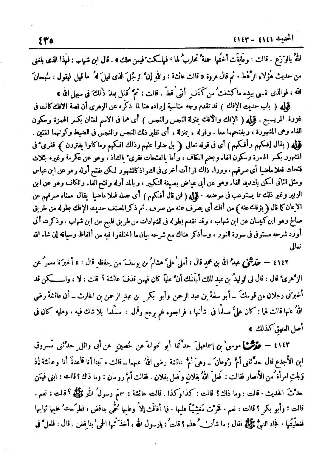 قَدْ تَقَدَّمَ وَجْهُ مُنَاسَبَةِ إِيرَادِهِ هُنَا لِمَا ذَكَرَهُ عَنِ الزُّهْرِيِّ أَنَّ قِصَّةَ الْإِفْكِ كَانَتْ فِي غَزْوَةِ الْمُرَيْسِيعِ قَوْلُهُ الْإِفْكُ وَالْأَفْكُ بِمَنْزِلَةِ النَّجِسِ وَالنَّجَسِ أَيْ هُمَا فِي الِاسْمِ لُغَتَانِ بِكَسْرِ الْهَمْزَةِ وَسُكُونِ الْفَاءِ وَهِيَ الْمَشْهُورَةُ وَبِفَتْحِهِمَا مَعًا وَقَوْلُهُ بِمَنْزِلَةِ أَي نَظِير ذَلِك النَّجس وَالنَّجس فِي الضَّبْطِ وَكَوْنِهِمَا لُغَتَيْنِ قَوْلُهُ يُقَالُ إِفْكُهُمْ وَأَفَكُهُمْ أَيْ فِي قَوْلِهِ تَعَالَى بَلْ ضَلُّوا عَنْهُم وَذَلِكَ إفكهم وَمَا كَانُوا يفترون فَقُرِئَ فِي الْمَشْهُورِ بِكَسْرِ الْهَمْزَةِ وَسُكُونِ الْفَاءِ وَبِضَمِّ الْكَافِ وَأَمَّا بِالْفَتَحَاتِ فَقُرِئَ بِالشَّاذِّ وَهُوَ عَنْ عِكْرِمَةَ وَغَيْرِهِ بِثَلَاثِ فَتَحَاتٍ فِعْلًا مَاضِيًا أَي صرفهم ووراء ذَلِك قراآت أُخْرَى فِي الشَّوَاذِّ كَالْمَشْهُورِ لَكِنْ بِفَتْحِ أَوَّلِهِ وَهُوَ عَن بن عَبَّاسٍ وَمِثْلُ الثَّانِي لَكِنْ بِتَشْدِيدِ الْفَاءِ وَهُوَ عَنْ أَبِي عِيَاضٍ بِصِيغَةِ التَّكْبِيرِ وَبِالْمَدِّ أَوَّلُهُ وَفتح الْفَاء وَالْكَاف وَهُوَ عَن بن الزُّبَيْرِ وَغَيْرُ ذَلِكَ مِمَّا يُسْتَوْعَبُ فِي مَوْضِعِهِ قَوْلُهُ فَمَنْ قَالَ أَفَكَهُمْ أَيْ جَعَلَهُ فِعْلًا مَاضِيًا يُقَالُ مَعْنَاهُ صَرَفَهُمْ عَنِ الْإِيمَانِ كَمَا قَالَ يؤفك عَنهُ من أفك أَيْ يُصْرَفُ عَنْهُ مَنْ صُرِفَ ثُمَّ ذَكَرَ الْمُصَنِّفُ حَدِيثَ الْإِفْكِ بِطُولِهِ مِنْ طَرِيقِ صَالِحٍ وَهُوَ بن كيسَان عَن بن شِهَابٍ وَقَدْ تَقَدَّمَ بِطُولِهِ فِي الشَّهَادَاتِ مِنْ طَرِيق فليح عَن بن شِهَابٍ وَذَكَرْتُ أَنِّي أُورِدُ شَرْحَهُ مُسْتَوْفًى فِي سُورَةِ النُّورِ وَسَأَذْكُرُ هُنَاكَ مَعَ شَرْحِهِ بَيَانَ مَا اخْتلفُوا فِيهِ من أَلْفَاظ وَسِيَاقِهِ إِنْ شَاءَ اللَّهُ تَعَالَى