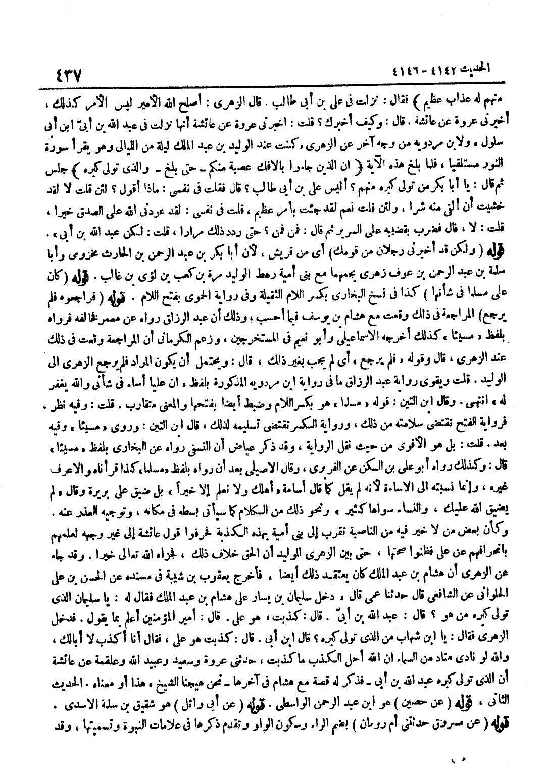 [4142] قَوْلُهُ وَلَكِنْ قَدْ أَخْبَرَنِي رَجُلَانِ مِنْ قَوْمِكَ أَيْ مِنْ قُرَيْشٍ لِأَنَّ أَبَا بَكْرِ بْنَ عَبْدِ الرَّحْمَنِ بْنِ الْحَارِثِ مَخْزُومِيٌّ وَأَبَا سَلَمَةَ بْنَ عَبْدِ الرَّحْمَنِ بْنِ عَوْفٍ زُهْرِيٌّ يَجْمَعُهُمَا مَعَ بَنِي أُمَيَّةَ رَهْطِ الْوَلِيدِ مُرَّةَ بْنِ كَعْبِ بْنِ لُؤَيِّ بْنِ غَالِبِ قَوْلُهُ كَانَ عَلِيٌّ مُسَلِّمًا فِي شَأْنِهَا كَذَا فِي نُسَخِ الْبُخَارِيِّ بِكَسْرِ اللَّامِ الثَّقِيلَةِ وَفِي رِوَايَةِ الْحَمَوِيِّ بِفَتْحِ اللَّامِ قَوْلُهُ فَرَاجَعُوهُ فَلَمْ يَرْجِعِ الْمُرَاجَعَةُ فِي ذَلِكَ وَقَعَتْ مَعَ هِشَامِ بْنِ يُوسُفَ فِيمَا أَحْسَبُ وَذَلِكَ أَنَّ عَبْدَ الرَّزَّاقِ رَوَاهُ عَنْ مَعْمَرٍ فَخَالَفَهُ فَرَوَاهُ بِلَفْظِ مُسِيئًا كَذَلِكَ أَخْرَجَهُ الْإِسْمَاعِيلِيُّ وَأَبُو نُعَيْمٍ فِي الْمُسْتَخْرَجَيْنِ وَزَعَمَ الْكَرْمَانِيُّ أَنَّ الْمُرَاجَعَةَ وَقَعَتْ فِي ذَلِكَ عِنْدَ الزُّهْرِيِّ قَالَ وَقَوْلُهُ فَلَمْ يَرْجِعْ أَيْ لَمْ يُجِبْ بِغَيْرِ ذَلِكَ قَالَ وَيُحْتَمَلُ أَنْ يَكُونَ الْمُرَادُ فَلَمْ يَرْجِعِ الزُّهْرِيُّ إِلَى الْوَلِيدِ قُلْتُ وَيُقَوِّي رِوَايَةَ عَبْدِ الرَّزَّاق مَا فِي رِوَايَة بن مَرْدَوَيْهِ الْمَذْكُورَةِ بِلَفْظِ أَنَّ عَلِيًّا أَسَاءَ فِي شأني وَالله يغْفر لَهُ انْتهى وَقَالَ بن التِّينِ قَوْلُهُ مُسَلِّمًا هُوَ بِكَسْرِ اللَّامِ وَضُبِطَ أَيْضًا بِفَتْحِهَا وَالْمَعْنَى مُتَقَارِبٌ قُلْتُ وَفِيهِ نَظَرٌ فَرِوَايَةُ الْفَتْحِ تَقْتَضِي سَلَامَتَهُ مِنْ ذَلِكَ وَرِوَايَةُ الْكسر تَقْتَضِي تَسْلِيمه لذَلِك قَالَ بن التِّينِ وَرُوِيَ مُسِيئًا وَفِيهِ بُعْدٌ قُلْتُ بَلْ هُوَ الْأَقْوَى مِنْ حَيْثُ نَقْلِ الرِّوَايَةِ وَقَدْ ذَكَرَ عِيَاضٌ أَنَّ النَّسَفِيَّ رَوَاهُ عَنِ الْبُخَارِيِّ بِلَفْظِ مُسِيئًا قَالَ وَكَذَلِكَ رَوَاهُ أَبُو عَلِيِّ بْنِ السَّكَنِ عَنِ الْفَرْبَرِيِّ وَقَالَ الْأَصِيلِيُّ بَعْدَ أَنْ رَوَاهُ بِلَفْظِ مُسَلِّمًا كَذَا قَرَأْنَاهُ وَالْأَعْرَفُ غَيْرُهُ وَإِنَّمَا نَسَبَتْهُ إِلَى الْإِسَاءَةِ لِأَنَّهُ لَمْ يَقُلْ كَمَا قَالَ أُسَامَةُ أَهْلُكَ وَلَا نَعْلَمُ إِلَّا خَيْرًا بَلْ ضَيَّقَ عَلَى بَرِيرَةَ وَقَالَ لَمْ يُضَيِّقِ اللَّهُ عَلَيْكَ وَالنِّسَاءُ سِوَاهَا كَثِيرٌ وَنَحْوَ ذَلِكَ مِنَ الْكَلَامِ كَمَا سَيَأْتِي بَسْطُهُ فِي مَكَانِهِ وَتَوْجِيهُ الْعُذْرِ عَنْهُ وَكَأَنَّ بَعْضَ مَنْ لَا خَيْرَ فِيهِ مِنَ النَّاصِبَةِ تَقَرَّبَ إِلَى بَنِي أُمَيَّةَ بِهَذِهِ الْكِذْبَةِ فَحَرَّفُوا قَوْلَ عَائِشَةَ إِلَى غَيْرِ وَجْهِهِ لِعِلْمِهِمْ بِانْحِرَافِهِمْ عَنْ عَلِيٍّ فَظَنُّوا صِحَّتَهَا حَتَّى بَيَّنَ الزُّهْرِيُّ لِلْوَلِيدِ أَنَّ الْحَقَّ خِلَافُ ذَلِكَ فَجَزَاهُ اللَّهُ تَعَالَى خَيْرًا وَقَدْ جَاءَ عَنِ الزُّهْرِيِّ أَنَّ هِشَامَ بْنَ عَبْدِ الْمَلِكِ كَانَ يَعْتَقِدُ ذَلِكَ أَيْضًا فَأَخْرَجَ يَعْقُوبُ بْنُ شَيْبَةَ فِي مُسْنَدِهِ عَنِ الْحَسَنِ بْنِ عَلِيٍّ الْحَلْوَانِيِّ عَنِ الشَّافِعِيِّ قَالَ حَدثنَا عَمِّي قَالَ دَخَلَ سُلَيْمَانُ بْنُ يَسَارٍ عَلَى هِشَامِ بْنِ عَبْدِ الْمَلِكِ فَقَالَ لَهُ يَا سُلَيْمَانُ الَّذِي تَوَلَّى كِبْرَهُ مَنْ هُوَ قَالَ عَبْدُ اللَّهِ بْنُ أُبَيٍّ قَالَ كَذَبْتَ هُوَ عَلِيٌّ قَالَ أَمِيرُ الْمُؤْمِنِينَ أَعْلَمُ بِمَا يَقُولُ فَدخل الزُّهْرِيّ فَقَالَ يَا بن شهَاب من الَّذِي تولى كبره قَالَ بن أُبَيٍّ قَالَ كَذَبْتَ هُوَ عَلِيٌّ فَقَالَ أَنَا أكذب لَا أبالك وَاللَّهِ لَوْ نَادَى مُنَادٍ مِنَ السَّمَاءِ أَنَّ اللَّهَ أَحَلَّ الْكَذِبَ مَا كَذَبْتُ حَدَّثَنِي عُرْوَةُ وَسَعِيدٌ وَعُبَيْدُ اللَّهِ 