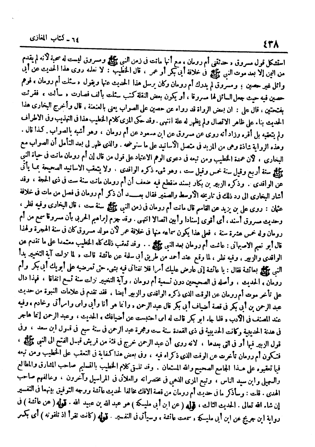 اسْتَشْكَلَ قَوْلُ مَسْرُوقٍ حَدَّثَتْنِي أُمُّ رُومَانَ مَعَ أَنَّهَا مَاتَتْ فِي زَمَنِ النَّبِيِّ صَلَّى اللَّهُ عَلَيْهِ وَسَلَّمَ وَمَسْرُوقٌ لَيْسَتْ لَهُ صُحْبَةٌ لِأَنَّهُ لَمْ يَقْدَمْ مِنَ الْيَمَنِ إِلَّا بَعْدَ مَوْتِ النَّبِيِّ صَلَّى اللَّهُ عَلَيْهِ وَسَلَّمَ فِي خِلَافَةِ أَبِي بَكْرٍ أَوْ عُمَرَ قَالَ الْخَطِيبُ لَا نَعْلَمُهُ رَوَى هَذَا الْحَدِيثَ عَنْ أَبِي وَائِلٍ غَيْرَ حُصَيْنٍ وَمَسْرُوقٌ لَمْ يُدْرِكْ أُمَّ رُومَانَ وَكَانَ يُرْسِلُ هَذَا الْحَدِيثَ عَنْهَا وَيَقُولُ سُئِلَتْ أُمُّ رُومَانَ فَوَهَمَ حُصَيْنٌ فِيهِ حَيْثُ جَعَلَ السَّائِلَ لَهَا مَسْرُوقًا أَوْ يَكُونُ بَعْضُ النَّقَلَةِ كَتَبَ سُئِلَتْ بِأَلِفٍ فَصَارَتْ سَأَلْتُ فَقُرِئَتْ بِفَتْحَتَيْنِ قَالَ عَلِيٌّ إِنَّ بَعْضَ الرُّوَاةِ قَدْ رَوَاهُ عَن حُصَيْن على الصَّوَاب يَعْنِي بالعنعنة قَالَ وَأَخْرَجَ الْبُخَارِيُّ هَذَا الْحَدِيثَ بِنَاءً عَلَى ظَاهِرِ الِاتِّصَالِ وَلَمْ يَظْهَرْ لَهُ عِلَّةٌ انْتَهَى وَقَدْ حَكَى الْمِزِّيُّ كَلَامَ الْخَطِيبِ هَذَا فِي التَّهْذِيبِ وَفِي الْأَطْرَافِ وَلَمْ يَتَعَقَّبْهُ بَلْ أَقَرَّهُ وَزَاد أَنه روى عَن مَسْرُوق عَن بن مَسْعُودٍ عَنْ أُمِّ رُومَانَ وَهُوَ أَشْبَهُ بِالصَّوَابِ كَذَا قَالَ وَهَذِهِ الرِّوَايَةُ شَاذَّةٌ وَهِيَ مِنَ الْمَزِيدِ فِي مُتَّصِلِ الْأَسَانِيدِ عَلَى مَا سَنُوَضِّحُهُ وَالَّذِي ظَهَرَ لِي بَعْدَ التَّأَمُّلِ أَنَّ الصَّوَابَ مَعَ الْبُخَارِيِّ لِأَنَّ عُمْدَةَ الْخَطِيبِ وَمَنْ تَبِعَهُ فِي دَعْوَى الْوَهَمِ الِاعْتِمَادُ عَلَى قَوْلِ مَنْ قَالَ إِنَّ أُمَّ رُومَانَ مَاتَتْ فِي حَيَاةِ النَّبِيِّ صَلَّى اللَّهُ عَلَيْهِ وَسَلَّمَ سَنَةَ أَرْبَعٍ وَقيل سنة خمس وَقيل سِتّ وَهُوَ شَيْء ذكره الْوَاقِدِيّ وَلَا يتعقب الْأَسَانِيدُ الصَّحِيحَةُ بِمَا يَأْتِي عَنِ الْوَاقِدِيِّ وَذَكَرَهُ الزُّبَيْرُ بْنُ بَكَّارٍ بِسَنَدٍ مُنْقَطِعٍ فِيهِ ضَعْفٌ أَنَّ أُمَّ رُومَانَ مَاتَتْ سَنَةَ سِتٍّ فِي ذِي الْحَجَّةِ وَقَدْ أَشَارَ الْبُخَارِيُّ إِلَى رَدِّ ذَلِكَ فِي تَارِيخِهِ الْأَوْسَطِ وَالصَّغِيرِ فَقَالَ بَعْدَ أَنْ ذَكَرَ أُمَّ رُومَانَ فِي فَصْلِ مَنْ مَاتَ فِي خِلَافَةِ عُثْمَانَ رَوَى عَلِيُّ بْنُ يَزِيدَ عَنِ الْقَاسِمِ قَالَ مَاتَتْ أُمُّ رُومَانَ فِي زَمَنِ النَّبِيِّ صَلَّى اللَّهُ عَلَيْهِ وَسَلَّمَ سَنَةَ سِتٍّ قَالَ الْبُخَارِيُّ وَفِيهِ نَظَرٌ وَحَدِيثُ مَسْرُوقٍ أَسْنَدُ أَيْ أَقْوَى إِسْنَادًا وَأَبْيَنُ اتِّصَالًا انْتَهَى وَقَدْ جَزَمَ إِبْرَاهِيمُ الْحَرْبِيُّ بِأَنَّ مَسْرُوقًا سَمِعَ مِنْ أُمِّ رُومَانَ وَلَهُ خَمْسَ عَشْرَةَ سَنَةً فَعَلَى هَذَا يَكُونُ سَمَاعُهُ مِنْهَا فِي خِلَافَةِ عُمَرَ لِأَنَّ مَوْلِدَ مَسْرُوقٍ كَانَ فِي سَنَةِ الْهِجْرَةِ وَلِهَذَا قَالَ أَبُو نُعَيْمٍ الْأَصْبِهَانِيُّ عَاشَتْ أُمُّ رُومَانَ بَعْدَ النَّبِيِّ صَلَّى اللَّهُ عَلَيْهِ وَسَلَّمَ وَقَدْ تَعَقَّبَ ذَلِكَ كُلَّهُ الْخَطِيبُ مُعْتَمِدًا عَلَى مَا تَقَدَّمَ عَنِ الْوَاقِدِيِّ وَالزُّبَيْرِ وَفِيهِ نَظَرٌ لِمَا وَقَعَ عِنْدَ أَحْمَدَ مِنْ طَرِيقِ أَبِي سَلَمَةَ عَنْ عَائِشَةَ قَالَتْ لَمَّا نزلت آيةالتخيير بَدَأَ النَّبِيُّ صَلَّى اللَّهُ عَلَيْهِ وَسَلَّمَ بِعَائِشَةَ فَقَالَ يَا عَائِشَةُ إِنِّي عَارِضٌ عَلَيْكِ أَمْرًا فَلَا تَفْتَاتِي فِيهِ بِشَيْءٍ حَتَّى تَعْرِضِيهِ عَلَى أَبَوَيْكِ أَبِي بَكْرٍ وَأُمِّ رُومَانَ الْحَدِيثَ وَأَصْلُهُ فِي الصَّحِيحَيْنِ دُونَ تَسْمِيَةِ أُمِّ رُومَانَ وَآيَةُ التَّخْيِيرِ نَزَلَتْ سَنَةَ تِسْعٍ اتِّفَاقًا فَهَذَا دَالٌّ على تَأَخّر مَوْتِ أُمِّ رُومَانَ عَنِ 