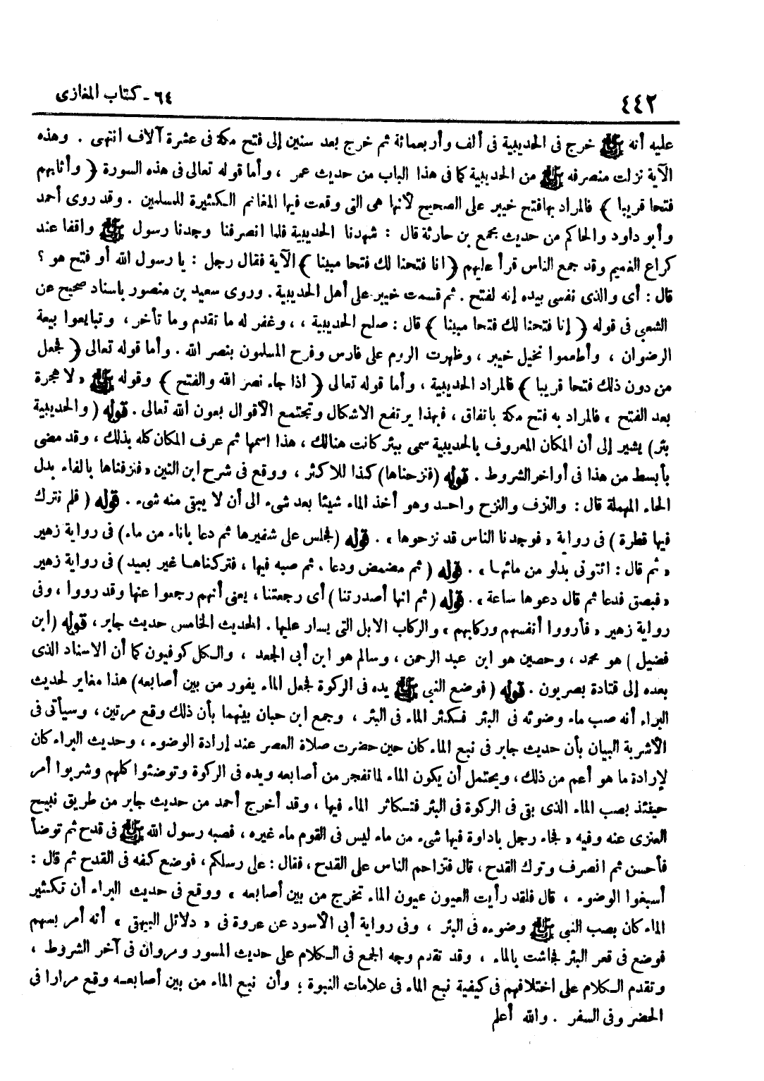 عَلَيْهِ أَنَّهُ صَلَّى اللَّهُ عَلَيْهِ وَسَلَّمَ خَرَجَ فِي الْحُدَيْبِيَةِ فِي أَلْفٍ وَأَرْبَعِمِائَةٍ ثُمَّ خَرَجَ بعد سِنِين إِلَى فَتْحِ مَكَّةَ فِي عَشَرَةِ آلَافٍ انْتَهَى وَهَذِهِ الْآيَةُ نَزَلَتْ مُنْصَرَفِهِ صَلَّى اللَّهُ عَلَيْهِ وَسَلَّمَ مِنَ الْحُدَيْبِيَةِ كَمَا فِي هَذَا الْبَابِ مِنْ حَدِيثِ عُمَرَ وَأَمَّا قَوْلُهُ تَعَالَى فِي هَذِه السُّورَة وأثابهم فتحا قَرِيبا فَالْمُرَاد بهَا فَتْحُ خَيْبَرَ عَلَى الصَّحِيحِ لِأَنَّهَا هِيَ الَّتِي وَقَعَتْ فِيهَا الْمَغَانِمُ الْكَثِيرَةُ لِلْمُسْلِمِينَ وَقَدْ رَوَى أَحْمَدُ وَأَبُو دَاوُدَ وَالْحَاكِمُ مِنْ حَدِيثِ مُجَمِّعُ بْنُ حَارِثَةَ قَالَ شَهِدْنَا الْحُدَيْبِيَةَ فَلَمَّا انْصَرَفْنَا وَجَدْنَا رَسُولَ اللَّهِ صَلَّى اللَّهُ عَلَيْهِ وَسَلَّمَ وَاقِفًا عِنْدَ كُرَاعِ الْغَمِيمِ وَقَدْ جَمَعَ النَّاسَ قَرَأَ عَلَيْهِم إِنَّا فتحنا لَك فتحا مُبينًا الْآيَة فَقَالَ رجل يَا رَسُول الله أَو فتح هُوَ قَالَ أَيْ وَالَّذِي نَفْسِي بِيَدِهِ إِنَّهُ لَفَتْحٌ ثُمَّ قُسِمَتْ خَيْبَرُ عَلَى أَهْلِ الْحُدَيْبِيَةِ وَرَوَى سَعِيدُ بْنُ مَنْصُورٍ بِإِسْنَادٍ صَحِيحٍ عَنْ الشَّعْبِيِّ فِي قَوْلِهِ إِنَّا فَتَحْنَا لَكَ فَتْحًا مُبينًا قَالَ صُلْحُ الْحُدَيْبِيَةِ وَغَفَرَ لَهُ مَا تَقَدَّمَ وَمَا تَأَخَّرَ وَتَبَايَعُوا بَيْعَةَ الرِّضْوَانِ وَأُطْعِمُوا نَخِيلَ خَيْبَرَ وَظَهَرَتِ الرُّومُ عَلَى فَارِسٍ وَفَرِحَ الْمُسْلِمُونَ بِنَصْرِ اللَّهِ وَأَمَّا قَوْلُهُ تَعَالَى فَجَعَلَ مِنْ دون ذَلِك فتحا قَرِيبا فَالْمُرَادُ الْحُدَيْبِيَةُ وَأَمَّا قَوْلُهُ تَعَالَى إِذَا جَاءَ نصر الله وَالْفَتْح وَقَوْلُهُ صَلَّى اللَّهُ عَلَيْهِ وَسَلَّمَ لَا هِجْرَةَ بَعْدَ الْفَتْحِ فَالْمُرَادُ بِهِ فَتْحُ مَكَّةَ بِاتِّفَاقٍ فَبِهَذَا يرْتَفع الْإِشْكَالُ وَتَجْتَمِعُ الْأَقْوَالُ بِعَوْنِ اللَّهِ تَعَالَى قَوْلُهُ وَالْحُدَيْبِيَةُ بِئْرٌ يُشِيرُ إِلَى أَنَّ الْمَكَانَ الْمَعْرُوفَ بِالْحُدَيْبِيَةِ سُمِّيَ بِبِئْرٍ كَانَتْ هُنَالِكَ هَذَا اسْمُهَا ثُمَّ عُرِفَ الْمَكَانُ كُلُّهُ بِذَلِكَ وَقَدْ مَضَى بِأَبْسَطَ مِنْ هَذَا فِي أَوَاخِرِ الشُّرُوطِ قَوْلُهُ فنزحناها كَذَا للْأَكْثَر وَوَقع فِي شرح بن التِّينِ فَنَزَفْنَاهَا بِالْفَاءِ بَدَلَ الْحَاءِ الْمُهْمَلَةِ قَالَ وَالنَّزْفُ وَالنَّزْحُ وَاحِدٌ وَهُوَ أَخْذُ الْمَاءِ شَيْئًا بَعْدَ شَيْءٍ إِلَى أَنْ لَا يَبْقَى مِنْهُ شَيْءٌ قَوْلُهُ فَلَمْ نَتْرُكْ فِيهَا قَطْرَةً فِي رِوَايَةٍ فَوَجَدْنَا النَّاسَ قَدْ نَزَحُوهَا قَوْلُهُ فَجَلَسَ عَلَى شَفِيرِهَا ثُمَّ دَعَا بِإِنَاءٍ مِنْ مَاءٍ فِي رِوَايَةِ زُهَيْرٍ ثُمَّ قَالَ ائْتُونِي بِدَلْوٍ مِنْ مَائِهَا قَوْلُهُ ثُمَّ مَضْمَضَ وَدَعَا ثُمَّ صَبَّهُ فِيهَا فَتَرَكْنَاهَا غَيْرَ بِعِيدٍ فِي رِوَايَةِ زُهَيْرٍ فَبَصَقَ فَدَعَا ثُمَّ قَالَ دَعُوهَا سَاعَةً قَوْلُهُ ثُمَّ إِنَّهَا أَصَدَرَتْنَا أَيْ رَجَعَتْنَا يَعْنِي أَنَّهُمْ رَجَعُوا عَنْهَا وَقَدْ رَوُوا وَفِي رِوَايَةِ زُهَيْرٍ فَأَرْوَوْا أَنْفُسَهُمْ وَرِكَابَهُمْ وَالرِّكَابُ الْإِبِلُ الَّتِي يسَار عَلَيْهَا الحَدِيث الْخَامِس حَدِيث جَابر