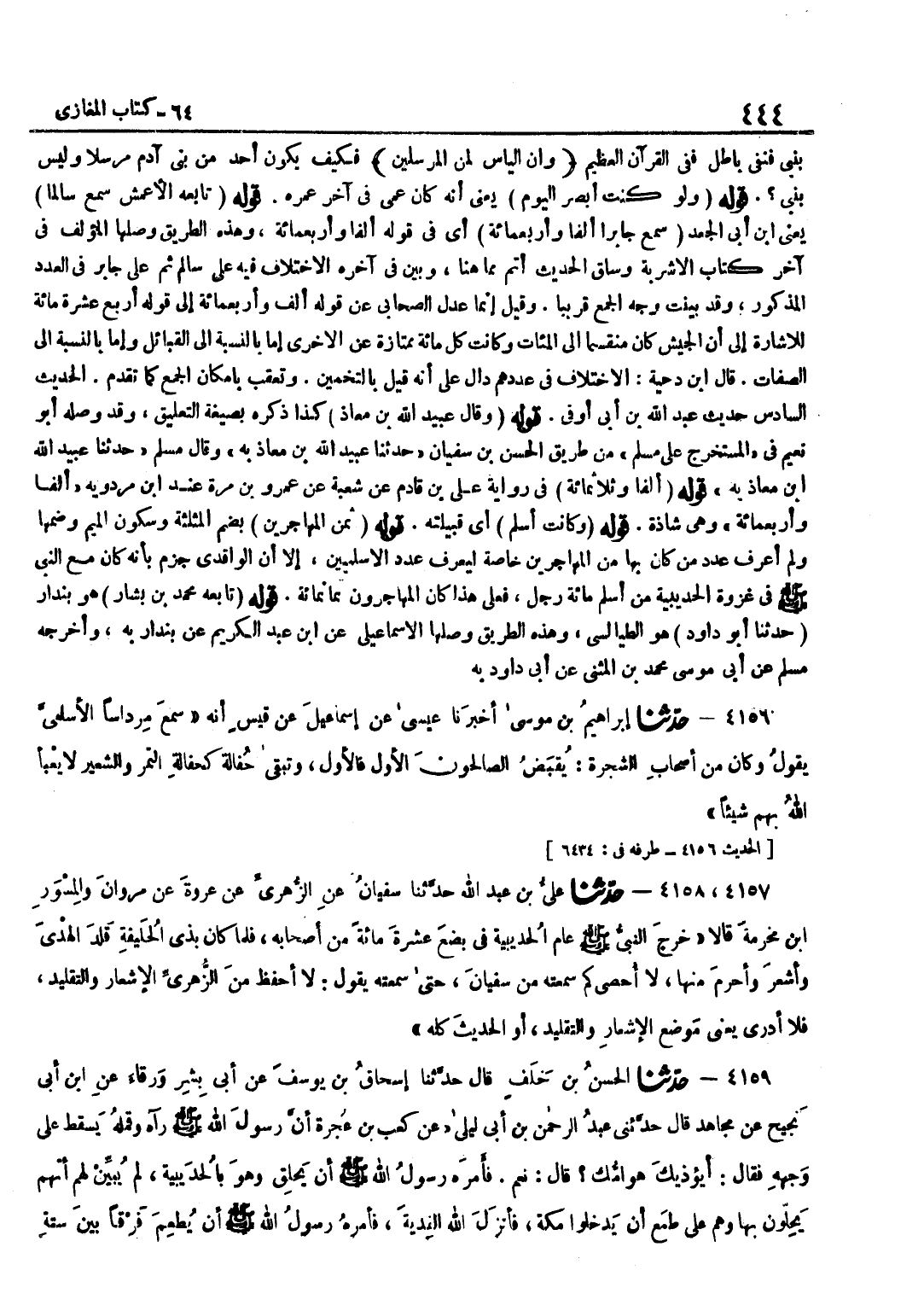 بِنَبِيٍّ فَنَفْيٌ بَاطِلٌ فَفِي الْقُرْآنِ الْعَظِيمِ وَإِنَّ الياس لمن الْمُرْسلين فَكَيْفَ يَكُونُ أَحَدٌ مِنْ بَنِي آدَمَ مُرْسَلًا وَلَيْسَ بِنَبِيٍّ قَوْلُهُ وَلَوْ كُنْتُ أُبْصِرُ الْيَوْمَ يَعْنِي أَنَّهُ كَانَ عَمِيَ فِي آخِرِ عُمْرِهِ قَوْله تَابعه الْأَعْمَش سمع سالما يَعْنِي بن أَبِي الْجَعْدِ سَمِعَ جَابِرًا أَلْفًا وَأَرْبَعَمِائَةٍ أَيْ فِي قَوْلِهِ أَلْفًا وَأَرْبَعَمِائَةٍ وَهَذِهِ الطَّرِيقُ وَصَلَهَا الْمُؤَلِّفُ فِي آخِرِ كِتَابِ الْأَشْرِبَةِ وَسَاقَ الْحَدِيثَ أَتَمَّ مِمَّا هُنَا وَبَيَّنَ فِي آخِرِهِ الِاخْتِلَافَ فِيهِ عَلَى سَالِمٍ ثُمَّ عَلَى جَابِرٍ فِي الْعَدَدِ الْمَذْكُورِ وَقَدْ بَيَّنْتُ وَجْهَ الْجَمْعِ قَرِيبًا وَقِيلَ إِنَّمَا عَدَلَ الصَّحَابِيُّ عَنْ قَوْلِهِ أَلْفٌ وَأَرْبَعُمِائَةٍ إِلَى قَوْلِهِ أَرْبَعَ عَشْرَةَ مِائَةٍ لِلْإِشَارَةِ إِلَى أَنَّ الْجَيْشَ كَانَ مُنْقَسِمًا إِلَى الْمِئَاتِ وَكَانَتْ كُلُّ مِائَةٍ مُمْتَازَةً عَنِ الْأُخْرَى إِمَّا بِالنِّسْبَةِ إِلَى الْقَبَائِلِ وَإِمَّا بِالنِّسْبَةِ إِلَى الصِّفَاتِ قَالَ بن دِحْيَةَ الِاخْتِلَافُ فِي عَدَدِهِمْ دَالٌّ عَلَى أَنَّهُ قِيلَ بِالتَّخْمِينِ وَتُعُقِّبَ بِإِمْكَانِ الْجَمْعِ كَمَا تَقَدَّمَ الْحَدِيثُ السَّادِسُ حَدِيثُ عَبْدِ اللَّهِ بْنِ أَبِي أَوْفَى