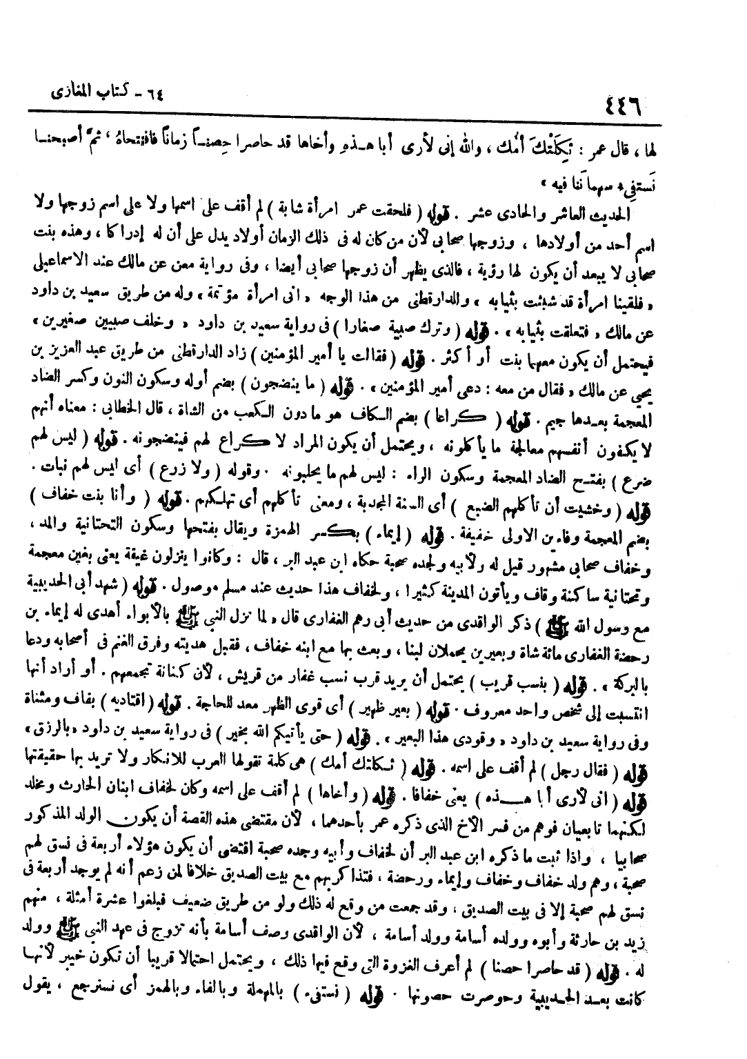 [4160] قَوْلُهُ فَلَحِقَتْ عُمَرَ امْرَأَةٌ شَابَّةٌ لَمْ أَقِفْ عَلَى اسْمِهَا وَلَا عَلَى اسْمِ زَوْجِهَا وَلَا اسْمِ أَحَدٍ مِنْ أَوْلَادِهَا وَزَوْجُهَا صَحَابِيٌّ لِأَنَّ مَنْ كَانَ لَهُ فِي ذَلِكَ الزَّمَانِ أَوْلَاد يدل على أَن لَهُ إدراكا وَهَذِهِ بِنْتُ صَحَابِيٍّ لَا يَبْعُدُ أَنْ يَكُونَ لَهَا رُؤْيَةٌ فَالَّذِي يَظْهَرُ أَنَّ زَوْجَهَا صَحَابِيٌّ أَيْضًا وَفِي رِوَايَةِ مَعْنٍ عَنْ مَالِكٍ عِنْدَ الْإِسْمَاعِيلِيِّ فَلَقِينَا امْرَأَةً قَدْ شَبِثَتْ بِثِيَابِهِ وَللدَّارَقُطْنِيِّ مِنْ هَذَا الْوَجْهِ إِنِّي امْرَأَةٌ مُؤْتَمَةٌ وَلَهُ مِنْ طَرِيقِ سَعِيدِ بْنِ دَاوُدَ عَنْ مَالِكٍ فَتَعَلَّقَتْ بِثِيَابِهِ قَوْلُهُ وَتَرَكَ صِبْيَةً صِغَارًا فِي رِوَايَةِ سَعِيدِ بْنِ دَاوُدَ وَخَلَفَ صَبِيَّيْنِ صَغِيرَيْنِ فَيُحْتَمَلُ أَنْ يَكُونَ مَعَهُمَا بِنْتٌ أَوْ أَكْثَرُ قَوْلُهُ فَقَالَتْ يَا أَمِيرَ الْمُؤْمِنِينَ زَادَ الدَّارَقُطْنِيُّ مِنْ طَرِيقِ عَبْدِ الْعَزِيزِ بْنِ يَحْيَى عَنْ مَالِكٍ فَقَالَ مَنْ مَعَهُ دَعِي أَمِيرَ الْمُؤْمِنِينَ قَوْلُهُ مَا يُنْضِجُونَ بِضَمِّ أَوَّلِهِ وَسُكُونِ النُّونِ وَكَسْرِ الضَّادِ الْمُعْجَمَةِ بَعْدَهَا جِيمٌ قَوْلُهُ كُرَاعًا بِضَمِّ الْكَافِ هُوَ مَا دُونَ الْكَعْبِ مِنَ الشَّاةِ قَالَ الْخَطَّابِيُّ مَعْنَاهُ أَنَّهُمْ لَا يَكْفُونَ أَنْفُسَهُمْ مُعَالَجَةَ مَا يَأْكُلُونَهُ وَيُحْتَمَلُ أَنْ يَكُونَ الْمُرَادُ لَا كُرَاعَ لَهُمْ فَيُنْضِجُونَهُ قَوْلُهُ لَيْسَ لَهُمْ ضَرْعٌ بِفَتْحِ الضَّادِ الْمُعْجَمَةِ وَسُكُونِ الرَّاءِ لَيْسَ لَهُمْ مَا يَحْلِبُونَهُ وَقَوْلُهُ وَلَا زَرْعَ أَيْ لَيْسَ لَهُمْ نَبَاتٌ قَوْلُهُ وَخَشِيتُ أَنْ تَأْكُلَهُمُ الضِّبَعُ أَيِ السَّنَةُ الْمُجْدِبَةُ وَمَعْنَى تَأْكُلُهُمْ أَيْ تُهْلِكُهُمْ قَوْلُهُ وَأَنَا بِنْتُ خِفَافٍ بِضَمِّ الْمُعْجَمَةِ وَفَاءَيْنِ الْأُولَى خَفِيفَةٌ قَوْلُهُ إِيمَاءً بِكَسْرِ الْهَمْزَةِ وَيُقَالُ بِفَتْحِهَا وَسُكُونِ التَّحْتَانِيَّةِ وَالْمَدِّ وَخِفَافٌ صَحَابِيٌّ مَشْهُورٌ قِيلَ لَهُ وَلِأَبِيهِ وَلِجَدِّهِ صُحْبَةٌ حَكَاهُ بن عَبْدِ الْبَرِّ قَالَ وَكَانُوا يَنْزِلُونَ غَيْقَةً يَعْنِي بِغَيْنٍ مُعْجَمَةٍ وَتَحْتَانِيَّةٍ سَاكِنَةٍ وَقَافٍ وَيَأْتُونَ الْمَدِينَةَ كَثِيرًا وَلِخِفَافٍ هَذَا حَدِيثٌ عِنْدَ مُسْلِمٍ مَوْصُولٌ قَوْلُهُ شَهِدَ أَبِي الْحُدَيْبِيَةَ مَعَ رَسُولِ اللَّهِ صَلَّى اللَّهُ عَلَيْهِ وَسَلَّمَ ذَكَرَ الْوَاقِدِيُّ مِنْ حَدِيثِ أَبِي رُهْمٍ الْغِفَارِيِّ قَالَ لَمَّا نَزَلَ النَّبِيُّ صَلَّى اللَّهُ عَلَيْهِ وَسَلَّمَ بِالْأَبْوَاءِ أَهْدَى لَهُ إِيمَاءُ بْنُ رَحْضَةَ الْغِفَارِيُّ مِائَةَ شَاةٍ وَبَعِيرَيْنِ يَحْمِلَانِ لَبَنًا وَبَعَثَ بِهَا مَعَ ابْنِهِ خِفَافٍ فَقِبَلَ هَدِيَّتَهُ وَفَرَّقَ الْغَنَمَ فِي أَصْحَابِهِ وَدَعَا بِالْبَرَكَةِ قَوْلُهُ بِنَسَبٍ قَرِيبٍ يُحْتَمَلُ أَنْ يُرِيدَ قُرْبَ نَسَبِ غِفَارٍ مِنْ قُرَيْشٍ لِأَنَّ كِنَانَةَ تَجْمَعُهُمْ أَوْ أَرَادَ أَنَّهَا انْتَسَبَتْ إِلَى شَخْصٍ وَاحِدٍ مَعْرُوفٍ قَوْلُهُ بَعِيرٍ ظَهِيرٍ أَيْ قَوِيِّ الظَّهْرِ مُعَدٍّ لِلْحَاجَةِ قَوْلُهُ اقْتَادِيهِ بِقَافٍ وَمُثَنَّاةٍ وَفِي رِوَايَةِ سَعِيدِ بْنِ دَاوُدَ وُقُودِي هَذَا الْبَعِيرَ قَوْلُهُ حَتَّى يَأْتِيَكُمُ اللَّهُ بِخَيْرٍ فِي رِوَايَةِ سَعِيدِ بْنِ دَاوُدَ بِالرِّزْقِ قَوْلُهُ فَقَالَ رَجُلٌ لَمْ أَقِفْ عَلَى اسْمِهِ قَوْلُهُ ثَكِلَتْكَ أُمُّكَ هِيَ كَلِمَةٌ تَقُولُهَا الْعَرَبُ لِلْإِنْكَارِ وَلَا تُرِيدُ بِهَا حَقِيقَتَهَا قَوْلُهُ إِنِّي لَأَرَى أَبَا هَذِهِ يَعْنِي خِفَافًا قَوْل