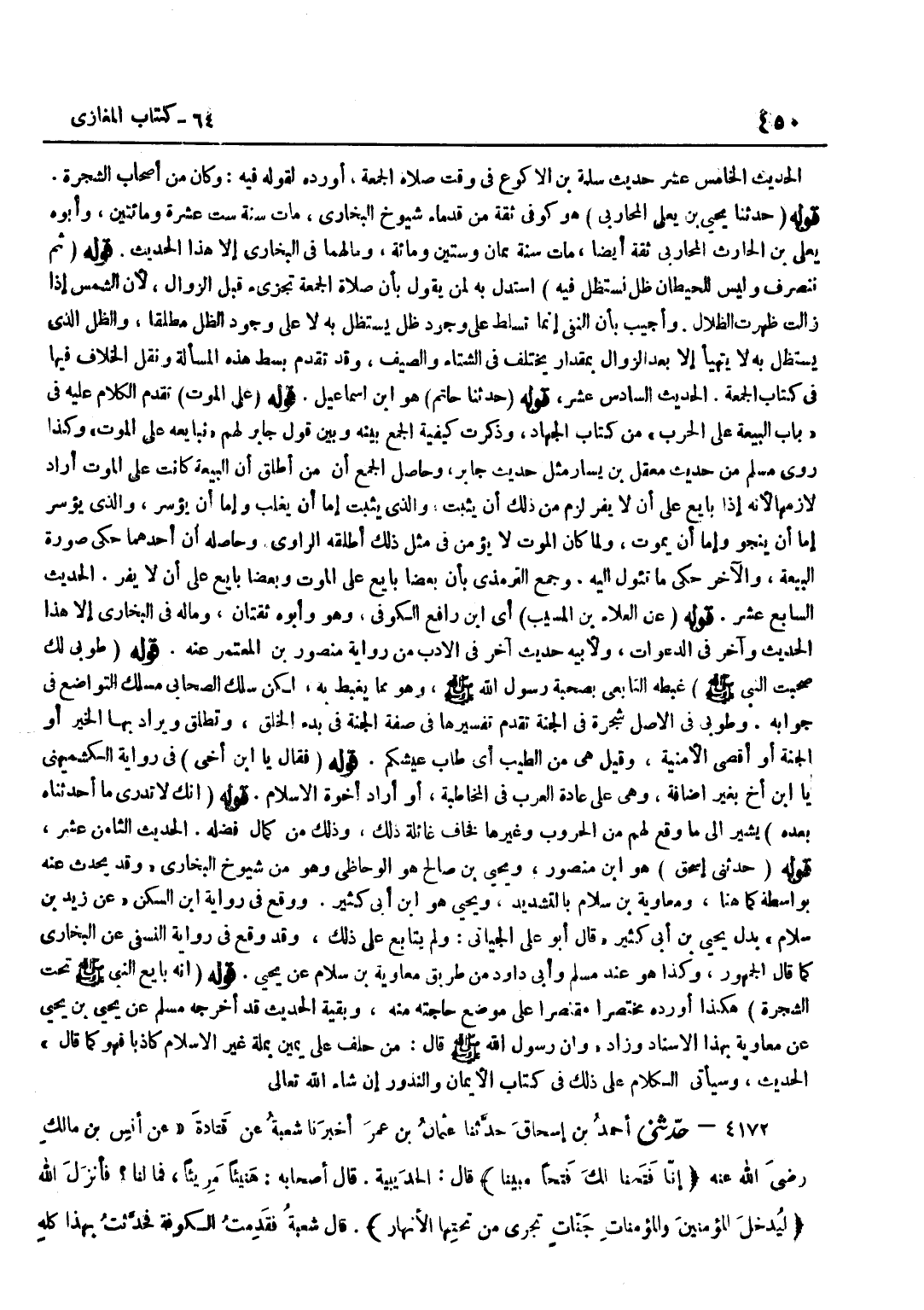 [4168] الْحَدِيثُ الْخَامِسَ عَشَرَ حَدِيثُ سَلَمَةَ بْنِ الْأَكْوَعِ فِي وَقْتِ صَلَاةِ الْجُمُعَةِ أَوْرَدَهُ لِقَوْلِهِ فِيهِ وَكَانَ مِنْ أَصْحَابِ الشَّجَرَةِ قَوْلُهُ حَدَّثَنَا يَحْيَى بْنُ يَعْلَى الْمَحَارِبِيُّ هُوَ كُوفِيٌّ ثِقَةٌ مِنْ قُدَمَاءِ شُيُوخِ الْبُخَارِيِّ مَاتَ سَنَةَ سِتَّ عَشْرَةَ وَمِائَتَيْنِ وَأَبُوهُ يَعْلَى بْنُ الْحَارِثِ الْمَحَارِبِيُّ ثِقَةٌ أَيْضًا مَاتَ سَنَةَ ثَمَانٍ وَسِتِّينَ وَمِائَةٍ وَمَا لَهُمَا فِي الْبُخَارِيِّ إِلَّا هَذَا الْحَدِيثُ قَوْلُهُ ثُمَّ نَنْصَرِفُ وَلَيْسَ لِلْحِيطَانِ ظِلٌّ نَسْتَظِلُّ فِيهِ اسْتُدِلَّ بِهِ لِمَنْ يَقُولُ بِأَنَّ صَلَاةَ الْجُمُعَةِ تُجْزِئُ قَبْلَ الزَّوَالِ لِأَنَّ الشَّمْسَ إِذَا زَالَتْ ظَهَرَتِ الظِّلَالُ وَأُجِيبَ بِأَنَّ النَّفْيَ إِنَّمَا تَسَلَّطَ عَلَى وُجُودِ ظِلٍّ يُسْتَظَلُّ بِهِ لَا عَلَى وُجُودِ الظِّلِّ مُطْلَقًا وَالظِّلُّ الَّذِي يُسْتَظَلُّ بِهِ لَا يَتَهَيَّأُ إِلَّا بَعْدَ الزَّوَالِ بِمِقْدَارٍ يَخْتَلِفُ فِي الشِّتَاءِ وَالصَّيْفِ وَقَدْ تَقَدَّمَ بَسْطُ هَذِهِ الْمَسْأَلَةِ وَنَقْلُ الْخِلَافِ فِيهَا فِي كِتَابِ الْجُمُعَةِ الْحَدِيثُ السَّادِسَ عَشَرَ