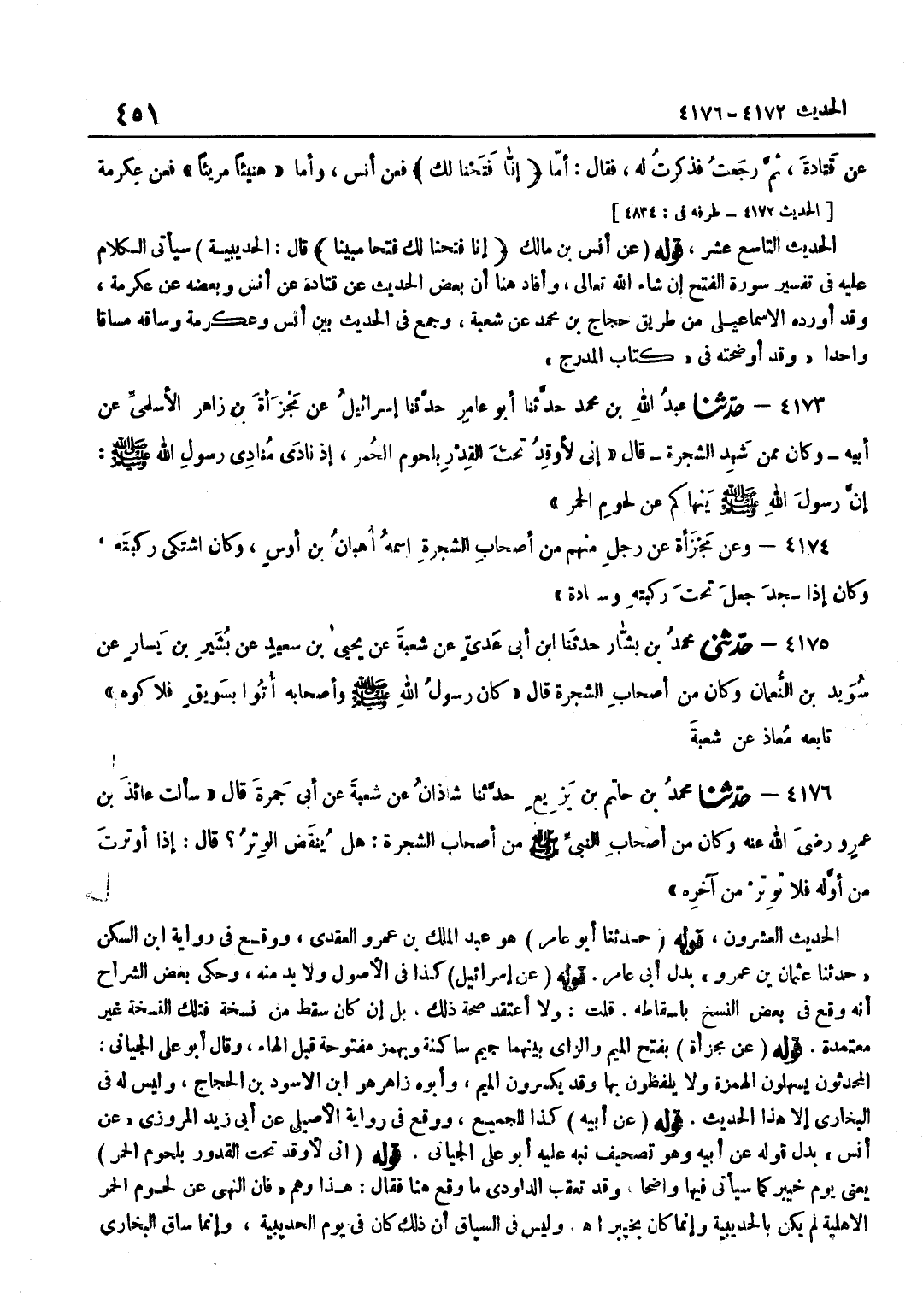 [4172] قَوْلُهُ عَنْ أَنَسِ بْنِ مَالك إِنَّا فتحنا لَك فتحا مُبينًا قَالَ الْحُدَيْبِيَةُ سَيَأْتِي الْكَلَامُ عَلَيْهِ فِي تَفْسِيرِ سُورَةِ الْفَتْحِ إِنْ شَاءَ اللَّهُ تَعَالَى وَأَفَادَ هُنَا أَنَّ بَعْضَ الْحَدِيثِ عَنْ قَتَادَةَ عَنْ أَنَسٍ وَبَعْضَهُ عَنْ عِكْرِمَةَ وَقَدْ أَوْرَدَهُ الْإِسْمَاعِيلِيِّ مِنْ طَرِيقِ حَجَّاجِ بْنِ مُحَمَّدٍ عَنْ شُعْبَةَ وَجَمَعَ فِي الْحَدِيثِ بَيْنَ أَنَسٍ وَعِكْرِمَةَ وَسَاقَهُ مَسَاقًا وَاحِدًا وَقَدْ أَوْضَحْتُهُ فِي كِتَابِ الْمُدْرَجِ