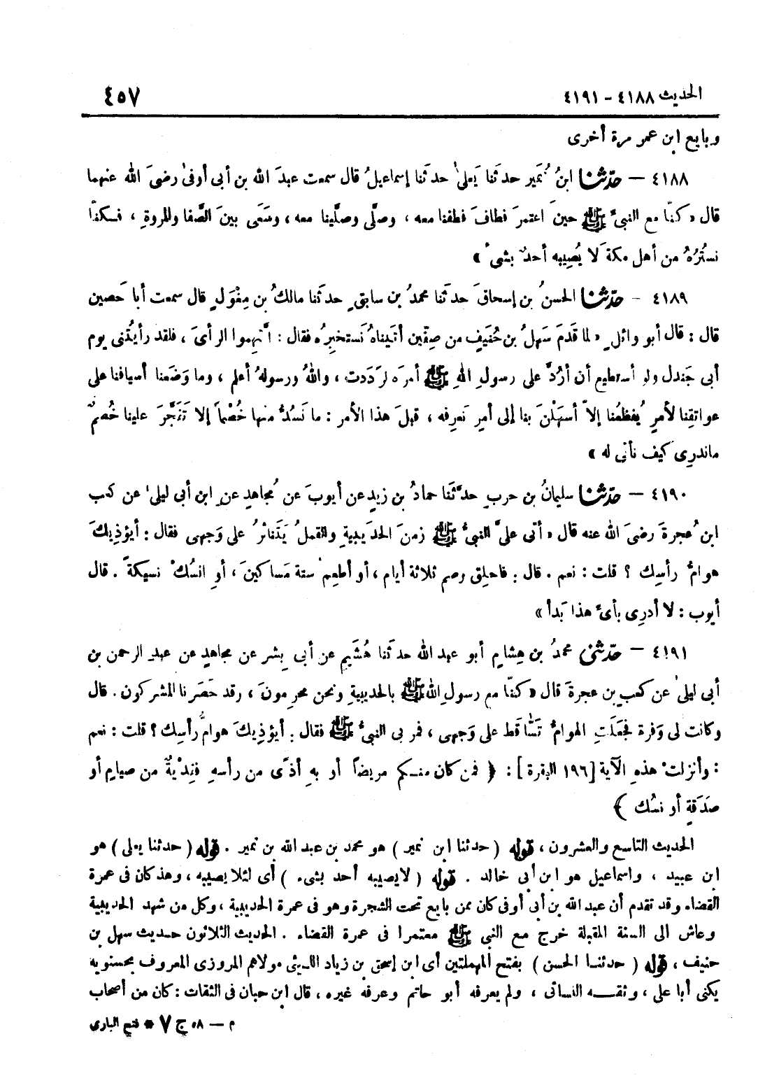 [4188] قَوْله حَدثنَا بن نُمَيْرٍ هُوَ مُحَمَّدُ بْنُ عَبْدِ اللَّهِ بْنِ نمير قَوْله حَدثنَا يعلى هُوَ بن عبيد وَإِسْمَاعِيل هُوَ بن أَبِي خَالِدٍ قَوْلُهُ لَا يُصِيبُهُ أَحَدٌ بِشَيْءٍ أَيْ لِئَلَّا يُصِيبَهُ وَهَذَا كَانَ فِي عُمْرَةِ الْقَضَاءِ وَقَدْ تَقَدَّمَ أَنَّ عَبْدَ اللَّهِ بْنَ أَبِي أَوْفَى كَانَ مِمَّنْ بَايَعَ تَحْتَ الشَّجَرَةِ وَهُوَ فِي عُمْرَةِ الْحُدَيْبِيَةِ وَكُلُّ مَنْ شَهِدَ الْحُدَيْبِيَةَ وَعَاشَ إِلَى السَّنَةِ الْمُقْبِلَةِ خَرَجَ مَعَ النَّبِيِّ صَلَّى اللَّهُ عَلَيْهِ وَسَلَّمَ مُعْتَمِرًا فِي عمْرَة الْقَضَاء الحَدِيث الثَّلَاثُونَ حَدِيث سهل بن حنيف